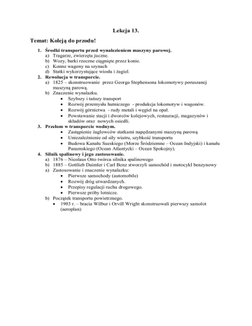 Lekcja 13. Temat: Koleją do przodu! 1. Środki transportu przed wynalezieniem maszyny parowej. a) Tragarze, zwierzęta juczne. b) Wozy, barki rzeczne ciągnięte przez konie. c) Konne wagony na szynach d) Statki wykorzystujące wiosła i żagiel. 2. Rewolucja w transporcie. a) 1825 – skonstruowanie przez Georga Stephensona lokomotywy poruszanej maszyną parową. b) Znaczenie wynalazku. Szybszy i tańszy transport Rozwój przemysłu hutniczego - produkcja lokomotyw i wagonów. Rozwój górnictwa - rudy metali i węgiel na opał. Powstawanie stacji i dworców kolejowych, restauracji, magazynów i składów oraz nowych osiedli. 3. Przełom w transporcie wodnym. Zastąpienie żaglowców statkami napędzanymi maszyną parową Uniezależnienie od siły wiatru, szybkość transportu Budowa Kanału Sueskiego (Morze Śródziemne – Ocean Indyjski) i kanału Panamskiego (Ocean Atlantycki – Ocean Spokojny). 4. Silnik spalinowy i jego zastosowanie. a) 1876 – Nicolaus Otto twórca silnika spalinowego b) 1885 – Gottlieb Daimler i Carl Benz stworzyli samochód i motocykl benzynowy a) Zastosowanie i znaczenie wynalazku: Pierwsze samochody (automobile) Rozwój dróg utwardzanych. Przepisy regulacji ruchu drogowego. Pierwsze próby lotnicze. b) Początek transportu powietrznego. 1903 r. – bracia Wilbur i Orvill Wright skonstruowali pierwszy samolot (aeroplan)