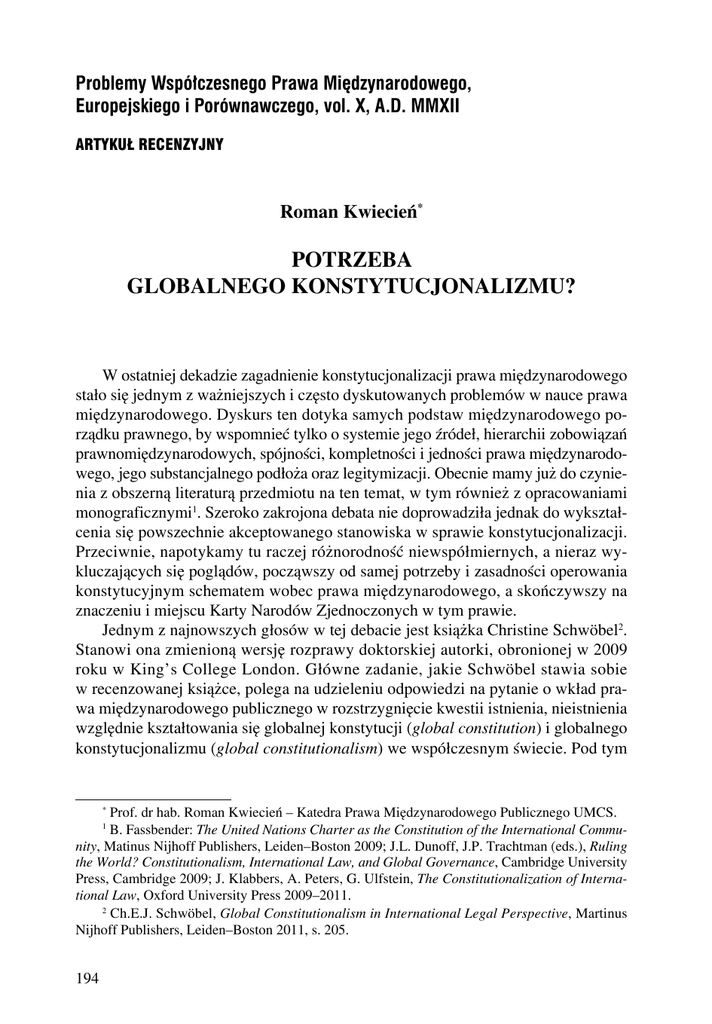 Problemy Współczesnego Prawa Międzynarodowego, Europejskiego i Porównawczego, vol. X, A.D. MMXII ARTYKUŁ RECENZYJNY Roman Kwiecień* POTRZEBA GLOBALNEGO KONSTYTUCJONALIZMU? W ostatniej dekadzie zagadnienie konstytucjonalizacji prawa międzynarodowego stało się jednym z ważniejszych i często dyskutowanych problemów w nauce prawa międzynarodowego. Dyskurs ten dotyka samych podstaw międzynarodowego porządku prawnego, by wspomnieć tylko o systemie jego źródeł, hierarchii zobowiązań prawnomiędzynarodowych, spójności, kompletności i jedności prawa międzynarodowego, jego substancjalnego podłoża oraz legitymizacji. Obecnie mamy już do czynienia z obszerną literaturą przedmiotu na ten temat, w tym również z opracowaniami monograficznymi1. Szeroko zakrojona debata nie doprowadziła jednak do wykształcenia się powszechnie akceptowanego stanowiska w sprawie konstytucjonalizacji. Przeciwnie, napotykamy tu raczej różnorodność niewspółmiernych, a nieraz wykluczających się poglądów, począwszy od samej potrzeby i zasadności operowania konstytucyjnym schematem wobec prawa międzynarodowego, a skończywszy na znaczeniu i miejscu Karty Narodów Zjednoczonych w tym prawie. Jednym z najnowszych głosów w tej debacie jest książka Christine Schwöbel2. Stanowi ona zmienioną wersję rozprawy doktorskiej autorki, obronionej w 2009 roku w King’s College London. Główne zadanie, jakie Schwöbel stawia sobie w recenzowanej książce, polega na udzieleniu odpowiedzi na pytanie o wkład prawa międzynarodowego publicznego w rozstrzygnięcie kwestii istnienia, nieistnienia względnie kształtowania się globalnej konstytucji (global constitution) i globalnego konstytucjonalizmu (global constitutionalism) we współczesnym świecie. Pod tym Prof. dr hab. Roman Kwiecień – Katedra Prawa Międzynarodowego Publicznego UMCS. B. Fassbender: The United Nations Charter as the Constitution of the International Community, Matinus Nijhoff Publishers, Leiden–Boston 2009; J.L. Dunoff, J.P. Trachtman (eds.), Ruling the World? Constitutionalism, International Law, and Global Governance, Cambridge University Press, Cambridge 2009; J. Klabbers, A. Peters, G. Ulfstein, The Constitutionalization of International Law, Oxford University Press 2009–2011. 2 Ch.E.J. Schwöbel, Global Constitutionalism in International Legal Perspective, Martinus Nijhoff Publishers, Leiden–Boston 2011, s. 205. * 1 194 pojęciem autorka wstępnie rozumie „uniwersalny system pewnych społecznych, politycznych, kulturowych, ekonomicznych i prawnych idei” (s. 2). Książka Ch. Schwöbel składa się z pięciu rozdziałów. W rozdziale pierwszym zatytułowanym Wymiary globalnego konstytucjonalizmu w prawie międzynarodowym publicznym autorka usiłuje zidentyfikować i skategoryzować trendy we współczesnej debacie poświęconej konstytucjonalizacji prawa międzynarodowego. Zwraca w nim uwagę na różnice między czterema podstawowymi, jej zdaniem, wymiarami międzynarodowego konstytucjonalizmu. Kategoryzuje je jako konstytucjonalizm społeczny (social constitutionalism), konstytucjonalizm instytucjonalny (institutional constitutionalism), konstytucjonalizm normatywny (normative constitutionalism) i konstytucjonalizm analogiczny (analogical constitutionalism). Mianem konstytucjonalizmu społecznego autorka określa poglądy przedstawiające prawo międzynarodowe jako prawo oparte na ideale koegzystencji. Konstytucjonalizm instytucjonalny skupia się zdaniem autorki na sposobach podziału władzy wśród instytucji międzynarodowych. Normatywny wymiar konstytucjonalizmu wskazuje z kolei na potrzebę istnienia pewnego wspólnego systemu wartości w prawie międzynarodowym. I w końcu analogiczny konstytucjonalizm międzynarodowy formułuje wizję globalnego konstytucjonalizmu opartego na już istniejących wzorcach konstytucyjnych, to znaczy na międzynarodowych metaregułach, krajowych porządkach konstytucyjnych i zrębach konstytucjonalizmu Unii Europejskiej. W rozdziale drugim (Historyczna analiza kluczowych zagadnień globalnego konstytucjonalizmu) autorka daje historyczny rys węzłowych problemów konstytucjonalizmu. Ch. Schwöbel wyróżnia pięć takich kluczowych zagadnień: 1) ograniczenie wykonywania władzy, którego początków upatruje w starożytnym ideale prawa naturalnego i uniwersalizmu; 2) instytucjonalizacja władzy, której genezę wiąże z filozofią polityczną Arystotelesa; 3) społeczny idealizm ugruntowany, jej zdaniem, już w starożytnej Grecji; 4) zdolność ustanawiania trwałych prawnych wzorców zachowań wykształcona w prawie rzymskim oraz 5) zinstytucjonalizowana ochrona praw podstawowych, której początków autorka doszukuje się w XVI wieku. W rozdziale trzecim Ch. Schwöbel szeroko analizuje zarzuty stawiane prawu międzynarodowemu w zakresie jego zdolności do wspierania globalnego konstytucjonalizmu. W szczególności daje w nim krytyczną analizę pięciu kluczowych elementów globalnego konstytucjonalizmu wyszczególnionych w rozdziale drugim. Główna teza tego rozdziału podkreśla ograniczoność tych kluczowych elementów z powodu ich zakorzenienia w jednej tradycji polityczno-prawnej, to znaczy tradycji wykształconej w zachodniej liberalnej kulturze prawnej. To dlatego ideał globalnego konstytucjonalizmu może być zdaniem autorki postrzegany jako „manifestacja ethosu liberalnej demokracji w prawie międzynarodowym” (s. 130). Nie szczędzi wobec tego krytyki ideałowi jedności sfery międzynarodowej budowanej w oparciu o globalny konstytucjonalizm ufundowany na jednej, tj. europejskiej, zwłaszcza niemieckiej, kulturze prawnej. Takie podejście, zdaniem autorki, wyklucza pluralizm 195 w sferze międzynarodowej i niesie ze sobą ryzyko normatywnego hegemonializmu. Jednocześnie Ch. Schwöbel zwraca uwagę na inne niebezpieczeństwo. Zauważa mianowicie, że ideał konstytucjonalizmu poza państwem pozostaje zagrożony pozbawieniem go autonomiczno