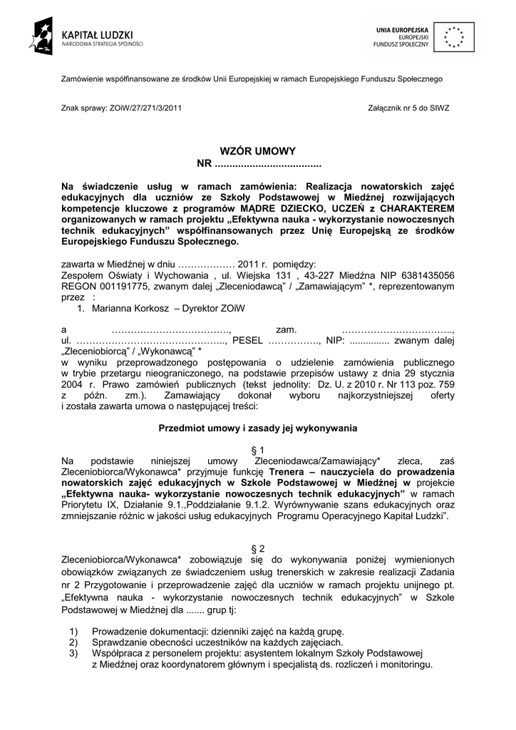 Zamówienie współfinansowane ze środków Unii Europejskiej w ramach Europejskiego Funduszu Społecznego Znak sprawy: ZOiW/27/271/3/2011 Załącznik nr 5 do SIWZ WZÓR UMOWY NR ..................................... Na świadczenie usług w ramach zamówienia: Realizacja nowatorskich zajęć edukacyjnych dla uczniów ze Szkoły Podstawowej w Miedźnej rozwijających kompetencje kluczowe z programów MĄDRE DZIECKO, UCZEŃ z CHARAKTEREM organizowanych w ramach projektu „Efektywna nauka - wykorzystanie nowoczesnych technik edukacyjnych” współfinansowanych przez Unię Europejską ze środków Europejskiego Funduszu Społecznego. zawarta w Miedźnej w dniu ……………… 2011 r. pomiędzy: Zespołem Oświaty i Wychowania , ul. Wiejska 131 , 43-227 Miedźna NIP 6381435056 REGON 001191775, zwanym dalej „Zleceniodawcą” / „Zamawiającym” *, reprezentowanym przez : 1. Marianna Korkosz – Dyrektor ZOiW a ………………………………., zam. …………………………….., ul. ……………………………………….., PESEL ……………., NIP: ............... zwanym dalej „Zleceniobiorcą” / „Wykonawcą” * w wyniku przeprowadzonego postępowania o udzielenie zamówienia publicznego w trybie przetargu nieograniczonego, na podstawie przepisów ustawy z dnia 29 stycznia 2004 r. Prawo zamówień publicznych (tekst jednolity: Dz. U. z 2010 r. Nr 113 poz. 759 z późn. zm.). Zamawiający dokonał wyboru najkorzystniejszej oferty i została zawarta umowa o następującej treści: Przedmiot umowy i zasady jej wykonywania §1 Na podstawie niniejszej umowy Zleceniodawca/Zamawiający* zleca, zaś Zleceniobiorca/Wykonawca* przyjmuje funkcję Trenera – nauczyciela do prowadzenia nowatorskich zajęć edukacyjnych w Szkole Podstawowej w Miedźnej w projekcie „Efektywna nauka- wykorzystanie nowoczesnych technik edukacyjnych” w ramach Priorytetu IX, Działanie 9.1.,Poddziałanie 9.1.2. Wyrównywanie szans edukacyjnych oraz zmniejszanie róŜnic w jakości usług edukacyjnych Programu Operacyjnego Kapitał Ludzki”. §2 Zleceniobiorca/Wykonawca* zobowiązuje się do wykonywania poniŜej wymienionych obowiązków związanych ze świadczeniem usług trenerskich w zakresie realizacji Zadania nr 2 Przygotowanie i przeprowadzenie zajęć dla uczniów w ramach projektu unijnego pt. „Efektywna nauka - wykorzystanie nowoczesnych technik edukacyjnych” w Szkole Podstawowej w Miedźnej dla ....... grup tj: 1) 2) 3) Prowadzenie dokumentacji: dzienniki zajęć na kaŜdą grupę. Sprawdzanie obecności uczestników na kaŜdych zajęciach. Współpraca z personelem projektu: asystentem lokalnym Szkoły Podstawowej z Miedźnej oraz koordynatorem głównym i specjalistą ds. rozliczeń i monitoringu. 4) 5) 6) 7) 8) 9) 10) 11) 12) 13) 14) 15) Informowanie uczestników zajęć organizowanych w SP Miedźna w ramach projektu o ich współfinansowaniu ze środków Unii Europejskiej w ramach Europejskiego Funduszu Społecznego. Odpowiedzialność za prawidłowy przebieg zajęć edukacyjnych z projektu w szkole Podstawowej w Miedźnej. Przestrzeganie harmonogramu realizacji zajęć ustalonych przez asystenta lokalnego Szkoły Podstawowej w Miedźnej. Wypełnianie kart czasu pracy oraz rachunków za dany okres rozliczeniowy (maksymalnie 2 miesięczny) zgodnie ze wzorami otrzymanymi z ZOiW Miedźna. Przygotowywanie materiałów do zajęć dla uczestników oraz Sali do przeprowadzenia zajęć. Prowadzenie zajęć zgodnie z konspektami zawartymi w podręcznikach dla trenerów do programów edukacyjnych Mądre Dziecko lub Uczeń z Charakterem, otrzymanych na szkoleniach. Korzystanie z „Platformy e-learningowej” w trakcie prowadzenia zajęć z uczniami. Przeprowadzanie wśród uczestników projektu ankiet ewaluacyjnych i monitorujących ich wyniki w trakcie trwania zajęć, zgodnie ze wzorami otrzymywanymi z ZOiW. Uczestnictwo w spotkaniach z opiekunem metodycznym oraz asystentem lokalnym dla SP Miedźna. Uruchomienie platformy e-learningowej dla kaŜdego uczestnika projektu z danej grupy oraz dokładne wytłumaczenie uczniom zasad obsługi i korzystania z platformy. Monitorowanie ilości czasu jaki poświęcają uczestnicy projektu na trening czytania na „Platformie e-learningowej” oraz analiza osiąganych wyników kaŜdego ucznia podczas korzystania z panelu elektronicznego „Platformy e-learningowej”. Przeprowadzenie na zajęciach z uczestnikami projektu pomiaru tempa czytania za pomocą dowolnie wybranego narzędzia badawczego np. pytania ankietowe, test itp. w następującym czasie: - pierwszy pomiar: listopad 2011 rok - drugi pomiar: marzec 2012 rok - trzeci pomiar: maj - czerwiec 2012 rok §3 Zleceniobiorca/Wykonawca* zobowiązuje się do ścisłej współpracy z Dyrektorem ZOiW w Miedźnej, Koordynatorem projektu oraz Asystentem lokalnym dla SP Miedźna. §4 1. Zlecenie stanowiące przedmiot niniejszej umowy Zleceniobiorca/Wykonawca* wykona w terminie od dnia podpisania umowy do dnia 30.06.2012 r. 2. Miejsce wykonania umowy: sale lekcyjne w Szkole Podstawowej w Miedźnej lub inne wskazane przez Zleceniodawcę/Zamawiającego.* 3. Zleceniodawca/Zamawiający* w okresie realizacji niniejszej umowy zapewni Zleceniobiorcy/Wykonawcy* dostęp do dokumentacji związanej z realizowanym projektem oraz do materiałów dydaktycznych, odczynników i innych pomocy naukowych do prowadzenia zajęć w terminie i miejscu wskazanym w § 4 ust. 1, 2. 4. Zleceniobiorca/Wykonawca* wykonywać będzie obowiązki o których mowa w § 2 w terminie oraz czasie ustalonym indywidualnie przez strony w okresie o którym mowa w § 4 ust. 1. 5. Wymiar czasu pracy niezbędny na wykonanie obowiązków o którym mowa w § 2 związanych z realizacją projektu, jaki został wskazany przez Zleceniobiorcę/Wykonawcę* w formularzu ofertowym do Specyfikacji Istotnych Warunków Zamówienia na Realizację nowatorskich zajęć edukacyjnych dla uczniów ze Szkoły Podstawowej w Miedźnej rozwijających kompeten