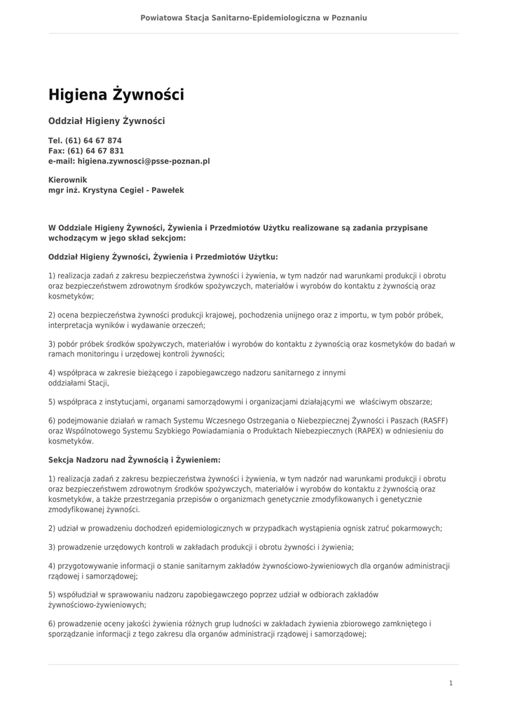Powiatowa Stacja Sanitarno-Epidemiologiczna w Poznaniu Higiena Żywności Oddział Higieny Żywności Tel. (61) 64 67 874 Fax: (61) 64 67 831 e-mail: [email protected] Kierownik mgr inż. Krystyna Cegiel - Pawełek W Oddziale Higieny Żywności, Żywienia i Przedmiotów Użytku realizowane są zadania przypisane wchodzącym w jego skład sekcjom: Oddział Higieny Żywności, Żywienia i Przedmiotów Użytku: 1) realizacja zadań z zakresu bezpieczeństwa żywności i żywienia, w tym nadzór nad warunkami produkcji i obrotu oraz bezpieczeństwem zdrowotnym środków spożywczych, materiałów i wyrobów do kontaktu z żywnością oraz kosmetyków; 2) ocena bezpieczeństwa żywności produkcji krajowej, pochodzenia unijnego oraz z importu, w tym pobór próbek, interpretacja wyników i wydawanie orzeczeń; 3) pobór próbek środków spożywczych, materiałów i wyrobów do kontaktu z żywnością oraz kosmetyków do badań w ramach monitoringu i urzędowej kontroli żywności; 4) współpraca w zakresie bieżącego i zapobiegawczego nadzoru sanitarnego z innymi oddziałami Stacji, 5) współpraca z instytucjami, organami samorządowymi i organizacjami działającymi we właściwym obszarze; 6) podejmowanie działań w ramach Systemu Wczesnego Ostrzegania o Niebezpiecznej Żywności i Paszach (RASFF) oraz Wspólnotowego Systemu Szybkiego Powiadamiania o Produktach Niebezpiecznych (RAPEX) w odniesieniu do kosmetyków. Sekcja Nadzoru nad Żywnością i Żywieniem: 1) realizacja zadań z zakresu bezpieczeństwa żywności i żywienia, w tym nadzór nad warunkami produkcji i obrotu oraz bezpieczeństwem zdrowotnym środków spożywczych, materiałów i wyrobów do kontaktu z żywnością oraz kosmetyków, a także przestrzegania przepisów o organizmach genetycznie zmodyfikowanych i genetycznie zmodyfikowanej żywności. 2) udział w prowadzeniu dochodzeń epidemiologicznych w przypadkach wystąpienia ognisk zatruć pokarmowych; 3) prowadzenie urzędowych kontroli w zakładach produkcji i obrotu żywności i żywienia; 4) przygotowywanie informacji o stanie sanitarnym zakładów żywnościowo-żywieniowych dla organów administracji rządowej i samorządowej; 5) współudział w sprawowaniu nadzoru zapobiegawczego poprzez udział w odbiorach zakładów żywnościowo-żywieniowych; 6) prowadzenie oceny jakości żywienia różnych grup ludności w zakładach żywienia zbiorowego zamkniętego i sporządzanie informacji z tego zakresu dla organów administracji rządowej i samorządowej; 1 Powiatowa Stacja Sanitarno-Epidemiologiczna w Poznaniu 7) prowadzenie i uaktualnianie elektronicznej bazy danych dotyczącej zakładów żywnościowo – żywieniowych; Sekcja Nadzoru nad Importem oraz Przedmiotami Użytku : 1) prowadzenie urzędowych kontroli w zakładach produkcji i obrotu materiałów i wyrobów do kontaktu z żywnością oraz zakładach produkcji kosmetyków; 2) nadzór nad przestrzeganiem przepisów dotyczących kosmetyków w zakresie warunków produkcji, znakowania oraz posiadanej dokumentacji; 3) współudział w sprawowaniu nadzoru zapobiegawczego poprzez udział w odbiorach zakładów produkujących lub wprowadzających do obrotu materiały i wyroby przeznaczone do kontaktu z żywnością; 4) sprawdzanie realizacji zasad dobrej praktyki higienicznej (GHP), dobrej praktyki produkcyjnej (GMP) oraz systemu analizy zagrożeń i krytycznych punktów kontroli (HACCP) w obiektach produkcji materiałów i wyrobów przeznaczonych do kontaktu z żywnością; 5) wydawanie świadectw spełnienia wymagań zdrowotnych przez środki spożywcze, materiały lub wyroby przeznaczone do kontaktu z żywnością przekraczające granicę; 6) wystawianie świadectw o przydatności do produkcji substancji pomagających w przetwarzaniu; 7) redagowanie strony internetowej Powiatowej Stacji w ramach zadań realizowanych przez oddział. 2
