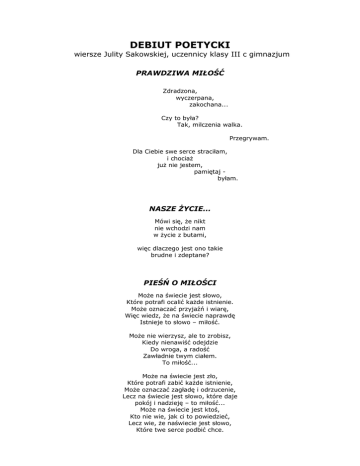 DEBIUT POETYCKI wiersze Julity Sakowskiej, uczennicy klasy III c gimnazjum PRAWDZIWA MIŁOŚĆ Zdradzona, wyczerpana, zakochana... Czy to była? Tak, milczenia walka. Przegrywam. Dla Ciebie swe serce straciłam, i chociaż już nie jestem, pamiętaj byłam. NASZE ŻYCIE... Mówi się, że nikt nie wchodzi nam w życie z butami, więc dlaczego jest ono takie brudne i zdeptane? PIEŚŃ O MIŁOŚCI Może na świecie jest słowo, Które potrafi ocalić każde istnienie. Może oznaczać przyjaźń i wiarę, Więc wiedz, że na świecie naprawdę Istnieje to słowo – miłość. Może nie wierzysz, ale to zrobisz, Kiedy nienawiść odejdzie Do wroga, a radość Zawładnie twym ciałem. To miłość... Może na świecie jest zło, Które potrafi zabić każde istnienie, Może oznaczać zagładę i odrzucenie, Lecz na świecie jest słowo, które daje pokój i nadzieję – to miłość... Może na świecie jest ktoś, Kto nie wie, jak ci to powiedzieć, Lecz wie, że naświecie jest słowo, Które twe serce podbić chce. To miłość... Strofy by można tworzyć bez wytchnienia, Więc zapamiętaj, że na świecie jest słowo, które potrafi ocalić od zapomnienia. PODZIEMNY ŚLUB W OBŁOKACH Stałam i widziałam to co tu namalowałam (to prawda nie fikcja, że ludzi pełnych miłości uskrzydla pyłem anioł) nad stawami i domami płynęli ku sobie wśród bezchmurnych obłoków marząc o sobie. Stałam i widziałam, To co tu namalowałam, Lecz nie prawdą jest to , Co mówi jegomość miłość Bo marzenia są zawsze Cierpieniem i bólem, Choć do uleczenia, Lecz nie dla duszy, Która kocha nie tego, Co trzeba ... I płynęli tak sobie, Wśród bezchmurnych obłoków W ślubnych szatach Hadesu. DLA M… W zeszytach nie marginesów jest tylko czysta kartka oraz miejsce na nie które zostanie zapełnione tuszem - tak jak w życiu nie ma miejsca na przerwę jest tylko czas aby ciągle gnać do przodu bo bilet ważny jest tylko w jedną stronę ŚWIECA TO MY Czy życie to chwila, która zaraz minie? A może to tylko czas palącej się świecy, która zaraz zgaśnie. POEZJI NIE PYTAJ W poezji nie szukaj odpowiedzi nie grzeb wśród liter poezji nie pytaj o drogę poezja to ja Poezja to prawda ukryta w zagadce poezja to kwiat który rozkwita więc czemu w nim nie szukasz odpowiedzi STRATA Gdy je miałam, myślałam - pomogą mi. Lecz gdy dni szare nadeszły i błyskawice straszyć zaczęły, a strach szerzył swe granice, usłyszałam słowa gorsze od piorunów i błyskawic, od dni szarych i strasznych. Łudziłaś się, więc rób to dalej, bo los nie wszystkich kocha. A słowa straszniejszymi się stały im dalej płynęły, bo z duszy pustej człowieka niekochanego płynęły, były nieszczere i straszne, bo złem przepełnione i od bliskiej osoby dane.