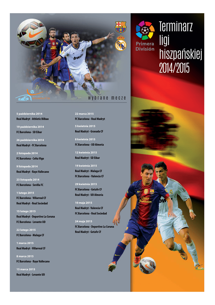 Terminarz ligi hiszpańskiej 2014/2015 wybrane mecze 5 października 2014 22 marca 2015 Real Madryt - Athletic Bilbao FC Barcelona - Real Madryt 19 października 2014 5 kwietnia 2015 FC Barcelona - SD Eibar Real Madryt - Granada CF 26 października 2014 8 kwietnia 2015 Real Madryt - FC Barcelona FC Barcelona - UD Almeria 2 listopada 2014 12 kwietnia 2015 FC Barcelona - Celta Vigo Real Madryt - SD Eibar 9 listopada 2014 19 kwietnia 2015 Real Madryt - Rayo Vallecano Real Madryt - Malaga CF FC Barcelona - Valencia CF 23 listopada 2014 FC Barcelona - Sevilla FC 29 kwietnia 2015 FC Barcelona - Getafe CF 1 lutego 2015 Real Madryt - UD Almeria FC Barcelona - Villarreal CF Real Madryt - Real Sociedad 10 maja 2015 Real Madryt - Valencia CF 15 lutego 2015 FC Barcelona - Real Sociedad Real Madryt - Deportivo La Coruna FC Barcelona - Levante UD 24 maja 2015 FC Barcelona - Deportivo La Coruna 22 lutego 2015 FC Barcelona - Malaga CF 1 marca 2015 Real Madryt - Villarreal CF 8 marca 2015 FC Barcelona - Rayo Vallecano 15 marca 2015 Real Madryt - Levante UD Real Madryt - Getafe CF