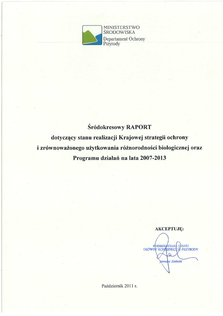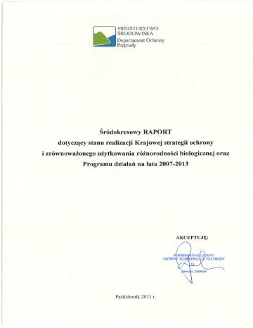 2 3 WSTĘP Zgodnie z art. 6 Konwencji o różnorodności biologicznej Strony Konwencji powinny opracować zgodnie ze swoimi szczególnymi warunkami i możliwościami krajowe strategie, plany lub programy dotyczące ochrony i zrównoważonego użytkowania różnorodności biologicznej. W Polsce Krajowa strategia ochrony i zrównoważonego użytkowania różnorodności biologicznej wraz z Programem Działań na lata 2007-2013 została zatwierdzona Uchwałą Rady Ministrów Nr 270/2007 z dnia 26 października 2007 r. Celem nadrzędnym Krajowej strategii jest zachowanie bogactwa różnorodności biologicznej w skali lokalnej, krajowej i globalnej oraz zapewnienie trwałości i możliwości rozwoju wszystkich poziomów jej organizacji (wewnątrzgatunkowego, międzygatunkowego i ponadgatunkowego) z uwzględnieniem potrzeb rozwoju społeczno-gospodarczego Polski oraz konieczności zapewnienia odpowiednich warunków życia i rozwoju społeczeństwa. Stworzenie warunków zapewniających zachowanie różnorodności biologicznej na wszystkich poziomach jej organizacji wymaga działań systemowych, przy aktywnym zaangażowaniu całego społeczeństwa. Dlatego też cel nadrzędny, cele strategiczne Strategii oraz zadania zawarte w Programie działań na lata 2007-2013 są końcowym rezultatem szerokiej dyskusji z przedstawicielami środowisk angażujących się na rzecz ochrony i zrównoważonego użytkowania różnorodności biologicznej lub ją wspierających (urzędy centralne, urzędy wojewódzkie, urzędy morskie, samorządy wojewódzkie, jednostki naukowo-badawcze, parki narodowe i krajobrazowe, Lasy Państwowe, regionalne zarządy gospodarki wodnej, ekologiczne organizacje pozarządowe i inne). Realizacja zadań zapisanych w Programie działań na lata 2007-2013 powinna być traktowana jako wypełnienie zobowiązań nałożonych przez Radę Ministrów. Ministerstwo Środowiska podjęło próbę analizy realizacji 134 zadań zapisanych ww. dokumencie. Nadzór nad wdrażaniem Krajowej strategii został powierzony Komitetowi Sterującemu, powołanemu Zarządzeniem Nr 19 Ministra Środowiska z dnia 8 kwietnia 2011 r. w sprawie powołania Komitetu Sterującego do spraw wdrażania Krajowej strategii ochrony i zrównoważonego użytkowania różnorodności biologicznej. W skład Komitetu Sterującego wchodzą przedstawiciele wszystkich podmiotów wskazanych w Programie działań jako odpowiedzialne za realizację poszczególnych zadań oraz przedstawiciele instytucji finansujących, jednostek naukowych i organizacji pozarządowych. DZIAŁ: ŚRODOWISKO (ochrona przyrody i krajobrazu) Zadanie nr 1: Przeprowadzenie inwentaryzacji i waloryzacji składników różnorodności biologicznej, w tym zwłaszcza w zakresie siedlisk przyrodniczych i gatunków chronionych na mocy Dyrektywy Ptasiej i Siedliskowej. Jednostka odpowiedzialna: Generalna Dyrekcja Ochrony Środowiska. Zadanie jest realizowane w sposób ciągły. Odpowiedzi uzyskano z: 19 parków narodowych, 11 RDOŚ, 3 zespołów parków krajobrazowych, Urzędu Marszałkowskiego Województwa Zachodniopomorskiego, DGLP, Zakładu Badania Ssaków PAN, Instytutu Botaniki PAN, Instytutu Oceanologii PAN, Centrum Dziedzictwa Przyrodniczego Górnego Śląska, 3 urzędów morskich, GDOŚ, IBL, OTOP. Inwentaryzacją objęte zostały przede wszystkim siedliska przyrodnicze i gatunki określone w załącznikach Dyrektywy Ptasiej oraz Dyrektywy Siedliskowej UE, w tym gatunki i siedliska przyrodnicze, dla których zgodnie z konkluzjami Seminarium Biogeograficznego, Polska ma przeprowadzić badania naukowe. Ponadto prowadzone prace dotyczą gatunków zagrożonych, kluczowych i konfliktowych. Od 2010 r. na zlecenie GDOŚ trwają prace nad przeprowadzeniem inwentaryzacji ornitologicznej dla obszarów specjalnej ochrony ptaków Natura 2000. Obecnie dla 18 obszarów prace inwentaryzacyjne zostały zakończone, a realizacja inwentaryzacji ornitologicznej kolejnych 35 obszarów zakończy się do końca I kwartału 2012 r. Planowane jest również zlecenie wykonania inwentaryzacji ornitologicznej dla dalszych 14 obszarów specjalnej ochrony ptaków Natura 2000. Przeszkodą w realizacji zadania jest niedostateczna ilość środków finansowych oraz długotrwała i skomplikowana procedura do ich pozyskania (dotyczy CKPŚ), a także brak informacji o możliwości 4 dalszego finansowania ze środków UE (np. zapewnienie udziału własnego) oraz mała liczba ekspertów w porównaniu do wielkości terenu i potrzeb. Występowały także problemy z rozstrzygnięciem przetargów oraz renegocjacją umów z wykonawcami po wprowadzeniu 23% podatku od towarów i usług VAT (styczeń 2011 r.). Zadanie nr 2: Weryfikacja krajowych list gatunków chronionych. Jednostka odpowiedzialna: Generalna Dyrekcja Ochrony Środowiska. Zadanie jest w trakcie realizacji, zakończenie planuje się do końca 2011 r. Odpowiedzi uzyskano z: 4 parków narodowych, RDOŚ w Krakowie, DGLP, Instytutu Botaniki PAN, GDOŚ, IBL. Po weryfikacji krajowych list gatunków chronionych, zostaną znowelizowane rozporządzenia o ochronie gatunkowej roślin, zwierząt i grzybów. Zadanie nr 3: Przygotowywanie i upowszechnianie zaktualizowanych krajowych czerwonych ksiąg i czerwonych list siedlisk i gatunków zagrożonych wyginięciem. Jednostka odpowiedzialna: Generalna Dyrekcja Ochrony Środowiska. Zadanie jest realizowane w sposób ciągły. Odpowiedzi uzyskano z: IOŚ, Pienińskiego PN i Ojcowskiego PN, Instytutu Botaniki PAN, IBL. Opracowano Czerwoną Listę obszarów wodno-błotnych w Polsce. Zadanie nr 4: Przygotowywanie i upowszechnianie regionalnych czerwonych ksiąg i czerwonych list siedlisk i gatunków zagrożonych wyginięciem. Jednostka odpowiedzialna: Generalna Dyrekcja Ochrony Środowiska. Zadanie jest realizowane w sposób ciągły. Odpowiedzi uzyskano z: 3 parków narodowych, Instytutu Botaniki PAN, 3 RDOŚ i Centrum Dziedzictwa Przyrodniczego Górnego Śląska. Opracowano Czerwoną Księgę Karpat Polskich,