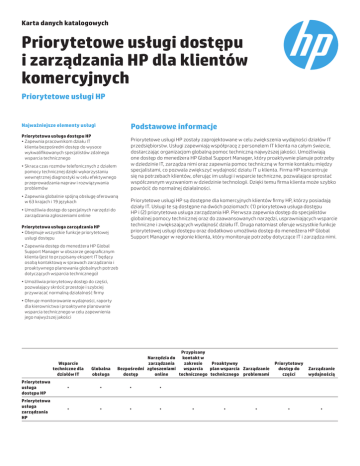 Karta danych katalogowych Priorytetowe usługi dostępu i zarządzania HP dla klientów komercyjnych Priorytetowe usługi HP Podstawowe informacje Najważniejsze elementy usługi Priorytetowa usługa dostępu HP •Zapewnia pracownikom działu IT klienta bezpośredni dostęp do wysoce wykwalifikowanych specjalistów zdalnego wsparcia technicznego Priorytetowe usługi HP zostały zaprojektowane w celu zwiększenia wydajności działów IT przedsiębiorstw. Usługi zapewniają współpracę z personelem IT klienta na całym świecie, dostarczając organizacjom globalną pomoc techniczną najwyższej jakości. Umożliwiają one dostęp do menedżera HP Global Support Manager, który proaktywnie planuje potrzeby w dziedzinie IT, zarządza nimi oraz zapewnia pomoc techniczną w formie kontaktu między specjalistami, co pozwala zwiększyć wydajność działu IT u klienta. Firma HP koncentruje się na potrzebach klientów, oferując im usługi i wsparcie techniczne, pozwalające sprostać współczesnym wyzwaniom w dziedzinie technologii. Dzięki temu firma klienta może szybko powrócić do normalnej działalności. •Skraca czas rozmów telefonicznych z działem pomocy technicznej dzięki wykorzystaniu wewnętrznej diagnostyki w celu efektywnego przeprowadzania napraw i rozwiązywania problemów •Zapewnia globalnie spójną obsługę oferowaną w 63 krajach i 19 językach •Umożliwia dostęp do specjalnych narzędzi do zarządzania zgłoszeniami online Priorytetowa usługa zarządzania HP •Obejmuje wszystkie funkcje priorytetowej usługi dostępu Priorytetowe usługi HP są dostępne dla komercyjnych klientów firmy HP, którzy posiadają działy IT. Usługi te są dostępne na dwóch poziomach: (1) priorytetowa usługa dostępu HP i (2) priorytetowa usługa zarządzania HP. Pierwsza zapewnia dostęp do specjalistów globalnej pomocy technicznej oraz do zaawansowanych narzędzi, usprawniających wsparcie techniczne i zwiększających wydajność działu IT. Druga natomiast oferuje wszystkie funkcje priorytetowej usługi dostępu oraz dodatkowo umożliwia dostęp do menedżera HP Global Support Manager w regionie klienta, który monitoruje potrzeby dotyczące IT i zarządza nimi. •Zapewnia dostęp do menedżera HP Global Support Manager w obszarze geograficznym klienta (jest to przypisany ekspert IT będący osobą kontaktową w sprawach zarządzania i proaktywnego planowania globalnych potrzeb dotyczących wsparcia technicznego) •Umożliwia priorytetowy dostęp do części, pozwalający skrócić przestoje i szybciej przywracać normalną działalność firmy •Oferuje monitorowanie wydajności, raporty dla kierownictwa i proaktywne planowanie wsparcia technicznego w celu zapewnienia jego najwyższej jakości Przypisany Narzędzia do kontakt w zarządzania zakresie Proaktywny Bezpośredni zgłoszeniami wsparcia plan wsparcia Zarządzanie dostęp online technicznego technicznego problemami Wsparcie techniczne dla działów IT Globalna obsługa Priorytetowa usługa dostępu HP • • • • Priorytetowa usługa zarządzania HP • • • • • • • Priorytetowy dostęp do części Zarządzanie wydajnością • • Karta danych katalogowych | Priorytetowe usługi dostępu i zarządzania HP dla klientów komercyjnych Specyfikacje Tabela 1. Elementy priorytetowej usługi dostępu HP Element Specyfikacje usługi Wsparcie techniczne dla działów IT W tym elemencie — przeznaczonym do obsługi informatyków, a nie użytkowników końcowych — wykorzystywana jest diagnoza klienta i są pomijane standardowe procedury rozwiązywania problemów, dzięki czemu można skrócić czas rozmów telefonicznych z działem wsparcia technicznego nawet o 30 procent w porównaniu ze standardową zdalną pomocą techniczną HP. Globalna obsługa Ten element zapewnia globalnie spójną obsługę oferowaną w 63 krajach i 19 językach. Informacje dotyczące poszczególnych krajów zawiera sekcja „Dostępność w poszczególnych regionach” (tabela 4). Bezpośredni dostęp Dział IT klienta uzyskuje priorytetowy dostęp do specjalnie wyszkolonych specjalistów wsparcia technicznego firmy HP za pośrednictwem bezpłatnego numeru telefonu i unikatowego numeru PIN. Narzędzia do zarządzania zgłoszeniami online Ten element obejmuje narzędzia wsparcia technicznego z funkcjami przesyłania zgłoszeń i śledzenia informacji przez Internet. Oprogramowanie HP Support Case Manager (SCM) zapewnia całodobowy dostęp przez siedem dni w tygodniu, umożliwiając klientom przesyłanie zgłoszeń i zarządzanie nimi online. Dodatkowe informacje o dostępie podano w informacjach wprowadzających do programu, które są wysyłane klientowi po zakupie. Tabela 2.Elementy priorytetowej usługi zarządzania HP Element Specyfikacje usługi Priorytetowy dostęp Ta usługa obejmuje wszystkie funkcje priorytetowej usługi dostępu. Przypisany kontakt w zakresie pomocy technicznej Klientowi jest przydzielany menedżer globalnego wsparcia technicznego HP (GCSM, Global Customer Support Manager) znajdujący się w regionie klienta, który jest odpowiedzialny za realizację globalnych potrzeb w zakresie pomocy technicznej. Menedżer GCSM to wysoce wykwalifikowany specjalista, który doskonale rozumie działalność biznesową klienta i jego strategiczne wymagania w dziedzinie IT. Znajduje się w tym samym regionie co centrala klienta, współpracuje z jego kierownictwem i podejmuje strategiczne decyzje dotyczące wsparcia technicznego. W przypadku problemów wymagających szczególnej uwagi menedżer GCSM pełni funkcję osoby kontaktowej klienta z firmą HP. Dzięki temu może on zarządzać specjalistami świadczącymi usługi firmy HP, tak aby szybko i skutecznie spełnić unikatowe wymagania klienta. Proaktywny plan wsparcia technicznego Menedżer HP we współpracy z klientem analizuje jego potrzeby biznesowe i strategiczne wymagania w dziedzinie IT, a następnie projektuje i implementuje plan proaktywnego wsparci