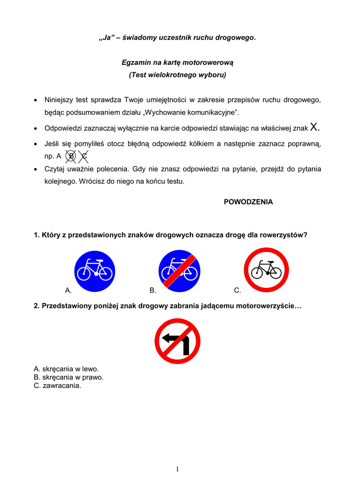 „Ja” – świadomy uczestnik ruchu drogowego. Egzamin na kartę motorowerową (Test wielokrotnego wyboru) Niniejszy test sprawdza Twoje umiejętności w zakresie przepisów ruchu drogowego, będąc podsumowaniem działu „Wychowanie komunikacyjne”. Odpowiedzi zaznaczaj wyłącznie na karcie odpowiedzi stawiając na właściwej znak X. Jeśli się pomyliłeś otocz błędną odpowiedź kółkiem a następnie zaznacz poprawną, np. A B C Czytaj uważnie polecenia. Gdy nie znasz odpowiedzi na pytanie, przejdź do pytania kolejnego. Wrócisz do niego na końcu testu. POWODZENIA 1. Który z przedstawionych znaków drogowych oznacza drogę dla rowerzystów? A. B. C. 2. Przedstawiony poniżej znak drogowy zabrania jadącemu motorowerzyście… A. skręcania w lewo. B. skręcania w prawo. C. zawracania. 1 3. Droga oznaczona takim znakiem jest przeznaczona… A. dla wszystkich pojazdów. B. tylko dla pojazdów samochodowych. C. tylko dla samochodów osobowych. 4. Znak ten oznacza: A. drogę jednokierunkową. B. nakaz jazdy prosto. C. drogę bez przejazdu. 5. Kartę motorowerową wydaje: A. dyrektor szkoły. B. nauczyciel wychowania komunikacyjnego. C. policja. 6. Uczestnikiem ruchu drogowego jest: A. kierujący pojazdem samochodowym. B. uczeń idący do szkoły. C. rowerzysta korzystający z drogi dla rowerów. 7. Pieszy idący poboczem lub jezdnią ma obowiązek iść: A. po prawej stronie drogi. B. po lewej stronie drogi. C. według własnego uznania ale musi korzystać z odblaskowego oznakowania, aby być widocznym na drodze. 8. Motorowerem jest: A. pojazd jednośladowy lub dwuśladowy. B. pojazd zaopatrzony w silnik spalinowy o pojemności skokowej do 50 cm3. C. pojazd zaopatrzony w silnik spalinowy o pojemności skokowej powyżej 50 cm 3. 9. Włączanie się do ruchu następuje: A. podczas ruszania po zmianie czerwonego sygnału świetlnego na zielony. B. przy wjeżdżaniu na jezdnię z parkingu. C. podczas ruszania po zatrzymaniu się w celu ustąpienia pierwszeństwa pieszemu. 2 10. Kierującemu motorowerem zabrania się: A. jazdy po jezdni obok innego uczestnika ruchu. B. jazdy po jezdni poza obszarem zabudowanym. C. jazdy bez trzymania co najmniej jednej ręki na kierownicy oraz nóg na podnóżkach. 11. W tej sytuacji kierujący pojazdem 1: 2 3 1 DROGA GRUNTOWA A. ma pierwszeństwo przed pojazdem 2. B. ma pierwszeństwo przed pojazdem 3. C. przejeżdża ostatni. 12. Na tym skrzyżowaniu kierujący pojazdem 1: 2 3 1 A. ma pierwszeństwo przed pojazdem 3. B. ma pierwszeństwo przed pojazdem 2. C. przejeżdża ostatni. 3 13. Na tym skrzyżowaniu kierujący pojazdem 1: 2 3 1 A. ustępuje pierwszeństwa pojazdowi 2. B. ustępuje pierwszeństwa pojazdowi 3. C. przejeżdża pierwszy. 14. Na tym skrzyżowaniu kierujący pojazdem 1: 3 2 4 1 A. ustępuje pierwszeństwa pojazdowi 2. B. ustępuje pierwszeństwa pojazdowi uprzywilejowanemu 3. C. ma pierwszeństwo przed pojazdem 4. 4 15. Na tym skrzyżowaniu kierujący pojazdem 1: 2 3 4 1 A. ustępuje pierwszeństwa pojazdowi 2. B. ustępuje pierwszeństwa pojazdowi 3. C. ustępuje pierwszeństwa pojazdowi 4. 16. Na tym skrzyżowaniu kierujący pojazdem 1: 2 3 1 A. ustępuje pierwszeństwa pojazdowi 2. B. ma pierwszeństwo przed pojazdem 3. C. przejeżdża ostatni. 17. Jeżeli ofiara wypadku ma tętno, lecz nie oddycha, to należy: A. natychmiast rozpocząć masaż serca i sztuczne oddychanie. B. nie dotykać ofiary i wezwać pomoc. C. udrożnić drogi oddechowe, a gdy to nie da efektu rozpocząć sztuczne oddychanie metodą usta – usta. 5 18. Jeżeli ofiara wypadku ma złamaną nogę, jest przytomna i wezwano już pogotowie ratunkowe, to należy: A. podać środki przeciwbólowe. B. jak najszybciej unieruchomić złamaną kończynę używając dostępnych przedmiotów (np. gałęzie, deski itp.). C. zakazać poruszania się i uspokajać ją. 19. Do opatrzenia krwawiących ran należy zastosować: A. wyłącznie jałową gazę. B. opatrunek uciskowy z gazy lub płótna oraz bandaża. C. wyłącznie bandaż. 20. Przedstawiona poniżej pozycja bezpieczna powinna być zastosowana: A. u wszystkich przytomnych ofiar wypadku. B. u wszystkich nieprzytomnych ofiar wypadku z wyjątkiem osób z podejrzeniem urazu kręgosłupa. C. u nieprzytomnych ofiar wypadku dławiących się wymiocinami, krwią i śluzem. 6