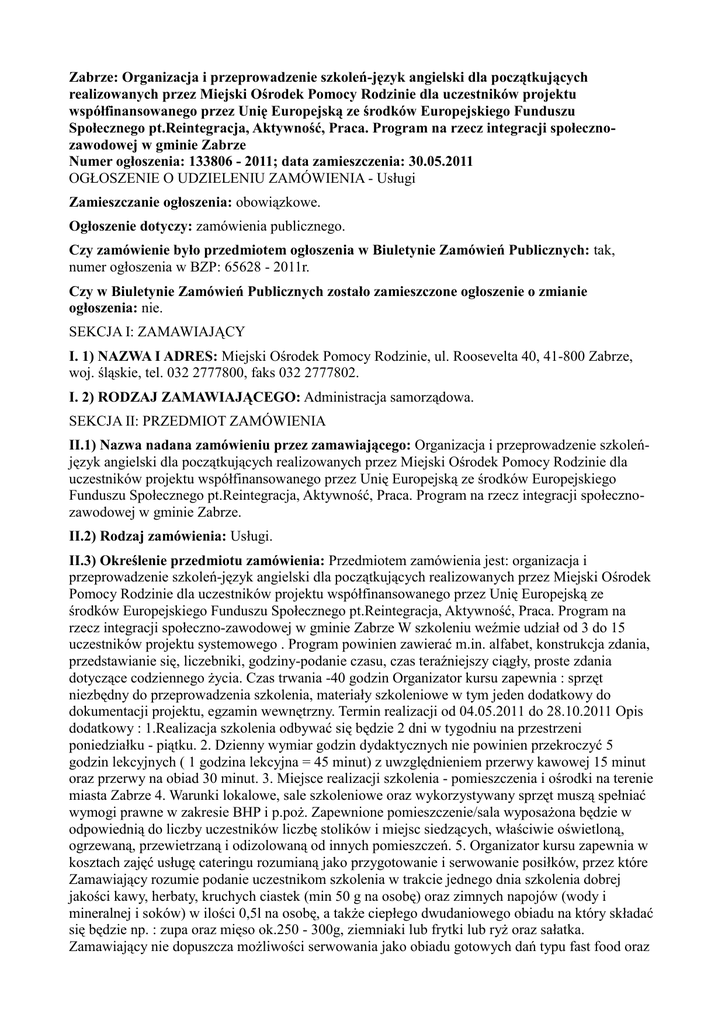 Zabrze: Organizacja i przeprowadzenie szkoleń-język angielski dla początkujących realizowanych przez Miejski Ośrodek Pomocy Rodzinie dla uczestników projektu współfinansowanego przez Unię Europejską ze środków Europejskiego Funduszu Społecznego pt.Reintegracja, Aktywność, Praca. Program na rzecz integracji społecznozawodowej w gminie Zabrze Numer ogłoszenia: 133806 - 2011; data zamieszczenia: 30.05.2011 OGŁOSZENIE O UDZIELENIU ZAMÓWIENIA - Usługi Zamieszczanie ogłoszenia: obowiązkowe. Ogłoszenie dotyczy: zamówienia publicznego. Czy zamówienie było przedmiotem ogłoszenia w Biuletynie Zamówień Publicznych: tak, numer ogłoszenia w BZP: 65628 - 2011r. Czy w Biuletynie Zamówień Publicznych zostało zamieszczone ogłoszenie o zmianie ogłoszenia: nie. SEKCJA I: ZAMAWIAJĄCY I. 1) NAZWA I ADRES: Miejski Ośrodek Pomocy Rodzinie, ul. Roosevelta 40, 41-800 Zabrze, woj. śląskie, tel. 032 2777800, faks 032 2777802. I. 2) RODZAJ ZAMAWIAJĄCEGO: Administracja samorządowa. SEKCJA II: PRZEDMIOT ZAMÓWIENIA II.1) Nazwa nadana zamówieniu przez zamawiającego: Organizacja i przeprowadzenie szkoleńjęzyk angielski dla początkujących realizowanych przez Miejski Ośrodek Pomocy Rodzinie dla uczestników projektu współfinansowanego przez Unię Europejską ze środków Europejskiego Funduszu Społecznego pt.Reintegracja, Aktywność, Praca. Program na rzecz integracji społecznozawodowej w gminie Zabrze. II.2) Rodzaj zamówienia: Usługi. II.3) Określenie przedmiotu zamówienia: Przedmiotem zamówienia jest: organizacja i przeprowadzenie szkoleń-język angielski dla początkujących realizowanych przez Miejski Ośrodek Pomocy Rodzinie dla uczestników projektu współfinansowanego przez Unię Europejską ze środków Europejskiego Funduszu Społecznego pt.Reintegracja, Aktywność, Praca. Program na rzecz integracji społeczno-zawodowej w gminie Zabrze W szkoleniu weźmie udział od 3 do 15 uczestników projektu systemowego . Program powinien zawierać m.in. alfabet, konstrukcja zdania, przedstawianie się, liczebniki, godziny-podanie czasu, czas teraźniejszy ciągły, proste zdania dotyczące codziennego życia. Czas trwania -40 godzin Organizator kursu zapewnia : sprzęt niezbędny do przeprowadzenia szkolenia, materiały szkoleniowe w tym jeden dodatkowy do dokumentacji projektu, egzamin wewnętrzny. Termin realizacji od 04.05.2011 do 28.10.2011 Opis dodatkowy : 1.Realizacja szkolenia odbywać się będzie 2 dni w tygodniu na przestrzeni poniedziałku - piątku. 2. Dzienny wymiar godzin dydaktycznych nie powinien przekroczyć 5 godzin lekcyjnych ( 1 godzina lekcyjna = 45 minut) z uwzględnieniem przerwy kawowej 15 minut oraz przerwy na obiad 30 minut. 3. Miejsce realizacji szkolenia - pomieszczenia i ośrodki na terenie miasta Zabrze 4. Warunki lokalowe, sale szkoleniowe oraz wykorzystywany sprzęt muszą spełniać wymogi prawne w zakresie BHP i p.poż. Zapewnione pomieszczenie/sala wyposażona będzie w odpowiednią do liczby uczestników liczbę stolików i miejsc siedzących, właściwie oświetloną, ogrzewaną, przewietrzaną i odizolowaną od innych pomieszczeń. 5. Organizator kursu zapewnia w kosztach zajęć usługę cateringu rozumianą jako przygotowanie i serwowanie posiłków, przez które Zamawiający rozumie podanie uczestnikom szkolenia w trakcie jednego dnia szkolenia dobrej jakości kawy, herbaty, kruchych ciastek (min 50 g na osobę) oraz zimnych napojów (wody i mineralnej i soków) w ilości 0,5l na osobę, a także ciepłego dwudaniowego obiadu na który składać się będzie np. : zupa oraz mięso ok.250 - 300g, ziemniaki lub frytki lub ryż oraz sałatka. Zamawiający nie dopuszcza możliwości serwowania jako obiadu gotowych dań typu fast food oraz gotowych sproszkowanych zup. Waga podanych porcji liczona jest osobno na danie pierwsze i drugie. 6. Zaświadczenia, certyfikaty, materiały szkoleniowe, program szkolenia, ankiety ewaluacyjne muszą posiadać informację: Szkolenie realizowane na potrzeby projektu współfinansowanego przez Unię Europejską ze środków Europejskiego Funduszu Społecznego pt. Reintegracja, Aktywność, Praca. Program na rzecz integracji społeczno-zawodowej w gminie Zabrze oraz oznaczenia logo EFS, Unii Europejskiej i logo PO KL zgodnie z zasadą wizualizacji dostępną na stronie www.efs.silesia-region.pl w zakładce promocja. 7. Wykonawca zobowiązany jest do promowania Unii Europejskiej, Europejskiego Funduszu Społecznego oraz Programu Operacyjnego Kapitał Ludzki między innymi poprzez umieszczenie w miejscu odbywania szkolenia, informację: Szkolenie realizowane na potrzeby projektu współfinansowanego przez Unię Europejską ze środków Europejskiego Funduszu Społecznego pt.Reintegracja, Aktywność, Praca. Program na rzecz integracji społeczno-zawodowej w gminie Zabrze oraz oznaczenia logo EFS, Unii Europejskiej i logo PO KL zgodnie z zasadą wizualizacji dostępną na stronie www.efs.silesiaregion.pl w zakładce promocja. Przedmiotowe informacje muszą zawierać : znak Kapitał Ludzki Narodowa Strategia Spójności, flagę Unii Europejskiej - Europejskie Fundusz Społeczny, pełną nazwę projektu i informację o współfinansowaniu Reintegracja, Aktywność, Praca. Program na rzecz integracji społeczno-zawodowej w gminie Zabrze Projekt współfinansowany przez Unię Europejską w ramach Europejskiego Funduszu Społecznego. 8. Zajęcia w ramach kursu zrealizują wykładowcy i instruktorzy Wykonawcy, którzy posiadają odpowiednie kwalifikacje zawodowe. 9. W przypadku zlecenia organizacji i realizacji kursu, Wykonawca będzie prowadził dokumentację szkoleniową, tj. imienne listy obecności z każdego szkolenia, imienne listy potwierdzające poczęstunek, dziennik zajęć, imienne listy odbioru materiałów szkoleniowych, protokoły z egzaminów, ankiety ewaluacyjne. Wykonawca przekaże Zamawiającemu potwierdzone za zgodność z oryginałem kserokopie dokumentów kursu w terminie 7 dni od da