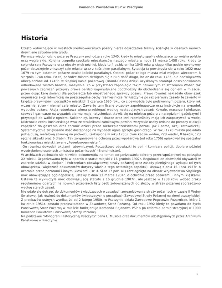 Komenda Powiatowa PSP w Pszczynie Historia Często wybuchające w miastach średniowiecznych pożary nieraz doszczętnie trawiły ściśnięte w ciasnych murach drewniane zabudowania grodu. Pierwsze wiadomości o pożarze Pszczyny pochodzą z roku 1345, kiedy to miasto spaliły oblegające go wojska polskie oraz węgierskie. Kolejna tragedia spotkała mieszkańców naszego miasta w nocy 18 marca 1458 roku, kiedy to spłonęła cała Pszczyna oraz niecały wiek później, kiedy to 4 października 1545 roku w ciągu kilku godzin gwałtowny pożar doszczętnie zniszczył całe miasto wraz z kościołem parafialnym. Sytuacja ta powtórzyła się w roku 1622 oraz 1679 (w tym ostatnim pożarze ocalał kościół parafialny). Ostatni pożar całego miasta miał miejsce wieczorem 8 sierpnia 1748 roku. Po tej pożodze miasto dźwigało się z ruin dość długo, bo aż do roku 1785, ale obowiązkowo ubezpieczone od 1746r. w śląskiej kasie pożarowej (Brand-Cassa) dzięki uzyskanym stamtąd odszkodowaniom odbudowane zostało bardziej masywnie, co w przyszłości zapobiegło takim całkowitym zniszczeniom.Wobec tak poważnych zagrożeń przepisy prawa bardzo rygorystyczne podchodziły do obchodzenia się ogniem w mieście, przewidując karę śmierci dla podpalacza lub nieostrożnego sprawcy pożaru. Prawo również nakładało obowiązek organizacji akcji ratowniczej na poszczególne cechy rzemieślnicze. W Pszczynie po raz pierwszy zasady te zawarto w księdze przywilejów i porządków miejskich 1 czerwca 1680 roku, co z pewnością było podzwonnym pożaru, który rok wcześniej strawił niemal całe miasto. Zawarto tam liczne przepisy zapobiegawcze oraz instrukcje na wypadek wybuchu pożaru. Akcja ratunkowa winna przebiegać według następujących zasad: Kowale, masarze i piekarze, szewcy i garncarze na wypadek alarmu mają natychmiast stawić się na miejscu pożaru z narzędziami gaśniczymi i przystąpić do walki z ogniem. Sukiennicy, krawcy i tkacze oraz inni rzemieślnicy mają ich zaopatrywać w wodę. Mistrzowie cechu kuśnierskiego wraz ze strażnikami zamkowymi powinni wszystkie osoby (zdolne do pomocy w akcji) zapędzać do gaszenia oraz chronić dzieci przed niebezpieczeństwami pożaru jak i samej akcji ratowniczej. Systematycznie zwiększano ilość dostępnego na wypadek ognia sprzętu gaśniczego. W roku 1770 miasto posiadało jedną dużą, metalową sikawkę na podwoziu (zakupioną w roku 1766), dwie kadzie wodne, 228 wiader, 8 haków, 123 ręczne sikawki oraz 6 drabin. Tak zorganizowaną ochroną przeciwpożarową (od roku 1756) opiekował się specjalny funkcjonariusz miejski, zwany „Feuerburgermeister”. On również dowodził akcjami ratowniczymi. Początkowo obowiązki te pełnił komisarz policji, dopiero później wyodrębniono osobnych „mistrzów pożarniczych” (Brandmeister). W archiwach zachowało się niewiele dokumentów na temat zorganizowania ochrony przeciwpożarowej na początku XX wieku. Organizowana była w oparciu o statut miejski z 16 grudnia 1907r. Regulował on obowiązki obywateli w zakresie udziału w akcjach i ćwiczeniach obowiązkowej straży pożarnej oraz zasady pieniężnego wykupu od tych obowiązków (większość dokumentów dotyczy właśnie tego ostatniego aspektu). Ustawą z dnia 16 lipca 1937r. o ochronie przed pożarami i innymi kleskami (Dz.U. Śl.nr 17 poz. 41) rozciagnięto na obszar Województwa Śląskiego moc obowiązującą ogólnopolskiej ustawy z dnia 13 marca 1934r. o ochronie przed pożarami i innymi klęskami. Ustawa ta wykluczyła moc obowiązującą statutu z 16 grudnia 1907r., ale jeszcze w 1938 roku wobec braku regulaminów opartych na nowych przepisach listy osób zobowiązanych do służby w straży pożarnej sporządzono według starych zasad. Nie udało się dotrzeć do dokumentów świadczących o zasadach zorganizowania straży pożarnych w czasie II Wojny Światowej, jak rówineż do dokumentów świadczących o początkach Zawodowej Straży Pożarnej na ziemi pszczyńskiej. Z przekazów ustnych wynika, że od 2 lutego 1950r. w Pszczynie działa Zawodowe Pogotowie Pożarnicze, które 1 kwietnia 1951r. zostało przekształcone w Zawodową Straż Pożarną. Od roku 1992 kiedy to powołano do życia Państwową Straż Pożarną w mieście funkcjonuje Komenda Rejonowa PSP a po reformie administracyjnej w 1999 Komenda Powiatowa Państwowej Straży Pożarnej. Na podstawie "Monografii Historycznej Pszczyny" pana L. Musioła oraz dokumentów udostępnionych przez Archiwum Państwowe w Pszczynie. 1