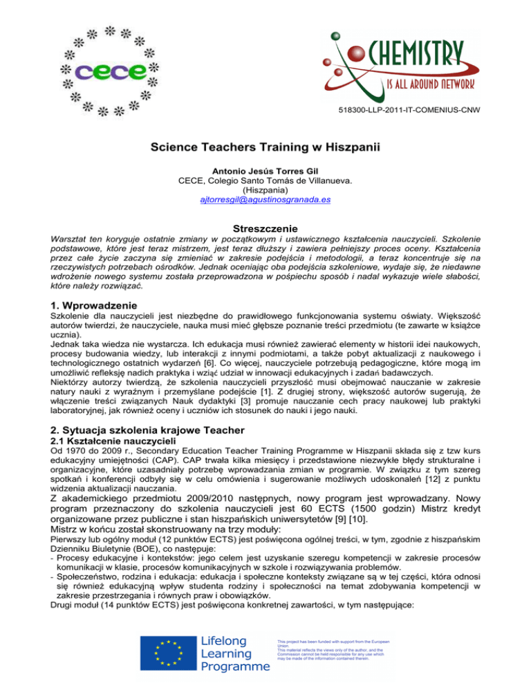 518300-LLP-2011-IT-COMENIUS-CNW Science Teachers Training w Hiszpanii Antonio Jesús Torres Gil CECE, Colegio Santo Tomás de Villanueva. (Hiszpania) [email protected] Streszczenie Warsztat ten koryguje ostatnie zmiany w początkowym i ustawicznego kształcenia nauczycieli. Szkolenie podstawowe, które jest teraz mistrzem, jest teraz dłuższy i zawiera pełniejszy proces oceny. Kształcenia przez całe życie zaczyna się zmieniać w zakresie podejścia i metodologii, a teraz koncentruje się na rzeczywistych potrzebach ośrodków. Jednak oceniając oba podejścia szkoleniowe, wydaje się, że niedawne wdrożenie nowego systemu została przeprowadzona w pośpiechu sposób i nadal wykazuje wiele słabości, które należy rozwiązać. 1. Wprowadzenie Szkolenie dla nauczycieli jest niezbędne do prawidłowego funkcjonowania systemu oświaty. Większość autorów twierdzi, że nauczyciele, nauka musi mieć głębsze poznanie treści przedmiotu (te zawarte w książce ucznia). Jednak taka wiedza nie wystarcza. Ich edukacja musi również zawierać elementy w historii idei naukowych, procesy budowania wiedzy, lub interakcji z innymi podmiotami, a także pobyt aktualizacji z naukowego i technologicznego ostatnich wydarzeń [6]. Co więcej, nauczyciele potrzebują pedagogiczne, które mogą im umożliwić refleksję nadich praktyka i wziąć udział w innowacji edukacyjnych i zadań badawczych. Niektórzy autorzy twierdzą, że szkolenia nauczycieli przyszłość musi obejmować nauczanie w zakresie natury nauki z wyraźnym i przemyślane podejście [1]. Z drugiej strony, większość autorów sugerują, że włączenie treści związanych Nauk dydaktyki [3] promuje nauczanie cech pracy naukowej lub praktyki laboratoryjnej, jak również oceny i uczniów ich stosunek do nauki i jego nauki. 2. Sytuacja szkolenia krajowe Teacher 2.1 Kształcenie nauczycieli Od 1970 do 2009 r., Secondary Education Teacher Training Programme w Hiszpanii składa się z tzw kurs edukacyjny umiejętności (CAP). CAP trwała kilka miesięcy i przedstawione niezwykłe błędy strukturalne i organizacyjne, które uzasadniały potrzebę wprowadzania zmian w programie. W związku z tym szereg spotkań i konferencji odbyły się w celu omówienia i sugerowanie możliwych udoskonaleń [12] z punktu widzenia aktualizacji nauczania. Z akademickiego przedmiotu 2009/2010 następnych, nowy program jest wprowadzany. Nowy program przeznaczony do szkolenia nauczycieli jest 60 ECTS (1500 godzin) Mistrz kredyt organizowane przez publiczne i stan hiszpańskich uniwersytetów [9] [10]. Mistrz w końcu został skonstruowany na trzy moduły: Pierwszy lub ogólny moduł (12 punktów ECTS) jest poświęcona ogólnej treści, w tym, zgodnie z hiszpańskim Dzienniku Biuletynie (BOE), co następuje: - Procesy edukacyjne i kontekstów: jego celem jest uzyskanie szeregu kompetencji w zakresie procesów komunikacji w klasie, procesów komunikacyjnych w szkole i rozwiązywania problemów. - Społeczeństwo, rodzina i edukacja: edukacja i społeczne konteksty związane są w tej części, która odnosi się również edukacyjną wpływ studenta rodziny i społeczności na temat zdobywania kompetencji w zakresie przestrzegania i równych praw i obowiązków. Drugi moduł (14 punktów ECTS) jest poświęcona konkretnej zawartości, w tym następujące: 518300-LLP-2011-IT-COMENIUS-CNW - Uzupełnienie do treningu Dyscypliny: przyszli nauczyciele muszą nauczyć się, jak przekazywać dynamicznego spojrzenia na ich temat przez historię, ostatnie wydarzenia i tych sytuacjach i kontekstach, w których treści programowe są nauczane. Ta część jest związana z rozwojem strategii mających na celu aktualizację wiedzy naukowej oraz wspierania kontaktów między nauczycielami i ekspertami. - Uczenia się i nauczania każdego konkretnego przedmiotu: sekcja ta zajmuje się zdobywania wiedzy na temat teoretyczno-praktycznych treści przedmiotu i jak przekształcić programy nauczania w działalności i programach prac. Obejmuje ono także) projektowanie i dobór odpowiednich materiałów edukacyjnych, b) włączenie strategii i technik oceny c) szkolenie w multimedialnej i komunikacji audio-wideo w procesie nauczania-uczenia się. - Nauczanie innowacji i wprowadzenie do badań edukacyjnych: przyszły nauczyciel powinien nauczyć się, jak w praktyce innowacyjnych materiałów dydaktycznych dotyczących jego / jej temat, badania podstawowe i techniki oceny i rozwoju badań naukowych, innowacji i projektów ewaluacyjnych. Trzeci moduł (16 punktów ECTS) odpowiada Practicum, którego głównym celem jest to, że przyszli nauczyciele zdobyć doświadczenie w zakresie planowania, nauczania i oceny obiektów Specjalizuje się w. Nauczyciele muszą okazać odpowiednie polecenia w mowie i piśmie wypowiedzi podczas nauczania oraz w odpowiednie umiejętności, które ułatwiają naukę i mieszkają razem. Moduł ten jest podzielony na dwie części: Pierwsza część składa się z 100 godzin praktyki specjalistyczne szkolenia prowadzone w wysokiej centrum szkolnym podczas okresu czasu od czterech do sześciu tygodni. Taka praktyka jest nadzorowany przez członka kadry pedagogicznej i kończy się złożeniem sprawozdania końcowego, w tym samooceny, która jest usuwana przez każdego przełożonego. W drugiej części, student musi napisać ostateczny projekt odzwierciedlający kompetencje nabyte w trakcie procesu kształcenia, które s / on będzie w końcu zaprezentować w publicznej sesji. 2,2 kształcenia przez całe życie Według hiszpańskiej ustawy oświatowej, nauczycieli jest wśród praw i obowiązków nauczycieli. Ponadto ustawa ta deklaruje, że oba organy administracji publicznej i ośrodki dydaktyczne są odpowiedzialni za nauczanie szkolenia. Kształcenia przez całe życie powinny umożliwić osiągnięcie celów, takich jak poszerzenie specjalistycznej i dydaktycznej nauczycieli wiedzy, umożliwiający nauczycielom projektowania programowych pr