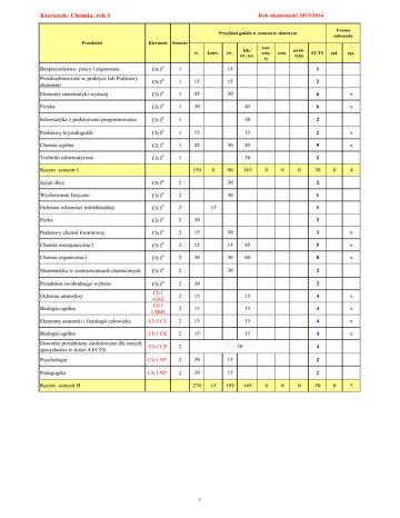 Kierunek: Chemia, rok I Rok akademicki 2015/2016 Forma zaliczenia Przydział godzin w semestrze zimowym Przedmiot Kierunek Semestr w. Bezpieczeństwo pracy i ergonomia Ch I Przedsiębiorczość w praktyce lub Podstawy ekonomii Ch I Elementy matematyki wyższej Ch I Fizyka 0 1 0 1 0 konw. ćw. lab./ ćw. ter. warsztaty sem. praktyka ECTS zal. egz. 15 1 15 15 2 1 45 30 6 x Ch I 0 1 30 45 6 x Informatyka z podstawami programowania Ch I0 1 30 2 Podstawy krystalografii Ch I 0 1 15 15 2 x Chemia ogólna Ch I0 1 45 45 9 x Techniki informatyczne Ch I 0 1 30 2 150 Razem semestr I 30 0 90 165 0 0 0 30 0 4 Język obcy Ch I0 2 30 2 Wychowanie fizyczne Ch I 0 2 30 1 Ochrona własności intelektualnej Ch I0 2 Etyka Ch I 0 2 30 Podstawy chemii kwantowej Ch I0 2 15 30 Chemia nieorganiczna I Ch I0 2 15 15 Chemia organiczna I Ch I0 2 30 30 Matematyka w zastosowaniach chemicznych Ch I0 2 Przedmiot swobodnego wyboru Ch I 0 2 30 2 15 15 4 x 2 15 15 4 x Ochrona atmosfery Biologia ogólna Ch I ASIZ Ch I CBIB 15 1 2 3 x 45 5 x 60 8 x 30 2 2 Elementy anatomii i fizjologii człowieka Ch I CL 2 15 15 4 x Biologia ogólna Ch I CK 2 15 15 4 x Dowolne przedmioty zaoferowane dla innych specjalności w ilości 4 ECTS Ch I CP 2 Psychologia Ch I NP. 2 30 15 2 Pedagogika Ch I NP. 2 30 15 2 Razem semestr II 30 270 7 15 195 4 165 0 0 0 50 0 7 Kierunek: Chemia, rok II specjalność: chemia leków Rok akademicki 2015/2016 Forma zaliczenia Przydział godzin w semestrze zimowym Przedmiot Kierunek Semestr w. Język obcy Ch I0 3 Chemia analityczna z elementami analizy instrumentalnej Ch I 0 3 30 Chemia organiczna II Ch I0 3 30 Chemia nieorganiczna II Ch I 0 3 Farmakologia i farmakognozja ChL 3 ćw. lab./ ćw. ter. warsztaty sem. praktyka 30 ECTS zal. egz. 2 75 7 30 45 7 x 45 30 45 8 x 30 45 6 x 135 Razem semestr III konw. 0 135 165 0 0 0 30 0 3 Język obcy Ch 4 Inżynieria materiałowa Ch 4 15 1 Chemia polimerów Ch 4 30 2 x Chemia analityczna z elementami analizy instrumentalnej Ch 4 15 30 3 x Biochemia Ch 4 30 45 5 x Chemia fizyczna I Ch 4 30 45 6 x Przedmioty swobodnego wyboru Ch 4 30 Chemia biomedyczna i patentowanie leków ChL 4 30 Metody spektroskopowe w analizie leków ChL 4 15 Razem semestr IV 30 195 8 15 2 2 15 4 30 0 60 150 5 0 0 0 30 0 4 Kierunek: Chemia, rok III specjalność: chemia leków Rok akademicki 2015/2016 Forma zaliczenia Przydział godzin w semestrze zimowym Przedmiot Kierunek Semestr w. konw. ćw. lab./ ćw. ter. warsztaty sem. praktyka ECTS Język obcy Ch 5 30 4 Język angielski w chemii Ch 5 15 1 Technologia chemiczna Ch 5 30 Chemia fizyczna II Ch 5 30 Pracownia dyplomowa Ch 5 Praktyka zawodowa - 3 tygodnie (praktyka po IV sem.) Ch 5 Inżynieria biomateriałów ChL 5 Laboratorium syntezy i analizy leków ChL 5 x 45 5 x 45 6 x 90 15 15 2 75 0 75 5 195 7 0 0 90 30 Chemia stosowana i zarządzanie chemikaliami Ch 6 30 2 Wykład monograficzny Ch 6 30 3 Seminarium dyplomowe Ch 6 Pracownia dyplomowa Ch 6 Przedmioty swobodnego wyboru Ch 6 30 Strukturalne aspekty w projektowaniu leków ChL 6 15 Zaawansowana synteza organiczna w chemii leków ChL 6 30 Razem semestr IV egz. 30 75 Razem semestr V 15 zal. 30 9 3 5 30 135 0 10 2 15 3 15 0 15 x 5 45 0 30 0 30 0 1 Kierunek: Chemia, I rok II stopnia specjalność: Chemia leków Rok akademicki 2015/2016 Forma zaliczenia Przydział godzin w semestrze zimowym Przedmiot Kierunek Semestr w. Filozofia Ch II 1 30 Chemia teoretyczna i modelowanie molekularne Ch II 1 30 Spektroskopia molekularna Ch II 1 30 Analiza substancji farmakopealnych i produktów leczniczych Ch II CL 1 Fitoterapia Ch II CL 1 Botanika farmaceutyczna Ch II CL 1 Język obcy II (wskazany język angielski) Ch II 2 Społeczna odpowiedzialność przedsiębiorstw CSR Ch II 2 30 Termodynamika statystyczna Ch II 2 15 Analiza instrumentalna Ch II 2 30 Przedmioty swobodnego wyboru Ch II 2 30 Nowoczesne metody kontrolowanego uwalniania leków Ch II CL 2 15 Leki celowane molekularnie Ch II CL 2 15 Razem semestr II ćw. lab./ ćw. ter. warsztaty sem. praktyka 30 10 zal. egz. 45 9 x 90 9 x 30 2 15 0 x 4 15 30 60 195 4 0 0 0 30 135 ECTS 2 30 120 Razem semestr I konw. 30 0 3 4 3 15 105 3 x 10 x 2 15 15 0 60 120 0 0 0 4 x 4 x 30 0 4 Kierunek: Chemia, II rok II stopnia specjalność: Chemia leków Rok akademicki 2015/2016 Forma zaliczenia Przydział godzin w semestrze zimowym Przedmiot Kierunek Semestr w. konw. ćw. lab./ ćw. ter. warsztaty sem. praktyka ECTS Język obcy II (wskazany język angielski) Ch II 0 3 30 4 Wychowanie fizyczne Ch II0 3 15 0 Biochemiczna analiza instrumentalna Ch II 0 3 Terminologia angielska w chemii Ch II0 3 Termodynamika statystyczna Ch II0 3 Seminarium magisterskie I Ch II 0 3 Przedmioty swobodnego wyboru Ch II0 3 Chemia w nauce i gospodarce - historia i współczesność Polimery do zastosowań farmaceutycznych Praktyka zawodowa Wykład monograficzny Pracownia magisterska 30 15 egz. 5 15 1 15 4 15 x 3 30 2 0 Ch II ChL Ch II0 ChL 0 Ch II ChL Ch II0 ChL Ch II0 ChL 3 3 15 1 15 4 60 3 30 x 4 2 3 30 105 Ch II0 15 3 Razem semestr III Seminarium magisterskie II 15 zal. 0 105 60 0 0 4 15 60 30 30 0 2 0 0 10 0 Pracownia magisterska Razem semestr IV Ch II ChL 4 45 0 11 0 0 45 20 0 30 0 30 Kierunek: Chemia, II rok II stopnia specjalność: Nauczycielska Rok akademicki 2015/2016 Forma zaliczenia Przydział godzin w semestrze zimowym Przedmiot Kierunek Semestr w. konw. ćw. lab./ ćw. ter. warsztaty sem. praktyka ECTS Język obcy II (wskazany język angielski) Ch II0 3 30 4 Wychowanie fizyczne Ch II 0 3 15 0 Biochemiczna analiza instrumentalna Ch II0 3 Terminologia angielska w chemii Ch II0 3 Termodynamika statystyczna Ch II 0 3 Seminarium magisterskie I Ch II0 3 Przedmioty swobodnego wyboru Ch II0 3 Technologia informacyjna w nauczaniu chemii Praktyka w zakresie dydaktycznym - praktyka ciągła w szkole ponadgimnazjalnej Ch II NCh 3 Dydaktyka chemii na IV etapie edukacyjnym Ch II0 NCh 3 15 5 15 1 15 4 15 x 3 30 2 15 3 2 15 3 2 0 60 15 75 Razem semestr III Seminarium magisterskie II Ch II0 4 Pracownia magist