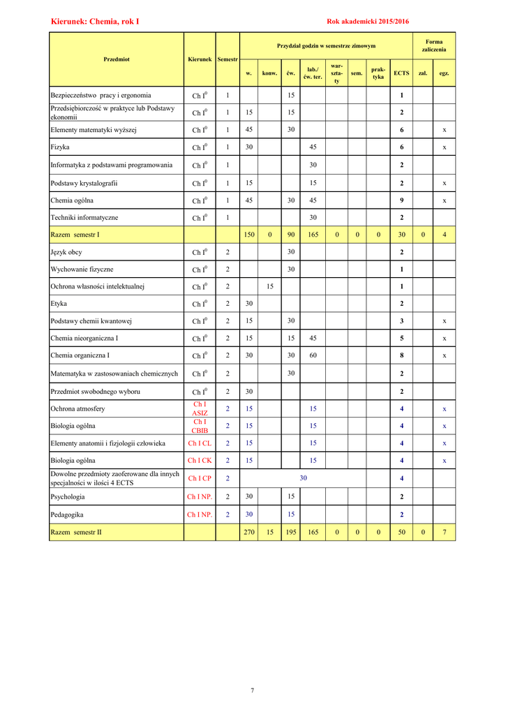Kierunek: Chemia, rok I