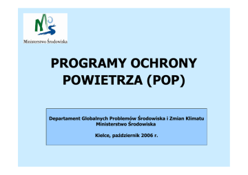 PROGRAMY OCHRONY POWIETRZA (POP) Departament Globalnych Problemów Środowiska i Zmian Klimatu Ministerstwo Środowiska Kielce, październik 2006 r. Zakres prezentacji: • podstawy prawne – regulacje krajowe na tle wymagań unijnych, • bieżąca ocena jakości powietrza podstawą sporządzenia programu ochrony powietrza, • zasady sporządzania programów ochrony powietrza, • dotychczasowe doświadczenia, • zasady składania informacji na temat programów ochrony powietrza, • nowe wymagania. POP w polskim prawie • Ustawa z dnia 27 kwietnia 2001r. - Prawo ochrony środowiska (Dz.U. Nr 62. poz. 627 z dnia 20 czerwca 2001r. z późn. zm.) • Rozporządzenie Ministra Środowiska z dnia 6 czerwca 2002r. w sprawie dopuszczalnych poziomów niektórych substancji w powietrzu, alarmowych poziomów niektórych substancji w powietrzu oraz marginesów tolerancji dla dopuszczalnych poziomów niektórych substancji (Dz.U. Nr 87. poz.796 z dnia 27 czerwca 2002r.) • Rozporządzenie Ministra Środowiska z dnia 6 czerwca 2002r. w sprawie oceny poziomów substancji w powietrzu (Dz.U. Nr 87. poz.796 z dnia 27 czerwca 2002r.) • Rozporządzenia Ministra Środowiska z dnia 5 lipca 2002r. w sprawie wymagań jakim powinny odpowiadać programy ochrony powietrza (Dz.U. Nr115. poz.1003 z dnia 24 lipca 2002r.) • Rozporządzenie Ministra Środowiska z dnia 5 kwietnia 2006r. w sprawie zakresu i sposobu przekazywania informacji dotyczących zanieczyszczenia powietrza (Dz.U. Nr 63, poz. 445 z dnia 13 kwietnia 2006r.) Regulacje Unijne podstawą obowiązującego systemu oceny i kontroli jakości powietrza • Dyrektywa 1996/62/WE z dnia 27 września 1996 r. w sprawie oceny i kontroli jakości otaczającego powietrza (tzw. Dyrektywa Ramowa), • Dyrektywa 1999/30/EC z dnia 22 kwietnia 1999 roku w sprawie wartości dopuszczalnych dwutlenku siarki, dwutlenku azotu i tlenków azotu, zanieczyszczeń pyłowych i ołowiu w powietrzu oraz Decyzja Komisji (2001/744/EC) z 17 października 2001 r. zmieniająca Aneks V do tej dyrektywy, • Dyrektywa 2000/69/WE z dnia 16 listopada 2000 roku w sprawie wartości dopuszczalnych benzenu i tlenku węgla w powietrzu, • Dyrektywa 2002/3/WE z dnia 12 lutego 2002 r. w sprawie ozonu w powietrzu. Prawo ochrony środowiska Dział II Ochrona powietrza cel ochrony powietrza ¾ utrzymanie poziomów substancji w powietrzu poniżej dopuszczalnych dla nich poziomów lub co najmniej na tych poziomach, ¾ zmniejszeniu poziomów substancji w powietrzu co najmniej do dopuszczalnych, gdy nie są one dotrzymane POP DIAGNOZA Podstawa sporządzenia POP: • coroczna ocena jakości powietrza i klasyfikacja stref Odpowiedzialni: • wojewódzkie inspektoraty ochrony środowiska (art. 89 ustawy – Prawo ochrony środowiska) Termin: 31 maja każdego roku za rok poprzedni wyniki oceny jakości powietrza niezwłocznie otrzymuje wojewoda OCENA JAKOŚCI POWIETRZA Klasyfikacja stref: STREFA C – poziom choćby jednej substancji przekracza poziom POP dopuszczalny powiększony o margines tolerancji (jeżeli dla substancji nie został określony margines tolerancji – poziom choćby jednej substancji przekracza poziom dopuszczalny) STREFA B – poziom choćby jednej substancji mieści się pomiędzy poziomem dopuszczalnym a poziomem dopuszczalnym powiększonym o margines tolerancji STREFA A – poziom substancji nie przekracza poziomu dopuszczalnego OCENA JAKOŚCI POWIETRZA LISTA SUBSTANCJI: benzen, dwutlenek azotu/tlenki azotu, dwutlenek siarki, ołów, ozon, pył zawieszony PM10, tlenek węgla. Załącznik do rozporządzenia MŚ w sprawie dopuszczalnych poziomów niektórych substancji w powietrzu … Załącznik nr 1 Dopuszczalne poziomy substancji obowiązujące na terenie kraju dla różnych okresów uśredniania wyników pomiarów, czas ich obowiązywania, dopuszczalne częstości przekraczania oraz margines tolerancji lp Nazwa substancji (numer CAS ) a) Okres uśredniania wyników pomiarów Dopuszczalny poziom substancji w powietrzu w [µg/m3] Dopuszczalna Margines tolerancji częstość [%] [µg/m3] przekraczania dopuszczalnego poziomu w roku od 2001 2002 2003 2004 2005 2006 2007 2008 2009 kalendarzowym 2010 b) rok 5 c) kalendarz owy jedna 200 c) godzina Dwutlenek azotu rok (10102-44-0) kalendarz 40 c) 2 owy Tlenki azotu rok 40 e) 30 e) d) kalendarz do od (10102-44-0, 31.12.2002 1.01.2003 owy 10102-43-9) jedna 350 c) godzina 125 c) 150 c) Dwutlenek 24 do od 3 siarki godziny 31.12.2004 1.01.2005 (7446-09-5) rok 20 e) 40 e) kalendarz do od 31.12.2002 1.01.2003 owy Benzen 1 (71-43-2) 18 razy - 24 razy 100 100 100 100 100 80 60 40 20 5 5 5 5 5 4 3 2 1 45 90 40 80 35 70 30 60 25 50 20 40 15 30 10 20 5 10 45 40 35 30 25 20 15 10 5 18 16 14 12 10 8 6 4 2 0 0 0 0 0 0 0 0 0 0 0 0 0 0 0 0 34,4 25,8 17,2 8,6 120 90 60 30 0 0 0 3 razy 0 0 0 0 0 0 0 0 0 0 - 0 0 0 0 0 0 0 0 0 0 Załącznik do rozporządzenia MŚ w sprawie dopuszczalnych poziomów niektórych substancji w powietrzu … c.d. Ołów f) 4 (7439-92-1) rok kalenda rzowy 80 60 40 20 0,4 0,3 0,2 0,1 0 0 0 - 0 0 50 c) 35 razy 40 20 40 c) - 0,5 c) - 0 0 0 0 0 0 0 0 0 0 0 0 0 0 0 0 0 0 0 0 0 30 15 20 10 10 5 0 0 0 0 0 0 16 12 8 4 6,4 4,8 3,2 1,6 0 0 0 0 0 60 60 40 20 60 400 00 0 20 00 0 0 0 0 0 60 dni 25 dni osiem godzin 5 Ozon (10028-15-16) okres wegeta cyjny (1.V – 31.VII) 24 godziny 6 Pył zawieszony rok PM10 j) kalenda rzowy Tlenek węgla 7 (630-08-0) osiem godzin 120 c)g) 24000 e)i) µg/m3•h do 18000 e)i) µg/m3•h do 31.12.2009 1.01.2010 10000 c)k) h) h) do 31.12. 2004 od 1.01. 2005 - 6000 0 Objaśnienia: a) oznaczenie numeryczne substancji wg Chemical Abstracts Service Registry Number, b) w przypadku programów ochrony powietrza, o których mowa w art. 91 ustawy z dnia 27 kwietnia 2001 r. Prawo ochrony środowiska (Dz. U. Nr 62, poz. 627) częstość przekraczania odnosi się do poziomu dopuszczalnego wraz z marginesem tolerancji, c) poziom dopuszczalny dla punktów pomiarowych zlokalizowanych ze względu na ochronę zdrowia, d) suma