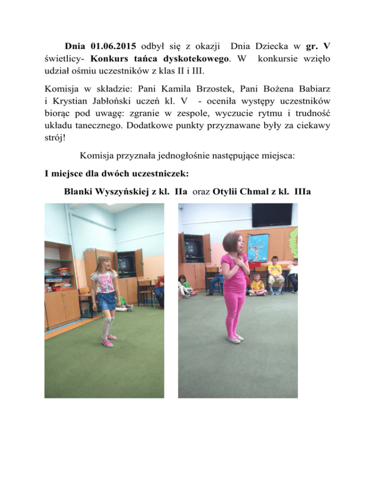 Dnia 01.06.2015 odbył się z okazji Dnia Dziecka w gr. V świetlicy- Konkurs tańca dyskotekowego. W konkursie wzięło udział ośmiu uczestników z klas II i III. Komisja w składzie: Pani Kamila Brzostek, Pani Bożena Babiarz i Krystian Jabłoński uczeń kl. V - oceniła występy uczestników biorąc pod uwagę: zgranie w zespole, wyczucie rytmu i trudność układu tanecznego. Dodatkowe punkty przyznawane były za ciekawy strój! Komisja przyznała jednogłośnie następujące miejsca: I miejsce dla dwóch uczestniczek: Blanki Wyszyńskiej z kl. IIa oraz Otylii Chmal z kl. IIIa II miejsce dla zespołu: Julia Szurawska, Weronika Szugzda, Patrycja Józwiak z kl. IIIa i IIIb oraz Alicji Płacheckiej z kl. IIa III miejsce dla zespołu – Otylia Chmal i Mirosława Obuhowa z kl. IIIa i IIIb Rozdanie dyplomów i nagród, oraz występ zwycięzców oraz zaproszonego gościa - nastąpi 08.06.2015 o godz.14.00
