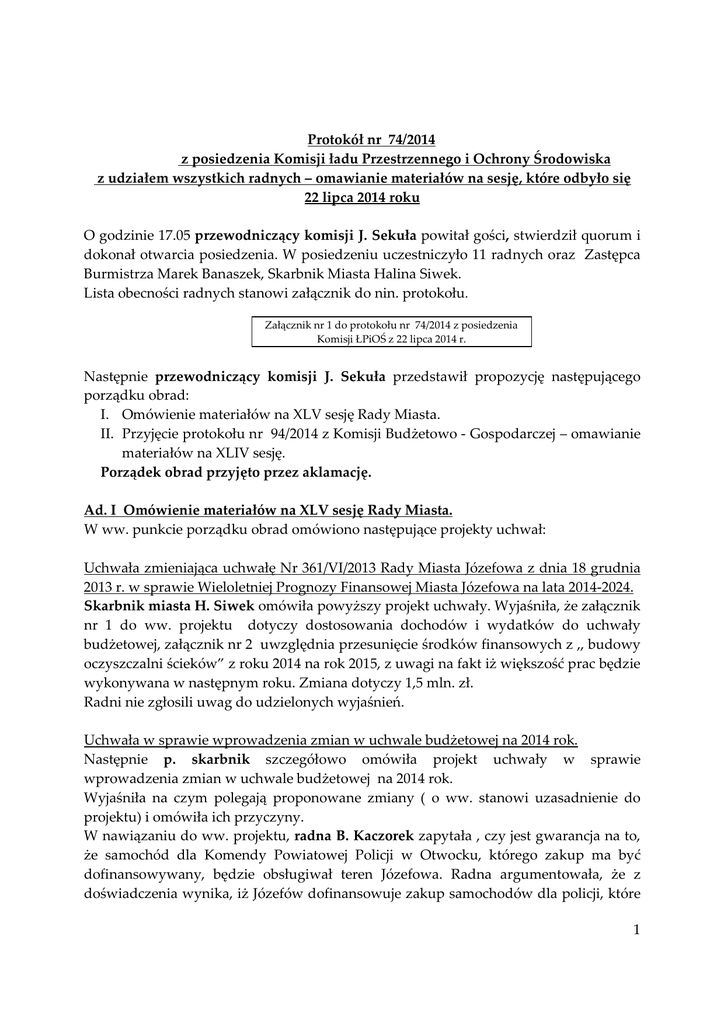 Protokół nr 74/2014 z posiedzenia Komisji ładu Przestrzennego i Ochrony Środowiska z udziałem wszystkich radnych – omawianie materiałów na sesję, które odbyło się 22 lipca 2014 roku O godzinie 17.05 przewodniczący komisji J. Sekuła powitał gości, stwierdził quorum i dokonał otwarcia posiedzenia. W posiedzeniu uczestniczyło 11 radnych oraz Zastępca Burmistrza Marek Banaszek, Skarbnik Miasta Halina Siwek. Lista obecności radnych stanowi załącznik do nin. protokołu. Załącznik nr 1 do protokołu nr 74/2014 z posiedzenia Komisji ŁPiOŚ z 22 lipca 2014 r. Następnie przewodniczący komisji J. Sekuła przedstawił propozycję następującego porządku obrad: I. Omówienie materiałów na XLV sesję Rady Miasta. II. Przyjęcie protokołu nr 94/2014 z Komisji Budżetowo - Gospodarczej – omawianie materiałów na XLIV sesję. Porządek obrad przyjęto przez aklamację. Ad. I Omówienie materiałów na XLV sesję Rady Miasta. W ww. punkcie porządku obrad omówiono następujące projekty uchwał: Uchwała zmieniająca uchwałę Nr 361/VI/2013 Rady Miasta Józefowa z dnia 18 grudnia 2013 r. w sprawie Wieloletniej Prognozy Finansowej Miasta Józefowa na lata 2014-2024. Skarbnik miasta H. Siwek omówiła powyższy projekt uchwały. Wyjaśniła, że załącznik nr 1 do ww. projektu dotyczy dostosowania dochodów i wydatków do uchwały budżetowej, załącznik nr 2 uwzględnia przesunięcie środków finansowych z ,, budowy oczyszczalni ścieków” z roku 2014 na rok 2015, z uwagi na fakt iż większość prac będzie wykonywana w następnym roku. Zmiana dotyczy 1,5 mln. zł. Radni nie zgłosili uwag do udzielonych wyjaśnień. Uchwała w sprawie wprowadzenia zmian w uchwale budżetowej na 2014 rok. Następnie p. skarbnik szczegółowo omówiła projekt uchwały w sprawie wprowadzenia zmian w uchwale budżetowej na 2014 rok. Wyjaśniła na czym polegają proponowane zmiany ( o ww. stanowi uzasadnienie do projektu) i omówiła ich przyczyny. W nawiązaniu do ww. projektu, radna B. Kaczorek zapytała , czy jest gwarancja na to, że samochód dla Komendy Powiatowej Policji w Otwocku, którego zakup ma być dofinansowywany, będzie obsługiwał teren Józefowa. Radna argumentowała, że z doświadczenia wynika, iż Józefów dofinansowuje zakup samochodów dla policji, które 1 nie patrolują Józefowa i garażują w Otwocku. Mając powyższe na uwadze radna B. Kaczorek zgłosiła wniosek formalny w sprawie ,,wyjęcia” z ww. projektu uchwały pozycji budżetowej dotyczącej dotacji dla Komendy Powiatowej Policji w Otwocku z na zakup radiowozu. Rada Miasta Józefowa w obecności 12 radnych – 9 głosami ,,za”, 3 radnych wstrzymało się od głosu - podjęła wniosek w sprawie nieuwzględniania w projekcie, uchwały w sprawie wprowadzenia zmian w uchwale budżetowej na 2014 rok, dotacji celowej dla Komendy Powiatowej Policji w Otwocku na zakup radiowozu w wysokości 20 tys. zł. W nawiązaniu do powyższego, burmistrz M. Banaszek powiedział, że nie podziela opinii radnej Kaczorek, że samochód policyjny, którego zakup Józefów w przeszłości dofinansowywał, nie był używany do pracy na terenie Józefowa. Burmistrz argumentował, że jeśli istniała taka potrzeba, samochód był na terenie Józefowa. Ponadto burmistrz wyjaśnił, że burmistrz S. Kruszewski rozmawiał z komendantem Policji Powiatowej w Otwocku i prawdopodobnie radiowóz, który ma zostać zakupiony przeznaczony zostanie do obsługi Józefowa i będzie tu garażował. Radna U. Zielińska nadmieniła, że władze miasta wspierają policję, a na terenie miasta dochodzi do wielu kradzieży. Radna M. Walkiewicz poinformowała, że Komisja Przestrzegania Prawa i Porządku Publicznego współpracuje z policją. Policja przedkłada komisji sprawozdania. Z owych sprawozdań wynika, że w Komisariacie Policji w Józefowie ciągle są wakaty, a obsługuje on bardzo rozległy teren. Jeśli radni chcą dowiedzieć się o wykroczeniach i przestępstwach popełnionych z udziałem młodzieży, to nie można dowiedzieć się z tego z informacji zawartych w sprawozdaniu, ponieważ sprawozdanie ich nie zawiera. Są uwzględnione w statystykach komendy powiatowej. Radna U. Zielińska argumentowała, że w lokalach w zasobie TBS było wiele kradzieży, a postępowania mające na celu wykrycie sprawców, zostały szybko umorzone. Radna wyraziła opinię, że Rada Miasta Józefowa co kadencję dofinansowuje policję, więc powinna się ona wykazać skutecznością działania. Radna H. Dudek powiedziała, że samochód , który ma być dofinansowany przez Józefów powinien być wykorzystywany do pracy na terenie Józefowa. Radna B. Kaczorek nawiązała też do innego tematu. Zapytała, czy Rada Nadzorcza Hydrosfery Józefów Sp. z o.o. wiedziała o problemach finansowych spółki i czy zgłaszała, że nie będzie płynności finansowej. W nawiązaniu do wypowiedzi przedmówczyni, przewodnicząca Rady Miasta M. Jakubowska zwróciła uwagę, że na pytania zgłoszone przez radnych podczas posiedzenia 17 lipca br. zostały udzielone w formie pisemnej odpowiedzi, po czym poprosiła, aby radni zapoznali z nimi. Przewodnicząca dodała, że Rada będzie zajmowała się tematem taryf w październiku bieżącego roku. Na pytanie radnej Kaczorek burmistrz M. Banaszek odpowiedział twierdząco. Wyjaśnił, że co roku przedstawiany jest bilans. Był on też przedstawiany przy próbach 2 podwyżki taryf, którym zajmowała się Rada Miasta. Radna A. Masik zapytała, dlaczego spłaty pożyczki rozpoczynają się dopiero od 2016 roku. Zastępca burmistrza M. Banaszek odpowiedział, że najczęściej przy pożyczkach , czy kredytach wprowadza się okres karencji (wolny od spłat). Burmistrz wyjaśnił, że miasto prawie w 100 % jest skanalizowane, czyli jest sieć, która generuje koszty, natomiast nie wszystkie posesje są do tej sieci podłączone. Podłączenia stanowią ok. 60%, czyli przychody są niższe od kosztów. Przy ww. 