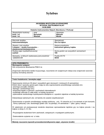 Sylabus AKADEMIA MUZYCZNA W KRAKOWIE WYDZIAŁ INSTRUMENTALNY 14.06.2009 Katedra Instrumentów Dętych Akordeonu i Perkusji Stopień/tytuł naukowy kwal. I st. kwal. I st. Imię Benedykt Wacław Nazwisko Matusik Mulak Kierunek studiów Instrumentalistyka Specjalność Gra na trąbce Stopień i tryb studiów I stopień – studia licencjackie – stacjonarne/niestacjonarne Rodzaj zajęć (wykład/ćwiczenia) wykład Nazwa przedmiotu Instrument główny trąbka Semestry, w których realizowany jest przedmiot I,II,III,IV,V,VI Punkty ECTS 48/54 Suma godzin we wszystkich semestrach 180 OPIS PRZEDMIOTU Wymagania wstępne Gra na poziomie absolwenta PSM II st. Znajomość elementów dzieła muzycznego, rozumienie ich wzajemnych relacji oraz znajomość wzorców budowy formalnej utworów Treści kształcenia i tematyka zajęć Opanowanie minimum 50 etiud i wszystkich gam durowych i molowych (5 semestrów). Dobór etiud i sposoby grania gam mają na celu wypracowanie prawidłowego warsztatu tzn; -pewnego początku dżwieku -ładnego i swobodnego tonu -artykulacji legato w gamach i pochodach interwałowych -szybkiego staccato w całej skali i w każdej dynamice -opanowanie swobodnego wydobywania dżwięków w wysokim rejestrze w każdej dynamice Interpretacja wybranych utw. od baroku do czasów współczesnych Opanowanie w sposób umożliwiający występ publiczny , min. 15 utworów po 3 na semestr w tym koncertu , formy cyklicznej i utw. dowolnego (jeden utw. na pamięć). W semestrze I - tylko gamy i etiudy. W zależności od predyspozycji studenta stopniowe wprowadzanie tajników gry na trąbce piccolo i na trąbce w stroju C, D i Es. Przyswajanie studentowi form zachowań, związanych z występami publicznymi. Doskonalenie czytania nut a`vista Metody nauczania (sposób prowadzenia/odbywania zajęć, używane środki) Wykład na lekcjach indywidualnych, Prezentacja własna pedagoga Praca z akompaniatorem Audycje klasowe Cele nauczania i efekty kształcenia (oczekiwane rezultaty nauczania, nabyte przez studentów umiejętności i wiedza) Absolwent studiów I stopnia powinien wykazywać się następującymi cechami; -ma umiejętności i potrzebną wiedzę do wykonywania związanego ze specjalnością reprezentatywnego repertuaru w różnych stylach – przyswoił sobie formy zachowań związane z występami publicznymi;-zna budowę, sposób funkcjonowania i rozwój historyczny instrumentu związanego z jego specjalnością, a także orientuje się w dotyczącej go problematyce technologicznej;- w wystarczającym stopniu osiągnął biegłość w czytaniu nut a vista-jest świadomy powiązań i zależności pomiędzy teoretycznymi i praktycznymi elementami studiów Możliwe języki nauczania Polski , Angielski. Niemiecki . ZALICZENIE PRZEDMIOTU Terminy, forma i zakres sprawdzianu umiejętności/wiedzy studenta Opanowanie programu w sposób nadający się do występu publicznego Zdanie egzaminu technicznego Czynny udział w co najmniej dwóch audycjach klasowych Sposoby oceny pracy studenta Udział procentowy w ocenie końcowej ocena ciągła (bieżące przygotowanie do zajęć i aktywność) 20 śródsemestralne kolokwia pisemne/ustne końcowe zaliczenie pisemne/ustne/praktyczne egzamin pisemny egzamin ustny egzamin praktyczny 80 kontrola obecności praca końcowa semestralna/roczna inne (wymienić) Ocenę, ostatecznie ustala komisja egzaminacyjna Ogółem 100 % Literatura obowiązkowa Józef Pawłowski ; Trąbka od A do Z. Kraków 1979 Alexander Buchner; Encyklopedia instrumentów muzycznych. Racibórz 1995