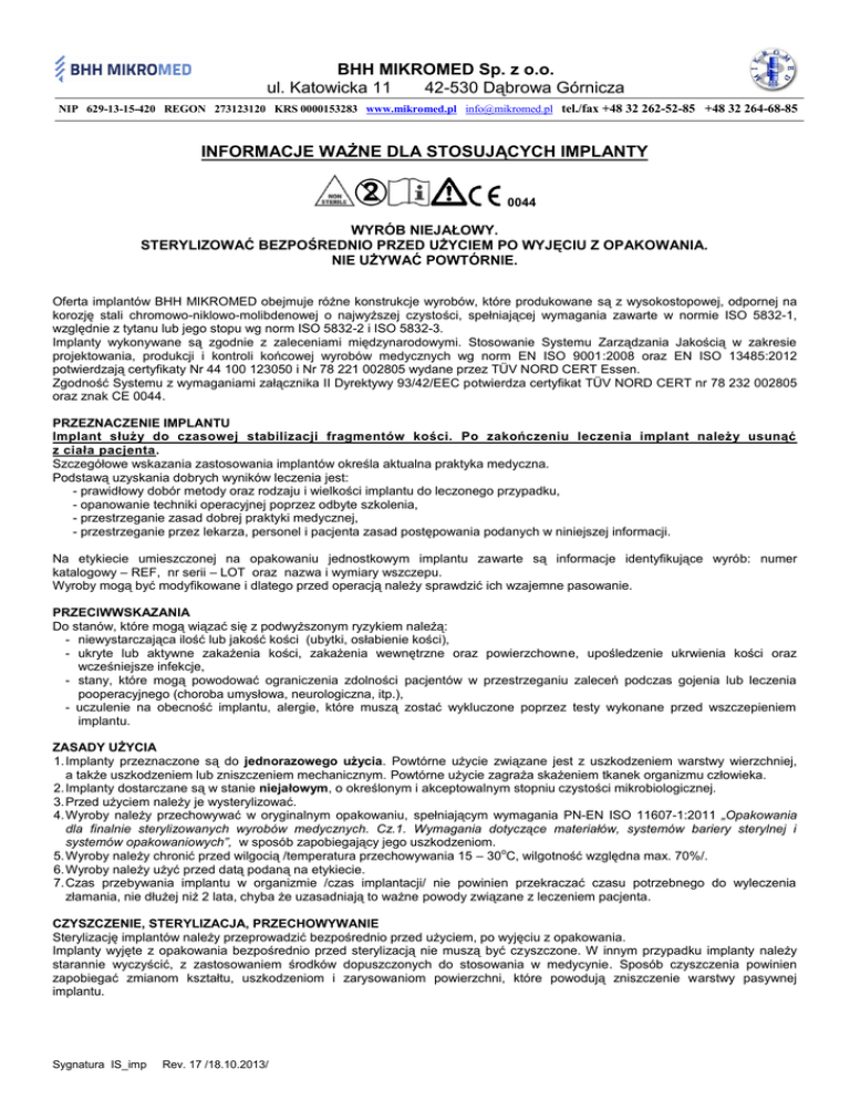 BHH MIKROMED Sp. z o.o. ul. Katowicka 11 42-530 Dąbrowa Górnicza NIP 629-13-15-420 REGON 273123120 KRS 0000153283 www.mikromed.pl [email protected] tel./fax +48 32 262-52-85 +48 32 264-68-85 INFORMACJE WAŻNE DLA STOSUJĄCYCH IMPLANTY 0044 WYRÓB NIEJAŁOWY. STERYLIZOWAĆ BEZPOŚREDNIO PRZED UŻYCIEM PO WYJĘCIU Z OPAKOWANIA. NIE UŻYWAĆ POWTÓRNIE. Oferta implantów BHH MIKROMED obejmuje różne konstrukcje wyrobów, które produkowane są z wysokostopowej, odpornej na korozję stali chromowo-niklowo-molibdenowej o najwyższej czystości, spełniającej wymagania zawarte w normie ISO 5832-1, względnie z tytanu lub jego stopu wg norm ISO 5832-2 i ISO 5832-3. Implanty wykonywane są zgodnie z zaleceniami międzynarodowymi. Stosowanie Systemu Zarządzania Jakością w zakresie projektowania, produkcji i kontroli końcowej wyrobów medycznych wg norm EN ISO 9001:2008 oraz EN ISO 13485:2012 potwierdzają certyfikaty Nr 44 100 123050 i Nr 78 221 002805 wydane przez TÜV NORD CERT Essen. Zgodność Systemu z wymaganiami załącznika II Dyrektywy 93/42/EEC potwierdza certyfikat TÜV NORD CERT nr 78 232 002805 oraz znak CE 0044. PRZEZNACZENIE IMPLANTU Implant służy do czasowej stabilizacji fragmentów kości. Po zakończeniu leczenia implant należy usunąć z ciała pacjenta. Szczegółowe wskazania zastosowania implantów określa aktualna praktyka medyczna. Podstawą uzyskania dobrych wyników leczenia jest: - prawidłowy dobór metody oraz rodzaju i wielkości implantu do leczonego przypadku, - opanowanie techniki operacyjnej poprzez odbyte szkolenia, - przestrzeganie zasad dobrej praktyki medycznej, - przestrzeganie przez lekarza, personel i pacjenta zasad postępowania podanych w niniejszej informacji. Na etykiecie umieszczonej na opakowaniu jednostkowym implantu zawarte są informacje identyfikujące wyrób: numer katalogowy – REF, nr serii – LOT oraz nazwa i wymiary wszczepu. Wyroby mogą być modyfikowane i dlatego przed operacją należy sprawdzić ich wzajemne pasowanie. PRZECIWWSKAZANIA Do stanów, które mogą wiązać się z podwyższonym ryzykiem należą: - niewystarczająca ilość lub jakość kości (ubytki, osłabienie kości), - ukryte lub aktywne zakażenia kości, zakażenia wewnętrzne oraz powierzchowne, upośledzenie ukrwienia kości oraz wcześniejsze infekcje, - stany, które mogą powodować ograniczenia zdolności pacjentów w przestrzeganiu zaleceń podczas gojenia lub leczenia pooperacyjnego (choroba umysłowa, neurologiczna, itp.), - uczulenie na obecność implantu, alergie, które muszą zostać wykluczone poprzez testy wykonane przed wszczepieniem implantu. ZASADY UŻYCIA 1. Implanty przeznaczone są do jednorazowego użycia. Powtórne użycie związane jest z uszkodzeniem warstwy wierzchniej, a także uszkodzeniem lub zniszczeniem mechanicznym. Powtórne użycie zagraża skażeniem tkanek organizmu człowieka. 2. Implanty dostarczane są w stanie niejałowym, o określonym i akceptowalnym stopniu czystości mikrobiologicznej. 3. Przed użyciem należy je wysterylizować. 4. Wyroby należy przechowywać w oryginalnym opakowaniu, spełniającym wymagania PN-EN ISO 11607-1:2011 „Opakowania dla finalnie sterylizowanych wyrobów medycznych. Cz.1. Wymagania dotyczące materiałów, systemów bariery sterylnej i systemów opakowaniowych”, w sposób zapobiegający jego uszkodzeniom. o 5. Wyroby należy chronić przed wilgocią /temperatura przechowywania 15 – 30 C, wilgotność względna max. 70%/. 6. Wyroby należy użyć przed datą podaną na etykiecie. 7. Czas przebywania implantu w organizmie /czas implantacji/ nie powinien przekraczać czasu potrzebnego do wyleczenia złamania, nie dłużej niż 2 lata, chyba że uzasadniają to ważne powody związane z leczeniem pacjenta. CZYSZCZENIE, STERYLIZACJA, PRZECHOWYWANIE Sterylizację implantów należy przeprowadzić bezpośrednio przed użyciem, po wyjęciu z opakowania. Implanty wyjęte z opakowania bezpośrednio przed sterylizacją nie muszą być czyszczone. W innym przypadku implanty należy starannie wyczyścić, z zastosowaniem środków dopuszczonych do stosowania w medycynie. Sposób czyszczenia powinien zapobiegać zmianom kształtu, uszkodzeniom i zarysowaniom powierzchni, które powodują zniszczenie warstwy pasywnej implantu. Sygnatura IS_imp Rev. 17 /18.10.2013/ Postępowanie obejmujące czyszczenie, dezynfekcję i sterylizację, potrzebne do przygotowania wyrobu medycznego do zastosowania zgodnie z jego przeznaczeniem powinno być zgodne z instrukcją opartą na wymaganiach normy PN-EN ISO 17664:2005 „Sterylizacja wyrobów medycznych. Informacje dostarczane przez wytwórcę w celu postępowania z wyrobami medycznymi przeznaczonymi do ponownej sterylizacji”. Proces sterylizacji musi być odpowiednio zaplanowany oraz przeprowadzony i zwalidowany zgodnie z normą PN-EN ISO 176651:2008 „Sterylizacja produktów stosowanych w ochronie zdrowia – Ciepło wilgotne. Cz.1. Wymagania dotyczące opracowania, walidacji i rutynowej kontroli procesu sterylizacji wyrobów medycznych”. Walidacja musi być przeprowadzona w odniesieniu do wszystkich wyrobów medycznych. Implanty sterylne muszą spełniać wymagania normy PN EN 556-1:2002 „Sterylizacja wyrobów medycznych. Wymagania dotyczące wyrobów medycznych określonych jako sterylne. Cz.1. Wymagania dotyczące finalnie sterylizowanych wyrobów medycznych”, dotyczącej zapewnienia jałowości na poziomie 1/1000 000, co oznacza, że prawdopodobieństwo znalezienia na wysterylizowanym wszczepie zdolnych do życia drobnoustrojów nie przekracza jednej milionowej. Na podstawie Farmakopei Polskiej VII zaleca się sterylizację parą wodną pod ciśnieniem w autoklawach (sterylizatorach o parowych) zgodnie z obowiązującymi procedurami, w temperaturze 121 C, przy nadciśnieniu 1 atm. w czasie 20 min lub o w temperaturze 134 C, nadciśnienie 2 atm. w czasie 10 min. Parametry te należy przyjąć jako minimalne. Implanty mogą być sterylizowa