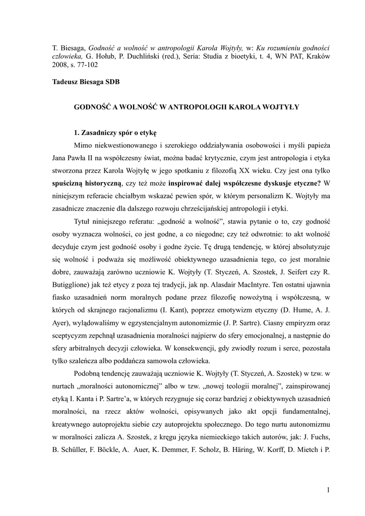 T. Biesaga, Godność a wolność w antropologii Karola Wojtyły, w: Ku rozumieniu godności człowieka, G. Hołub, P. Duchliński (red.), Seria: Studia z bioetyki, t. 4, WN PAT, Kraków 2008, s. 77-102 Tadeusz Biesaga SDB GODNOŚĆ A WOLNOŚĆ W ANTROPOLOGII KAROLA WOJTYŁY 1. Zasadniczy spór o etykę Mimo niekwestionowanego i szerokiego oddziaływania osobowości i myśli papieża Jana Pawła II na współczesny świat, można badać krytycznie, czym jest antropologia i etyka stworzona przez Karola Wojtyłę w jego spotkaniu z filozofią XX wieku. Czy jest ona tylko spuścizną historyczną, czy też może inspirować dalej współczesne dyskusje etyczne? W niniejszym referacie chciałbym wskazać pewien spór, w którym personalizm K. Wojtyły ma zasadnicze znaczenie dla dalszego rozwoju chrześcijańskiej antropologii i etyki. Tytuł niniejszego referatu: „godność a wolność”, stawia pytanie o to, czy godność osoby wyznacza wolności, co jest godne, a co niegodne; czy też odwrotnie: to akt wolność decyduje czym jest godność osoby i godne życie. Tę drugą tendencję, w której absolutyzuje się wolność i podważa się możliwość obiektywnego uzasadnienia tego, co jest moralnie dobre, zauważają zarówno uczniowie K. Wojtyły (T. Styczeń, A. Szostek, J. Seifert czy R. Butigglione) jak też etycy z poza tej tradycji, jak np. Alasdair MacIntyre. Ten ostatni ujawnia fiasko uzasadnień norm moralnych podane przez filozofię nowożytną i współczesną, w których od skrajnego racjonalizmu (I. Kant), poprzez emotywizm etyczny (D. Hume, A. J. Ayer), wylądowaliśmy w egzystencjalnym autonomizmie (J. P. Sartre). Ciasny empiryzm oraz sceptycyzm zepchnął uzasadnienia moralności najpierw do sfery emocjonalnej, a następnie do sfery arbitralnych decyzji człowieka. W konsekwencji, gdy zwiodły rozum i serce, pozostała tylko szaleńcza albo poddańcza samowola człowieka. Podobną tendencję zauważają uczniowie K. Wojtyły (T. Styczeń, A. Szostek) w tzw. w nurtach „moralności autonomicznej” albo w tzw. „nowej teologii moralnej”, zainspirowanej etyką I. Kanta i P. Sartre’a, w których rezygnuje się coraz bardziej z obiektywnych uzasadnień moralności, na rzecz aktów wolności, opisywanych jako akt opcji fundamentalnej, kreatywnego autoprojektu siebie czy autoprojektu społecznego. Do tego nurtu autonomizmu w moralności zalicza A. Szostek, z kręgu języka niemieckiego takich autorów, jak: J. Fuchs, B. Schüller, F. Böckle, A. Auer, K. Demmer, F. Scholz, B. Häring, W. Korff, D. Mietch i P. 1 T. Biesaga, Godność a wolność w antropologii Karola Wojtyły, w: Ku rozumieniu godności człowieka, G. Hołub, P. Duchliński (red.), Seria: Studia z bioetyki, t. 4, WN PAT, Kraków 2008, s. 77-102 Knauer, z kręgu języka angielskiego i włoskiego: R. McCormick, C. Curran, J. G. Milhaven, L. Janssens, W. van der Marck, J. M. Aubert, E. Chiavacci, A Morlinaro i inni1. Podobnie jak w ogólnej teorii etycznej, również na terenie praktycznych rozstrzygnięć etycznych absolutyzuje się wolność, mówiąc np. o godnej śmierci tylko jako takiej, która jest przeze mnie spowodowana, lub o godnym lub niegodnych życiu jako takimi, które spełnia, czy nie spełnia moich oczekiwań. Ową wolnością, uzbrojoną we współczesne możliwości biotechnologii, chce też ingerować, zmieniać i projektować naturę człowieka. Wydaje się, że w zasadniczym sporze o etykę, zarówno z owym humanizmem technokratycznym, jak też z personalizmem idealistycznym czy transcendentalnym, wiele może wnieść personalizm realistyczny K. Wojtyły. Łączy on bowiem w sobie filozofię podmiotową z filozofia przedmiotową, filozofię świadomości z metafizyką klasyczną, i w tej opcji, nie rezygnuje ze stawiania wolności ludzkiej wymagań, bez których stałaby się ślepą siłą w człowieku. 2. Wolność w polu aksjologicznym godności osoby W Miłości i odpowiedzialności K. Wojtyła skupia się zasadniczo na godności osoby i rozwija etykę personalistyczną krytykując różne formy utylitaryzmu, natomiast w Osobie i czynie bada zasadniczo strukturę wolności. W pierwszym z wymienionych dzieł, z pozycji godności osoby, branej ontologicznie i aksjologicznie, stawia Wojtyła określone wymagania wolności. Zasadniczym wymaganiem jest to, że wolność nie powinna używać zarówno własnej jak i innej osoby jako środka do celu innego, poza samą osobą. Z tej perspektywy Wojtyła nakreśla zarówno granice wolności ludzkiej jak i boskiej, gdy pisze: „nikt nie może posługiwać się osobą jako środkiem do celu: ani żaden człowiek, ani nawet Bóg-Stwórca”2. Bóg bowiem respektuje, a powinien to czynić również i człowiek, cele wpisane w rozumną naturę osoby ludzkiej. Człowiek poznając je, powinien w sposób wolny je zaafirmować i realizować. Autoteleologia osoby nie powinna być oderwana od teleologii natury. To godność wraz z naturą osoby wyznacza wolności dobro, które powinna ona realizować. Godność wskazuje, że to osoba jest wartością wartości, a nie odwrotnie, jakoby 1 A. Szostek, Natura, rozum, wolność. Filozoficzna analiza koncepcji twórczego rozumu we współczesnej teologii moralnej, Rzym 1990, s. 20 2 K. Wojtyła, Miłość i odpowiedzialność, w: Człowiek i moralność t. 1, red. T. Styczeń, J. W. Gałkowski, A. Rodziński, A. Szostek, TN KUL, Lublin 1982, s. 29 2 T. Biesaga, Godność a wolność w antropologii Karola Wojtyły, w: Ku rozumieniu godności człowieka, G. Hołub, P. Duchliński (red.), Seria: Studia z bioetyki, t. 4, WN PAT, Kraków 2008, s. 77-102 pewne wartości w osobie, stanowiły o jej osobowej godności. „Wartość samej osoby – pisze Wojtyła – należy wyraźnie odróżnić od różnych wartości, które tkwią w osobie. Są to wartości wrodzone lub nabyte (…). Wartość osoby związana jest z całym bytem osoby (…)” 3. Mimo, że poprzez wrażenia, wartości w osobie narzucają nam się