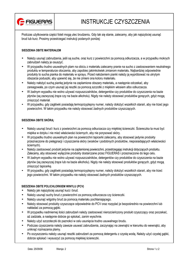 INSTRUKCJE CZYSZCZENIA Podczas użytkowania części foteli mogą ulec brudzeniu. Gdy tak się stanie, zalecamy, aby jak najszybciej usunąć brud lub kurz. Prosimy przestrzegać instrukcji podanych poniżej: SIEDZENIA OBITE MATERIAŁEM • • • • • Należy usunąć zabrudzenia, jeśli są suche, oraz kurz z powierzchni za pomocą odkurzacza, a w przypadku mokrych zabrudzeń należy je osuszyć. W przypadku trudno usuwalnych plam na obiciu z materiału zalecamy pranie na sucho z zastosowaniem neutralnego produktu w temperaturze otoczenia, aby zapobiec jakimkolwiek zmianom materiału. Najbardziej odpowiednie produkty to sucha pianka do materiału w sprayu. Przed nałożeniem pianki należy ją wypróbować na ukrytym obszarze poduszki, aby upewnić się, że nie zmieni ona koloru materiału. Należy nałożyć suchą piankę jedynie na zaplamione obszary materiału, a następnie odczekać, aby zareagowała, po czym usunąć jej resztki za pomocą szczotki z miękkim włosiem albo odkurzacza. W żadnym wypadku nie wolno używać rozpuszczalników, detergentów czy produktów do czyszczenia na bazie płynów (są zazwyczaj żrące czy na bazie alkoholu). Nigdy nie należy stosować produktów gorących, gdyż mogą zniszczyć materiał. W przypadku, gdy zagłówki posiadają termoprzyplepny numer, należy dołożyć wszelkich starań, aby nie trzeć jego powierzchni. W takim przypadku nie należy stosować żadnych produktów czyszczących. SIEDZENIA OBITE SKÓRĄ: • • • • • Należy usunąć brud i kurz z powierzchni za pomocą odkurzacza czy miękkiej ściereczki. Ściereczka ta musi być miękka w dotyku i nie mieć właściwości ściernych, aby nie porysować skóry. W przypadku trudno usuwalnych plan na powierzchni tapicerki zalecamy, aby stosować jedynie produkty przeznaczone do pielęgnacji i czyszczenia skóry (wosków i podobnych produktów, nieposiadających właściwości ściernych). Należy zastosować produkt jedynie na zaplamionej powierzchni, przestrzegając instrukcji dotyczących produktu. Zalecamy, aby stosować wyłącznie produkty dostarczane przez FIGUERAS i przeznaczone do tego celu. W żadnym wypadku nie wolno używać rozpuszczalników, detergentów czy produktów do czyszczenia na bazie płynów (są zazwyczaj żrące lub na bazie alkoholu). Nigdy nie należy stosować produktów gorących, gdyż mogą zniszczyć tapicerkę. W przypadku, gdy zagłówki posiadają termoprzyplepny numer, należy dołożyć wszelkich starań, aby nie trzeć jego powierzchni. W takim przypadku nie należy stosować żadnych produktów czyszczących. SIEDZENIA OBITE POLICHLORKIEM WINYLU (PCV) • • • • • • • • Należy jak najszybciej usunąć kurz i brud. Należy usunąć suchy brud z powierzchni za pomocą odkurzacza czy ściereczki. Należy usunąć wilgotny brud za pomocą materiału pochłaniającego. Należy stosować produkty czyszczące odpowiednie do PCV oraz rozpylać je bezpośrednio na powierzchni lub nakładać za pomocą gąbki. W przypadku nadmiernej ilości zabrudzeń należy zastosować nierozcieńczony produkt czyszczący oraz poczekać, aż zadziała, a następnie dobrze go spłukać, zanim wyschnie. Należy użyć szczoteczki do paznokci w celu usunięcia trudno usuwalnego brudu. Podczas czyszczenia należy zawsze usuwać zabrudzenia, zaczynając na zewnątrz w kierunku do wewnątrz, aby uniknąć rozmazania plamy. Po oczyszczeniu należy usunąć resztki zabrudzeń za pomocą detergentu z czystą wodą. Należy użyć czystej gąbki, dobrze spłukać i wysuszyć za pomocą miękkiej ściereczki. Data: 25/09/06 Wersja: 2 Strona 1 z 2 Zalecenia: • • Nie należy stosować produktów czyszczących, zawierających organiczne rozpuszczalniki. Należy stosować produkty czyszczące o neutralnym pH w celu ochrony PCV. DREWNIANE ELEMENTY, NOŻKI, POMALOWANE POWIERZCHNIE METALOWE I INNE WIDOCZNE CZĘŚCI: • W przypadku części plastikowych należy jak najszybciej usunąć kurz i potencjalne plamy za pomocą wilgotnej ściereczki i wody. Proszę pamiętać, by stosować ściereczkę bawełnianą lub inny miękki materiał, w przeciwnym wypadku może dojść do zarysowania powierzchni. • W przypadku pomalowanych powierzchni metalowych należy stosować wyłącznie wilgotną ściereczkę i wodę. Nigdy nie należy stosować detergentów, rozpuszczalników ani innych produktów czyszczących, ponieważ wykończenie mogłoby ulec zniszczeniu. Należy zawsze stosować miękkie ściereczki w celu uniknięcia wszelkich zadrapań. • W przypadku nóżek czy innych pomalowanych powierzchni, stosować jedynie wodę z odrobiną obojętnego detergentu. Nie należy używać wybielaczy czy innych produktów czyszczących, które nie są obojętne, lecz żrące, ponieważ mogą uszkodzić pomalowaną powierzchnię. • W przypadku drewnianych polakierowanych podłokietników siedzeń należy stosować wyłącznie wilgotną, miękką ściereczkę i wodę. Jakikolwiek detergent czy rozpuszczalnik zniszczy ich powierzchnię. Do mebli mogą Państwo wykorzystać produkty stosowane do polerowania drewna. FIGUERAS zrzeka się wszelkiej odpowiedzialności za czyszczenie, które zostało przeprowadzone w inny sposób, niezgodny z niniejszymi instrukcjami - nieprzestrzeganie ich prowadzi do wygaśnięcia wszelkich gwarancji udzielonych odnośnie do produktu w ramach niniejszej umowy. Sprawdził: Kierownik ds. Technicznych Zatwierdził: Dział jakości Data: 25/09/06 R.Sancho Data: 25/09/06 I. Nadal Wersja: 2 Strona 2 z 2