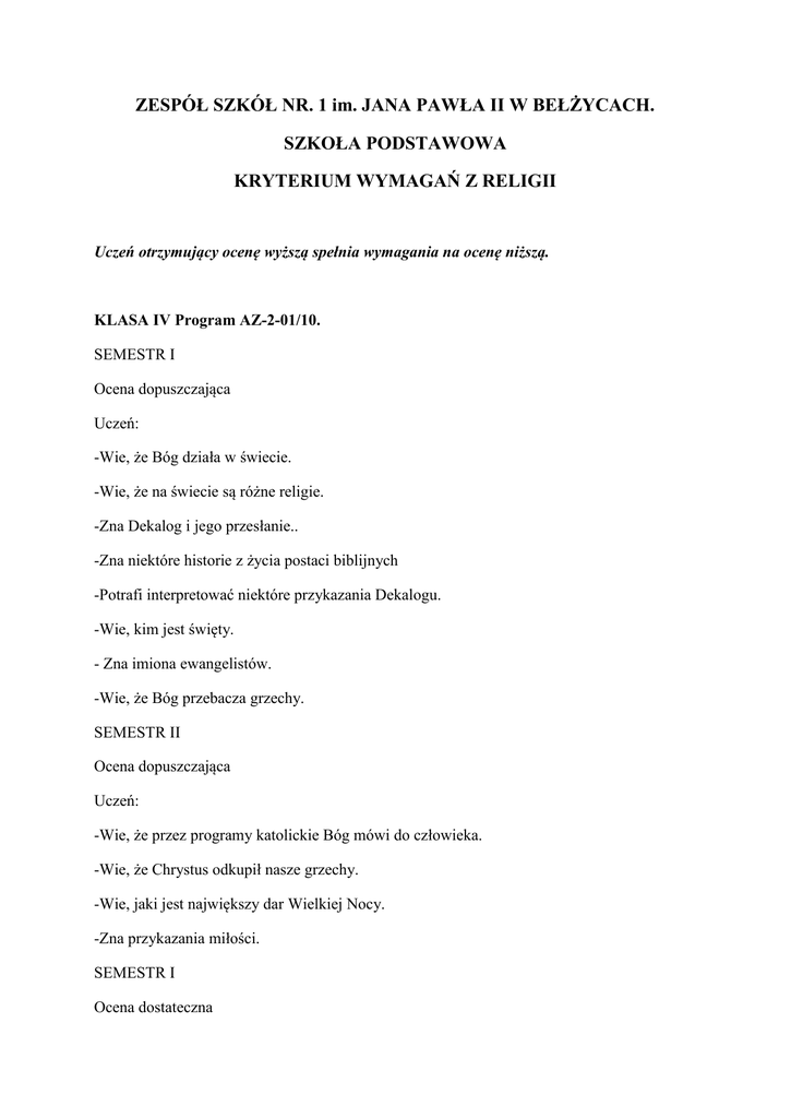 ZESPÓŁ SZKÓŁ NR. 1 im. JANA PAWŁA II W BEŁŻYCACH. SZKOŁA PODSTAWOWA KRYTERIUM WYMAGAŃ Z RELIGII Uczeń otrzymujący ocenę wyższą spełnia wymagania na ocenę niższą. KLASA IV Program AZ-2-01/10. SEMESTR I Ocena dopuszczająca Uczeń: -Wie, że Bóg działa w świecie. -Wie, że na świecie są różne religie. -Zna Dekalog i jego przesłanie.. -Zna niektóre historie z życia postaci biblijnych -Potrafi interpretować niektóre przykazania Dekalogu. -Wie, kim jest święty. - Zna imiona ewangelistów. -Wie, że Bóg przebacza grzechy. SEMESTR II Ocena dopuszczająca Uczeń: -Wie, że przez programy katolickie Bóg mówi do człowieka. -Wie, że Chrystus odkupił nasze grzechy. -Wie, jaki jest największy dar Wielkiej Nocy. -Zna przykazania miłości. SEMESTR I Ocena dostateczna Uczeń: -Zna treść ośmiu błogosławieństw. -Potrafi wymienić niektóre wielkie religie świata. -Zna konsekwencje utraty wiary(stan grzechu, smutek, samotność). -Zna tajemnice różańca świętego. -Wie, kiedy Kościół obchodzi Uroczystość Wszystkich Świętych. -Wie, co to znaczy, że Bóg jest miłosierny. -Dostrzega działanie Boga w świecie. - Zna Dekalog i jego interpretację. -Umie, odczytywać przesłanie poznanych tekstów biblijnych. -Potrafi podać przykłady prawdziwej przyjaźni. -Wyjaśnia pojęcia ,,ewangelia” , ,,ewangeliści”. -Wymienia podstawowe zadania aniołów. SEMESTR II Ocena dostateczna Uczeń: -Potrafi rozwiązywać sytuacje konfliktowe w duchu przesłania biblijnego. -Buduje wspólnotę z Bogiem i ludźmi: w rodzinie, w szkole, grupie koleżeńskiej. -Podejmuje próby pracy nad kształtowaniem własnego charakteru. -Zna uczynki miłosierne względem duszy i względem ciała. -Potrafi wymienić znane mass media. -Zna istotę i sens sakramentu pokuty. -Zna podstawowe wartości moralne. -Wymienia miejsca i formy modlitwy. -Zna podstawowe wydarzenia z życia króla Dawida. SEMESTR I Ocena dobra Uczeń: -Potrafi znaczenie wybranych błogosławieństw. -Zna stałe części Mszy świętej. -Zna elementy charakterystyczne dla wielkich religii świata. -Potrafi rozwijać w sobie wiarę. -Zna tajemnice różańca świętego, potrafi opisać wydarzenia, z jakimi są związane. -Potrafi wyjaśnić sens Uroczystości Wszystkich Świętych. -Podaje układ liturgii słowa. -Zna najważniejsze wydarzenia roku liturgicznego. -Zna warunki dobrej spowiedzi. -Podaje liczbę ksiąg Nowego Testamentu. -Wyjaśnia różnicę pomiędzy ,,twórcą” a ,,Stwórcą”. SEMESTR II Ocena dobra Uczeń: -Wie, że Bóg jest jeden, ale w Trzech Osobach. -Rozumie potrzebę okazywania miłosierdzi wobec innych. -Potrafi wyjaśnić sens przykazań nakazujących świętowanie niedzieli i świąt. -Zna i rozumie treść (Mt 22, 2-4.10). -Wie, że Ziemia Obiecana jest zapowiedzią nieba. -Wie, czym jest sumienie. -Potrafi interpretować uczynki miłosierne. SEMESTR I Ocena bardzo dobra Uczeń: -Potrafi zastosować w życiu wskazania ewangelicznych błogosławieństw. -Definiuje pojęcia grzech śmiertelny i powszedni. -Rozumie, że do ludzi innych wyznań należy odnosić się z szacunkiem. -Podaje przykłady troski o wiarę. -Umie wyjaśnić, co oznacza „świętych obcowanie”. -Potrafi wyjaśnić okoliczności objawienia się Boga(Mojżesz). z-Potrafi podać przykłady miłosierdzi Jezusa wobec ludzi. -Zna biblijny poemat o stworzeniu świata (Rdz1,1-31)i człowieka(Rdz1,26-27; 18, 21-23) potrafi wyjaśnić jego sens. -Wymienia podstawowe wydarzenia z życia Abrahama. -Wie, co to jest czyściec i jaka jest jego rola, rozumie potrzebę modlitwy za zmarłych. -Potrafi powiedzieć, jakie jest główne przesłanie Listu do Rodzin Jana Pawła II. -Potrafi dawać świadectwo wiary w podstawowych sytuacjach życiowych. -Integruje wydarzenia biblijne z aktualnymi wyzwaniami życiowymi. -Integruje wydarzenia biblijne z liturgią. -Definiuje pojęcie ,,wspólnota Kościoła”. -Definiuje czym jest Objawienie Boże. -Wymienia wybrane księgi ze Starego Testamentu. -Wymienia kilka ksiąg Nowego Testamentu oraz ich autorów. -Podaje znaczenie kilku skrótów biblijnych. -Opowiada historię Mojżesza. -Wyjaśnia symbolikę darów eucharystycznych. SEMESTR II Ocena bardzo dobra Uczeń: -Potrafi podać przykłady katolickich programów. -Wyjaśnia misję Jana Chrzciciela. -Zna podstawowe wydarzenia z życia Salomona. -Zna historię Kaina i Abla. -Zna historię wieży Babel. -Zna historię Hioba. -Zna formy zadośćuczynienia. -Wie, przez co uczestniczymy w zmartwychwstaniu Chrystusa, zna fragmenty Pisma św. mówiące o zmartwychwstaniu. -Zna treść Ewangelii „o niewiernym Tomaszu”. -Umie wymienić skutki sakramentu namaszczenia chorych. -Łączy osoby i wydarzenia Starego Testamentu z osobami i wydarzeniami Nowego Testamentu. -Odczytuje i zapisuje współrzędne tekstu biblijnego. SEMESTR I Ocena celująca Uczeń: -Wie, w jakich częściach świata występują wielkie religie. -Potrafi wyjaśnić sens modlitwy do świętych i za zmarłych. -Potrafi w oparciu o teksty biblijne określić możliwości twórcze człowieka. -Nawiązuje przez modlitwę sposoby umacniania przyjaźni z Jezusem. SEMESTR II Ocena celująca Uczeń: -Potrafi przedstawić sens i znaczenie sakramentu namaszczenia chorych. -Rozumie sens jałmużny. -Zna treść ośmiu błogosławieństw. -Umie wyjaśnić związek przejścia Izraelitów przez Morze Czerwone z Paschą. -Zna zasady postępowania w czasie wizyty kapłana u chorego.