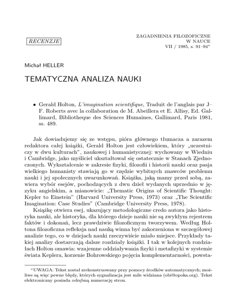 RECENZJE ZAGADNIENIA FILOZOFICZNE W NAUCE VII / 1985, s. 91–94∗ Michał HELLER TEMATYCZNA ANALIZA NAUKI • Gerald Holton, L’imagination scientifique, Traduit de l’anglais par J– F. Roberts avec la collaboration de M. Abeillera et E. Allisy, Ed. Gallimard, Bibliotheque des Sciences Humaines, Gallimard, Paris 1981, ss. 489. Jak dowiadujemy się ze wstępu, pióra głównego tłumacza a zarazem redaktora całej książki, Gerald Holton jest człowiekiem, który „uczestniczy w dwu kulturach”, naukowej i humanistycznej: wychowany w Wiedniu i Cambridge, jako myśliciel ukształtował się ostatecznie w Stanach Zjednoczonych. Wykształcenie w zakresie fizyki, filozofii i historii nauki oraz pasja wielkiego humanisty stawiają go w rzędzie wybitnych znawców problemu nauki i jej społecznych uwarunkowań. Książka, jaką mamy przed sobą, zawiera wybór esejów, pochodzących z dwu dzieł wydanych uprzednio w języku angielskim, a mianowicie: „Thematic Origins of Scientific Thought: Kepler to Einstein” (Harvard University Press, 1973) oraz „The Scientific Imagination: Case Studies” (Cambridge University Press, 1978). Książkę otwiera esej, ukazujący metodologiczne credo autora jako historyka nauki, ale historyka, dla którego dzieje nauki nie są zwykłym rejestrem faktów i dokonań, lecz prawdziwie filozoficznym tworzywem. Według Holtona filozoficzna refleksja nad nauką winna być zakorzeniona w szczegółowej analizie tego, co w dziejach nauki rzeczywiście miało miejsce. Przykłady takiej analizy dostarczają dalsze rozdziały książki. I tak w kolejnych rozdziałach Holton omawia: wzajemne oddziaływania fizyki i metafizyki w systemie świata Keplera, korzenie Bohrowskiego pojęcia komplementarności, powsta∗ UWAGA: Tekst został zrekonstruowany przy pomocy środków automatycznych; możliwe są więc pewne błędy, których sygnalizacja jest mile widziana ([email protected]). Tekst elektroniczny posiada odrębną numerację stron. 2 Michał HELLER nie szczególnej teorii względności, poglądy Einsteina na ewolucję i strukturę naukowych teorii, rolę grupy Fermiego w rozwoju nowoczesnej fizyki we Włoszech. Wszystkie te rozdziały mają charakter oryginalnych badań, przeprowadzonych w oparciu o drobiazgową analizę źródeł, często dotychczas nieopublikowanych. Ale badaniom tym zawsze towarzyszy szersza perspektywa filozoficzna lub socjologiczna. Ostatnia grupa esejów ma nieco odmienny charakter. Autor zastanawia się w nich kolejno nad rozmaitymi modelami pozwalającymi zrozumieć aktualny postęp w badaniach naukowych; w szczególności nad dwoma współczesnymi podejściami do nauki: romantycznym, pełnym zastrzeżeń i nieufności wobec nauki (”dionizeńskim” — jak je nazywa Holton) i racjonalistycznym, wywodzącym się z empiryzmu logicznego (”apaollińskim”); a także nad psychologicznymi uwarunkowaniami naukowców w odniesieniu da zagadnień społecznych. Niektóre z rozważań Holtona (np. ostatni esej) mają charakter jakby ekspertyzy, starającej się rozpoznać teren, by ułatwić sterowanie nauką. Jednakże autor odnosi się zawsze z dużą ostrożnością do tzw. „polityki naukowej” sądząc, że winna ona co najwyżej wykorzystywać „wewnętrzne dynamizmy” samej nauki. Chciałbym z nieco większą uwagą zatrzymać się nad dwoma esejami zamieszczonymi w omawianej książce. Pierwszy to wspomniany już esej pt. „Las themata dans le pensee scientcifique”, zawierający ogólne poglądy Holtona, na historię nauki, lub — może trafniej — coś w rodzaju jego programu uprawiania tej dyscypliny. Historyk nauki bada zwykle jakieś zjawisko (evenement); oznaczmy je przez E. Holton wyróżnia dziewięć aspektów, które powinny zostać poddane badaniom, by zjawisko E stało się czymś zrozumiałym. Oto te aspekty: 1) uchwycenie „naukowej zawartości” zjawiska E w danej epoce i w języku danej epoki; 2) odtworzenie „trajektorii w czasie” zjawiska E, tzn. zrekonstruowanie ewolucji pojęć, która doprowadziła do E; 3) przebadanie „aspektu osobowego” czyli „kontekstu odkrycia” zjawiska E; 4) próba rekonstrukcji przecięcia trajektorii prywatnej ewolucji odkrywcy z trajektorią rozwoju „nauki publicznej”; 5) studium „ewolucji psychobiograficznej” indywidualnych osób związanych z E; 6) badania socjologiczne środowiska, w jakim zaszło E; 7) zmiany kulturowe pozanaukowe, związane z zaistnieniem E; 8) analiza logiczna zjawiska E; i wreszcie 9) „analiza tematyczna” zjawiska E. Ten ostatni aspekt jest novum, pochodzącym od samego Holtona. „W pewnej liczbie pojęć, metod i hipotez lub twierdzeń naukowych — pisze Holton — dawnych lub współczesnych, można znaleźć pewne ele- TEMATYCZNA ANALIZA NAUKI 3 menty, spełniające funkcje themata; ograniczają one lub stymulują poszczególne jednostki, niejednokrotnie określając orientację (normę) czy polaryzację w naukowej wspólnocie” (s. 27). Themata działają przeważnie z ukrycia, zwykle nie można ich znaleźć w skorowidzach naukowych monografii. Pojęcia tematyczne często występują w parach (niekiedy w triadach); np.: ewolucja–inwolucja, zmienność–niezmienność, złożoność– prostota, redukcjonizm–holizm, hierarchiczność–jedność... Zdaniem Holtona, zadziwiająca jest stosunkowo niewielka liczba tego rodzaju pojęć tematycznych i ich trwałość. W dziejach fizyki Holton doliczył się ich niewiele ponad sto. Powstanie nowego pojęcia tematycznego jest rzadkością. Holton odnotowuje powstanie zaledwie dwu tego rodzaju pojęć we współczesnej fizyce: pojęcie komplementarności i pojęcie chiralności. Themata przeżywają zwykle kolejne rewolucje naukowe, zapewniając rozwojowi nauki cechę ciągłości. Analiza tematyczna jest specjalnością Holtoną. Motyw tej analizy przenika całą książkę. Drugim esejem, który zwrócił na siebie moją uwagę jest esej, występujący jako rozdział szóst