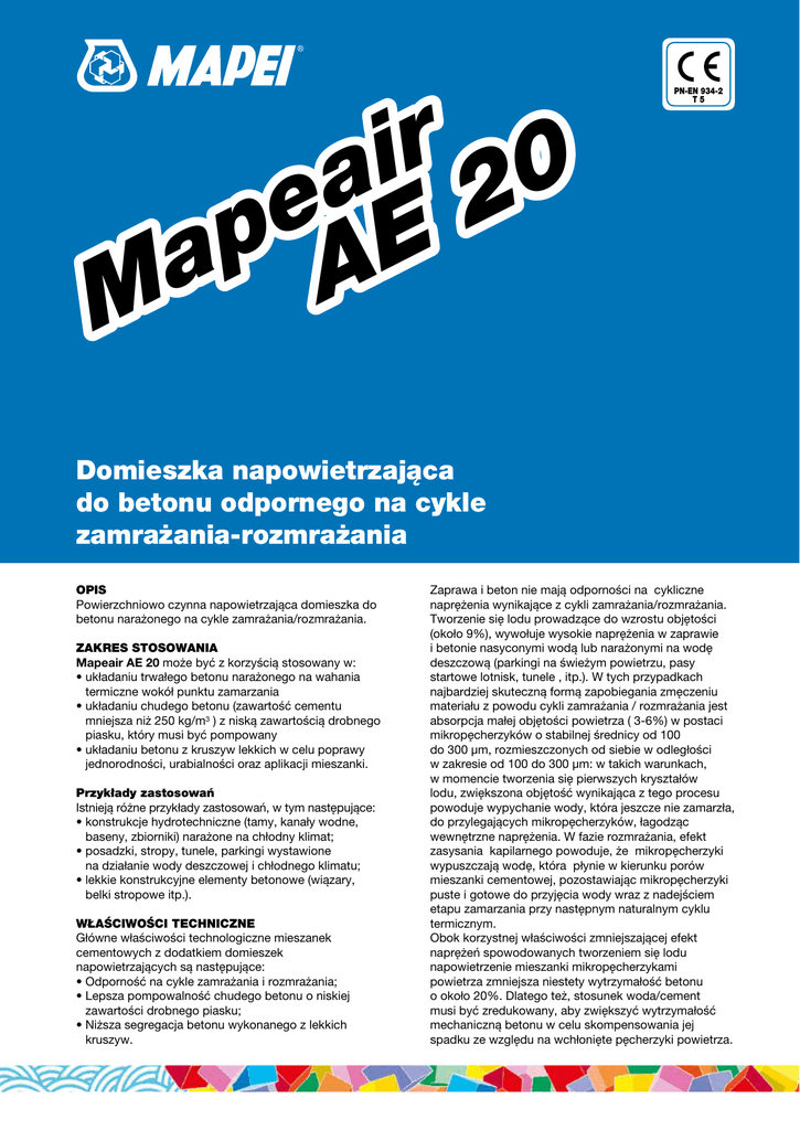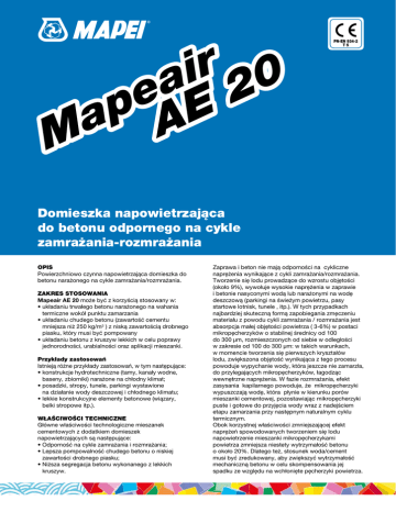r i 0 a 2 e p E a A M PN-EN 1504-3 934-2 PN-EN T5 Domieszka napowietrzająca do betonu odpornego na cykle zamrażania-rozmrażania OPIS Powierzchniowo czynna napowietrzająca domieszka do betonu narażonego na cykle zamrażania/rozmrażania. ZAKRES STOSOWANIA Mapeair AE 20 może być z korzyścią stosowany w: • układaniu trwałego betonu narażonego na wahania termiczne wokół punktu zamarzania • układaniu chudego betonu (zawartość cementu mniejsza niż 250 kg/m3 ) z niską zawartością drobnego piasku, który musi być pompowany • układaniu betonu z kruszyw lekkich w celu poprawy jednorodności, urabialności oraz aplikacji mieszanki. Przykłady zastosowań Istnieją różne przykłady zastosowań, w tym następujące: • konstrukcje hydrotechniczne (tamy, kanały wodne, baseny, zbiorniki) narażone na chłodny klimat; • posadzki, stropy, tunele, parkingi wystawione na działanie wody deszczowej i chłodnego klimatu; • lekkie konstrukcyjne elementy betonowe (wiązary, belki stropowe itp.). WŁAŚCIWOŚCI TECHNICZNE Główne właściwości technologiczne mieszanek cementowych z dodatkiem domieszek napowietrzających są następujące: • Odporność na cykle zamrażania i rozmrażania; • Lepsza pompowalność chudego betonu o niskiej zawartości drobnego piasku; • Niższa segregacja betonu wykonanego z lekkich kruszyw. Zaprawa i beton nie mają odporności na cykliczne naprężenia wynikające z cykli zamrażania/rozmrażania. Tworzenie się lodu prowadzące do wzrostu objętości (około 9%), wywołuje wysokie naprężenia w zaprawie i betonie nasyconymi wodą lub narażonymi na wodę deszczową (parkingi na świeżym powietrzu, pasy startowe lotnisk, tunele , itp.). W tych przypadkach najbardziej skuteczną formą zapobiegania zmęczeniu materiału z powodu cykli zamrażania / rozmrażania jest absorpcja małej objętości powietrza ( 3-6%) w postaci mikropęcherzyków o stabilnej średnicy od 100 do 300 µm, rozmieszczonych od siebie w odległości w zakresie od 100 do 300 µm: w takich warunkach, w momencie tworzenia się pierwszych kryształów lodu, zwiększona objętość wynikająca z tego procesu powoduje wypychanie wody, która jeszcze nie zamarzła, do przylegających mikropęcherzyków, łagodząc wewnętrzne naprężenia. W fazie rozmrażania, efekt zasysania kapilarnego powoduje, że mikropęcherzyki wypuszczają wodę, która płynie w kierunku porów mieszanki cementowej, pozostawiając mikropęcherzyki puste i gotowe do przyjęcia wody wraz z nadejściem etapu zamarzania przy następnym naturalnym cyklu termicznym. Obok korzystnej właściwości zmniejszającej efekt naprężeń spowodowanych tworzeniem się lodu napowietrzenie mieszanki mikropęcherzykami powietrza zmniejsza niestety wytrzymałość betonu o około 20%. Dlatego też, stosunek woda/cement musi być zredukowany, aby zwiększyć wytrzymałość mechaniczną betonu w celu skompensowania jej spadku ze względu na wchłonięte pęcherzyki powietrza. ir 0 a e 2 p Ma AE DANE TECHNICZNE WŁAŚCIWOŚCI PRODUKTU Postać: płyn Kolor: bezbarwny Gęstość objętościowa zgodnie z ISO 758: 1,01± 0,02 g/cm3 w +20ºC Główne działanie: domieszka napowietrzająca Działanie drugorzędne: Plastyfikator, wspomaga pompowalność i zmniejsza segregację chudego betonu Klasyfikacja zgodnie z UNI EN 934-2: domieszka napowietrzająca zgodnie z tablicą 5 Chlorki rozpuszczalne w wodzie zgodnie z EN 480-10: < 0,1% (nieobecne zgodnie z UNI EN 934-2) Zawartość alkaliów (równoważnik NA2O) zgodnie z EN 480-12: ≤ 2,0% pH: 8,5±1 Z tego powodu, zastosowaniu Mapeair AE 20 w betonie narażonym na cykle zamrażania/rozmrażania zawsze musi towarzyszyć zastosowanie superplastyfikatora (z linii Dynamon lub Chronos), zgodnie z wymaganymi rezultatami. Dzięki rozwojowi odkształcalnych kulistych mikropęcherzyków powietrza, Mapeair AE 20 rekompensuje brak materiału drobnoziarnistego w postaci piasku (100-300 µm ), który jest niezbędny do osiągnięcia dobrej pompowalności, zwłaszcza w przypadku chudego betonu o małej zawartości cementu. Ponadto, przez absorpcję powietrza w betonie wykonanym z użyciem keramzytu lub spienionego polistyrenu, następuje zmniejszenie skłonności kruszywa do „unoszenia się” (segregacji) z powodu mniejszej różnicy między gęstością kruszywa i mieszanki cementowej, która jest także lżejsza. W rezultacie konglomerat jest bardziej jednorodny, a więc jego właściwości termoizolacyjne są bardziej jednolite. ZALECENIA Nie stosować Mapeair AE 20 bez sprawdzenia za pomocą porozymetru objętości powietrza, które gromadzi się w betonie. W przypadku konieczności wykonywania mieszanek betonowych w klasie konsystencji S1, każdorazowo należy wykonać test kompatybilności domieszki oraz sprawdzić współdziałanie z konkretnym cementem. WYTYCZNE STOSOWANIA Do produkcji betonu odpornego na cykle zamrażania/rozmrażania, dawkę Mapeair AE 20, która wchłonie wymaganą zgodnie z maksymalną średnicą kruszywa objętość powietrza, należy wcześniej poddać testom w cementowni, stosując takie same składników (cement, piasek, duże kruszywo, itp.), jakie zostaną wykorzystane na budowie. Zgodnie z ogólną zasadą, dawka Mapeair AE 20 waha się od 0,2 do 0,8 l na 100 kg spoiwa (cementu oraz popiołu lotnego lub mikrokrzemionki). W rzeczywistości dokładne dozowanie, aby uzyskać wymaganą objętość powietrza w układanym betonie, zależy od następujących parametrów: • kształtu kruszywa (okrągłe lub kruszone); • wielkości ziaren piasku; • urabialności; • czasu i efektywności mieszania; • czasu transportu; • metody zagęszczania. Zaleca się dozowanie Mapeair AE 20 razem z wodą zarobową, a następnie dokładne mieszanie przez kilka minut, aby wspomóc rozwój wymaganej objętości powietrza. Efekt napowietrzania, który należy sprawdzić porozymetrem, jest wydajniejszy im płynniejsza jest mieszanka betonowa. Jeśli stosowane s