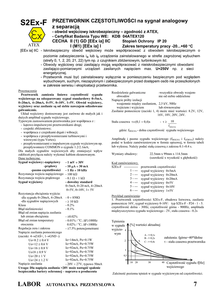 S2Ex-F PRZETWORNIK CZĘSTOTLIWOŚCI na sygnał analogowy z separacją - obwód wejściowy iskrobezpieczny – zgodność z ATEX, - Certyfikat Badania Typu WE: KDB 04ATEX120 CECHA II (1) GD [EEx ia] IIC Stopień Ochrony IP 20 I (M1) [EEx ia] I Zakres temperatury pracy -20...+60 °C ATEX [EEx ia] IIC - Iskrobezpieczny obwód wejściowy może współpracować z obwodem iskrobezpiecznym o poziomie zabezpieczenia ia lub ib urządzenia zainstalowanego w strefie zagrożonej wybuchem (strefy 0, 1, 2, 20, 21, 22) tym np. z czujnikiem zbliżeniowym, turbinkowym itd. - Obwody wyjściowy oraz zasilający mogą współpracować z nieiskrobezpiecznymi obwodami zasilająco-pomiarowymi urządzeń zasilanych napięciem max. U=250V np. z sieci energetycznej. - Przetwornik musi być zainstalowany wyłącznie w pomieszczeniu bezpiecznym pod względem wybuchowym, suchym, niezapylonym i zabezpieczonym przed dostępem osób nie przeszkolonych w zakresie serwisu i eksploatacji przetwornika. Przeznaczenie Przetwornik zamienia liniowo częstotliwość sygnału wejściowego na odseparowany sygnał standardowy 0÷5mA, 0÷20mA, 4÷20mA, 0÷5V, 0÷10V, 1÷5V. Obwód wejściowy, wyjściowy oraz zasilanie są od siebie nawzajem odizolowane galwanicznie. Układ wejściowy dostosowany jest zarówno do małych jak i dużych amplitud sygnału wejściowego. Typowym zastosowaniem przetwornika jest współpraca z : - kątowo-impulsowymi przetwornikami drogi; - czujniki zbliżeniowe; - współpraca z czujnikami drgań i wibracji; - współpraca z przepływomierzami turbinowymi i wirowymi (typu Vortex). - przepływomierzami o impulsowym sygnale wyjściowym np. przepływomierz COMMON o sygnale 1.2/2.1mA; Dla małych sygnałów wejściowych aby zmniejszyć wpływ zakłóceń przyłącza należy wykonać kablem ekranowanym. Dane techniczne. Sygnał wejściowy: -napięciowy - 1 mV ÷ 30V -prądowy - 10 µA ÷ 30 mA -pasmo częstotliwości - 1 Hz ÷ 10 kHz Rezystancja wejścia napięciowego - 100 kΩ Rezystancja wejścia prądowego - 0.1 Ω ÷ 1 kΩ Sygnał wyjściowy - dowolny standard 0÷5mA, 0÷20 mA, 4÷20mA 0÷5V, 0÷10V, 1÷ 5V Rezystancja obciążenia wyjścia: -dla sygnału 0÷20mA, 4÷20mA - 0 ÷ 850Ω -dla sygnałów napięciowych - ≥ 10 kΩ Klasa - 0.2% Błąd nieliniowości - 0.1% Błąd od zmian napięcia zasilania lub zmian obciążenia - ±0.02% Błąd od zmian temperatury - 0.01% / oC; ∆F≥100Hz otoczenia 0.02% / oC; ∆F<100Hz Regulacja zera i zakresu - ±7.5% potencjometrami Napięcie zasilania pomocniczego (zaciski: 4→ZAŚ+, 1→GND -): Io=14mA, Po=0.1W Uo=8.2 ± 0.4 V Io=92mA, Po=0.75W Uo=12 ± 0.6 V Io=92mA, Po=0.75W Uo=16 ± 0.8 V Io=92mA, Po=0.75W Uo18 ± 0.9 V Io=92mA, Po=0.75W Uo=20 ± 1 V Io=92mA, Po=0.75W Uo=24 ± 1.2 V Napięcie zasilania - 20V ÷ 27V, typowo 50mA Uwaga: Dla napięcia zasilania >28V może nastąpić spalenie bezpiecznika bariery ochronnej – naprawa u producenta LABOR Rozdzielenie galwaniczne -wszystkie obwody wzajemnie od siebie oddzielone obwodów Napięcie próby izolacji wzajemnie między zasilaniem, 2,5 kV, 50Hz wejściem i wyjściem lub równoważne Zasilanie pomocnicze (zaciski 1, 4) może mieć wartości: 8.2V, 12V, 16V, 18V, 20V, 24V. 10 f DOLNA gdzie: fDOLNA - dolna częstotliwość sygnału wejściowego Stała czasowa τ∈(0,1 ÷ 0,4)s - τ≥ Amplitudę i pasmo sygnału wejściowego (fDOLNA i fGÓRNA) należy podać w kodzie zamówieniowym w formie opisowej, w formie tabeli lub wykresu. Należy podać stałą czasową z zakresu 0.1÷0.4 s. Wymiary obudowy: 22.5mm x 99mm x 114.5mm (szerokość x wysokość x głębokość) Kod zamówieniowy. S2Ex-F ------------1 - --2 - --3 - --4 - --5 - --6 - --- przetwornik częstotliwości sygnał wyjściowy 0÷5mA sygnał wyjściowy 0÷20mA sygnał wyjściowy 4÷20mA sygnał wyjściowy 0÷5V sygnał wyjściowy 0÷10V sygnał wyjściowy 1÷5V Przykład zamówienia: 1. Przetwornik częstotliwości S2Ex-F, obudowa listwowa, zasilanie pomocnicze 16V, sygnał wyjściowy 0-10V: typ S2Ex-F - P24 - 1 - 5. częstotliwość dolna - 30Hz, częstotliwość górna - 900Hz, amplituda międzyszczytowa sygnału wejściowego - 2V, stała czasowa - 0.2s Tętnienia w sygnale wyjścio- 4 wym [%] wartości aktualnej 2 A A - τ=0,1s B - τ=0,2s C - τ=0,4s B 1 założenia: fgórne=40*fdolne τ - stała czasowa przetwornika C 0,5 10 20 30 40 Częstotliwość sygnału f[Hz] wejściowego Zależność poziomu tętnień w sygnale wyjściowym od częstotliwości. AUTOMATYKA PRZEMYSŁOWA 7 pom. Zas. Rys.1. Schemat blokowy przetwornika z podłączonym do wejścia przykładowym czujnikiem [EEx ia]IIC [EEx ia]I Zakres Zero Rys3. Opis zacisków podłączeniowych. Rys.2. Schemat blokowy. grupa wybuchowości wykonanie 8.2V 12V 16V 18V 20V 24V indukcyjność Lo mH IIC IIB IIA 100 100 100 2.8 11 20 pojemność Co µF IIC IIB IIA 6.2 55 dowolna 1.15 7.4 27 0.39 2.29 9.3 0.2 1.6 6.39 0.188 1.27 4.78 0.063 0.82 2.9 WARUNKI STOSOWANIA Maksymalne wartości pojemności i indukcyjności dołączone do zacisków iskrobezpiecznych 1, 2, 3, 4 przetwornika należy dobrać wg kryteriów obwodów dołączanych (czyli Co, Lo podane w warunkach stosowania urządzenia do którego będzie podłączone wejście separatora S2Ex-F). Jednakże nie mogą one przekroczyć wartości podanych w tabeli powyżej. Przetwornik umieszczony jest w obudowie z tworzywa samogasnącego (poliamid PA 6.6) przeznaczonej do montażu na listwę TS 35. Stopień ochrony obudowy i zacisków wynosi IP 20. Montaż wyłącznie poza strefą zagrożenia wybuchowego, w pomieszczeniach suchych, niezapylonych i zabezpieczonych przed dostępem osób nie przeszkolonych w serwisie i eksploatacji przetworników LABOR. Obwód wejściowy przetwornika typu S2Ex-F może współpracować z obwodem iskrobezpiecznym urządzenia zainstalowanego w strefie „0, 1, 2” mieszanin wybuchowych z powietrzem, zaliczanych do grupy wybuchowości IIA, IIB, IIC oraz w strefie „20, 21 i 22” zagrożenia wybuchem pyłu, zgodnie z ich waru