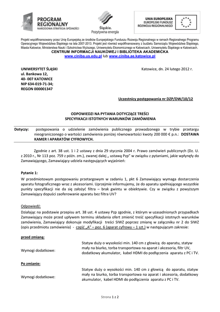 Projekt współfinansowany przez Unię Europejską ze środków Europejskiego Funduszu Rozwoju Regionalnego w ramach Regionalnego Programu Operacyjnego Województwa Śląskiego na lata 2007-2013. Projekt jest również współfinansowany z budżetu Samorządu Województwa Śląskiego, Miasta Katowice, Ministerstwa Nauki i Szkolnictwa Wyższego, Uniwersytetu Ekonomicznego w Katowicach, Uniwersytetu Śląskiego w Katowicach. CENTRUM INFORMACJI NAUKOWEJ I BIBLIOTEKA AKADEMICKA www.ciniba.us.edu.pl lub www.ciniba.ae.katowice.pl UNIWERSYTET ŚLĄSKI ul. Bankowa 12, 40- 007 KATOWICE NIP 634-019-71-34; REGON 000001347 Katowice, dn. 24 lutego 2012 r. Uczestnicy postępowania nr DZP/DW/10/12 ODPOWIEDZI NA PYTANIA DOTYCZĄCE TREŚCI SPECYFIKACJI ISTOTNYCH WARUNKÓW ZAMÓWIENIA Dotyczy: postępowania o udzielenie zamówienia publicznego prowadzonego w trybie przetargu nieograniczonego o wartości zamówienia poniżej równowartości kwoty 200 000 € p.n.: DOSTAWA KAMER I APARATÓW CYFROWYCH. Zgodnie z art. 38 ust. 1 i 2 ustawy z dnia 29 stycznia 2004 r. Prawo zamówień publicznych (Dz. U. z 2010 r., Nr 113 poz. 759 z późn. zm.), zwanej dalej „ ustawą Pzp” w związku z pytaniami, jakie wpłynęły do Zamawiającego, Zamawiający udziela następujących wyjaśnień: Pytanie 1: W przedmiotowym postępowaniu przetargowym w zadaniu 1, pkt 6 Zamawiający wymaga dostarczenia aparatu fotograficznego wraz z akcesoriami. Uprzejmie informujemy, że do aparatu spełniającego wszystkie punkty specyfikacji nie da się założyć filtra – brak gwintu w obiektywie. Czy w związku z powyższym Zamawiający dopuści zaoferowanie aparatu bez filtra UV? Odpowiedź: Działając na podstawie przepisu art. 38 ust. 4 ustawy Pzp zgodnie, z którym w uzasadnionych przypadkach Zamawiający może przed upływem terminu składania ofert zmienić treść specyfikacji istotnych warunków zamówienia, Zamawiający dokonuje modyfikacji treści SIWZ poprzez zmianę w załączniku nr 2 do SIWZ (opis przedmiotu zamówienia) - część „A” – poz. 6 (aparat cyfrowy – 1 szt.) w następującym zakresie: przed zmianą: Wymogi dodatkowe: Statyw duży o wysokości min. 140 cm z głowicą do aparatu, statyw mały na biurko, torba transportowa na aparat i akcesoria, filtr UV, dodatkowy akumulator, kabel HDMI do podłączenia aparatu z PC i TV. Po zmianie: Wymogi dodatkowe: Statyw duży o wysokości min. 140 cm z głowicą do aparatu, statyw mały na biurko, torba transportowa na aparat i akcesoria, dodatkowy akumulator, kabel HDMI do podłączenia aparatu z PC i TV. Strona 1 z 2 Projekt współfinansowany przez Unię Europejską ze środków Europejskiego Funduszu Rozwoju Regionalnego w ramach Regionalnego Programu Operacyjnego Województwa Śląskiego na lata 2007-2013. Projekt jest również współfinansowany z budżetu Samorządu Województwa Śląskiego, Miasta Katowice, Ministerstwa Nauki i Szkolnictwa Wyższego, Uniwersytetu Ekonomicznego w Katowicach, Uniwersytetu Śląskiego w Katowicach. CENTRUM INFORMACJI NAUKOWEJ I BIBLIOTEKA AKADEMICKA www.ciniba.us.edu.pl lub www.ciniba.ae.katowice.pl Pytanie 2: W przedmiotowym postępowaniu przetargowym w zadaniu 2, pkt 1 Zamawiajacy wymaga dostarczenia kamery cyfrowej. Uprzejmie informujemy, że wg naszej najlepszej wiedzy nie jest obecnie dostępna żadna kamera spełniająca wymaganą specyfikację. Czy w związku z powyższym Zamawiający dopuści kamerę o poniższej specyfikacji: - Nośnik: dysk twardy, karty SDHC (zamiast 1.8-calowy dysk twardy, karty microSD), - Zoom optyczny max: 12x (zamiast 30x) - Zoom cyfrowy: do 160x (zamiast 200x) - Jasność optyki: f/1.8 – 10,0 (zamiast f/1.8-4.7) - Długość ogniskowej: 2,9 – 34,8 (zamiast: 3.0 – 90.0) - Wbudowany port kart: SDHC (zamiast MicroSDHC/Micro SD) spełniającą pozostałą wymaganą specyfikację. Odpowiedź: Zamawiający dopuszcza zaoferowanie kamery cyfrowej o parametrach wskazanych przez Wykonawcę. Pytanie 3: Zamawiający w części A, pkt 6 ww. postępowania (zał. nr 2) wskazał w wymogach dodatkowych na filtr UV. Wykonawca pragnie zwrócić uwagę, że wskazany aparat typu kompakt nie ma możliwości założenia jakiegokolwiek filtra UV. Wykonawca prosi zatem o sprostowanie treści SIWZ w kwestii parametrów technicznych poszukiwanego sprzętu. Odpowiedź: Odpowiedź jak w pytaniu nr 1. POWYŻSZE ZMIANY SĄ WIĄŻĄCE DLA WYKONAWCÓW I NALEŻY JE UWZGLĘDNIĆ PRZY SPORZĄDZANIU OFERTY. POZOSTAŁE ZAPISY SIWZ NIE ULEGAJĄ ZMIANIE. mgr Ewa Słowik ………………………………………. Przewodniczący Komisji Przetargowej Strona 2 z 2