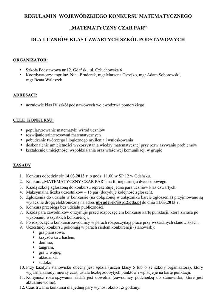 REGULAMIN WOJEWÓDZKIEGO KONKURSU MATEMATYCZNEGO „MATEMATYCZNY CZAR PAR” DLA UCZNIÓW KLAS CZWARTYCH SZKÓŁ PODSTAWOWYCH ORGANIZATOR: Szkoła Podstawowa nr 12, Gdańsk, ul. Człuchowska 6 Koordynatorzy: mgr inż. Nina Bruderek, mgr Marzena Oszejko, mgr Adam Soborowski, mgr Beata Walaszek ADRESACI: uczniowie klas IV szkół podstawowych województwa pomorskiego CELE KONKURSU: popularyzowanie matematyki wśród uczniów rozwijanie zainteresowań matematycznych pobudzanie twórczego i logicznego myślenia i wnioskowania doskonalenie umiejętności wykorzystania wiedzy matematycznej przy rozwiązywaniu problemów kształcenie umiejętności współdziałania oraz właściwej komunikacji w grupie ZASADY 1. 2. 3. 4. 5. Konkurs odbędzie się 14.03.2013 r. o godz. 11.00 w SP 12 w Gdańsku. Konkurs „MATEMATYCZNY CZAR PAR” ma formę turnieju dwuosobowego. Każdą szkołę zgłoszoną do konkursu reprezentuje jedna para uczniów klas czwartych. Maksymalna liczba uczestników – 15 par (decyduje kolejność zgłoszeń). Zgłoszenia do udziału w konkursie (na dołączonej w załączniku karcie zgłoszenia) przyjmowane są wyłącznie drogą elektroniczną na adres [email protected] do dnia 11.03.2013 r. 6. Konkurs przebiega bez udziału publiczności. 7. Każda para zawodników otrzymuje przed rozpoczęciem konkursu kartę punktacji, którą zwraca po wykonaniu wszystkich konkurencji. 8. Po rozpoczęciu konkursu zawodnicy w parach rozpoczynają pracę przy wskazanych stanowiskach. 9. Uczestnicy konkursu pokonują w parach siedem konkurencji (stanowisk): gra planszowa, krzyżówka z hasłem, domino, tangram, gra w wojnę, układanka, sudoku. 10. Przy każdym stanowisku obecny jest sędzia (uczeń klasy 5 lub 6 ze szkoły organizatora), który wyjaśnia zasady, mierzy czas, ustala liczbę zdobytych punktów i wpisuje je na kartę punktacji. 11. Kolejność rozwiązywania zadań jest dowolna (zawodnicy podchodzą do stanowiska, które jest aktualnie wolne). 12. Czas trwania konkursu dla jednej pary wynosi około 1,5 godziny. 13. Klasyfikację końcową ustala jury złożone z koordynatorów konkursu, biorąc pod uwagę łączną liczbę uzyskanych punktów. W przypadku uzyskania tej samej liczby punktów o miejscu decyduje łączny czas drużyny po zaliczeniu wszystkich konkurencji. 14. Laureatami konkursu zostają trzy drużyny, które po zaliczeniu wszystkich konkurencji uzyskają największą liczbę punktów. 15. Rozstrzygnięcie konkursu i wręczenie nagród laureatom odbędzie się w dniu konkursu. 16. Wyniki konkursu zostaną zamieszczone na stronie internetowej organizatora. 17. Podczas rozwiązywania zadań zawodnicy nie mogą korzystać z kalkulatorów ani z innych urządzeń telekomunikacyjnych. SERDECZNIE ZAPRASZAMY DO UDZIAŁU W KONKURSIE ORGANIZATORZY