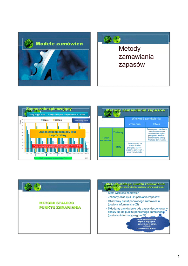 Modele zamówień Zapas zabezpieczają zabezpieczający Stały popyt = 56; Metody zamawiania zapasów Metody zamawiania zapasó zapasów Stały czas cyklu uzupełnienia = 1 dzień Wielkość zamówienia Stały popyt P=56 Zmienna Zapas zabezpieczający jest niepotrzebny Zmienny Termin zamawiania Punkt zamawiania (poziom informacyjny ZI) = P·T=56·1=56 T T T Stały Stała System oparty na stałym punkcie ponownego zamówienia (ciągłym przeglądzie zapasu) i Ekonomicznej (stałej) Wielkości Zamówienia System oparty na stałym okresie przeglądu zapasu i składania zamówień o zmiennej wielkości T Stały czas cyklu uzupełniania T=1 Metoda stał stałego punktu zamawiania (stał stałej wielkoś wielkości zamó zamówienia, poziomu informacyjnego) METODA STAŁ STAŁEGO PUNKTU ZAMAWIANIA • Stała wielkość zamówień • Zmienny czas cykl uzupełniania zapasów • Obliczamy punkt ponownego zamówienia (poziom informacyjny ZI) • Składamy zamówienie gdy zapas dysponowany obniży się do punktu ponownego zamówienia (poziomu informacyjnego – ZI) 1 Metoda stał stałego punktu zamawiania Odchylenie popytu w cyklu zamawiania • Punkt ponownego zamówienia (poziom informacyjny ZI) • Odchylenie popytu zależy od zmienności parametrów modelu – Zmienny popyt i zmienny czas cyklu uzupełnienia zapasu Poziom informacyjny = popyt w cyklu uzup. + zapas zabezpieczający ZI = P·T + ZB – Gdzie: – ZB= ω · σPT δ PT ⎞ ⎛−2 2 = ⎜⎜ P ⋅ δ T + δ P2 ⋅ T ⎟⎟ ⎠ ⎝ – σ PT - odchylenie popytu w cyklu uzupełnienia – ω – współczynnik bezpieczeństwa – σ PT - odchylenie popytu w cyklu uzupełnienia Zapas zabezpieczają zabezpieczający • Wykorzystujemy następującą formułę: • ZB= ω · σPT METODA PRZEGLĄ PRZEGLĄDU OKRESOWEGO – ω – współczynnik bezpieczeństwa – σ PT - zmienność popytu (odchylenie popytu) w cyklu uzupełnienia Metoda przeglą przeglądu okresowego Metoda przeglą przeglądu okresowego (stał stałego cyklu zamawiania) • Stały cykl przeglądu zapasów i składania zamówień • Zmienna wielkość zamówień • Obliczamy poziom maksymalny zapasu Pn Wt Cykl uzupeł. = 2 dni Śr Cz Pt So Nd Pn Wt Śr Cykl uzupeł. = 2 dni Cz Pt So Nd Pn Wt Śr Cykl uzupeł. = 2 dni Cz Pt So Nd – ZMax = P·(Tuzupełnienia+Tprzeglądu )+ZB • Obliczamy wielkość zamówienia (dostawy) – WD=ZMax – Zdysponowany 2 Poró Porównanie metod zamawiania 1/3 Charakterystyki Wielkość zamówień Cykl składania zamówień Moment zamówienia Metoda stałego punktu zamawiania Metoda stałego cyklu zamawiania Stała Zmienna Zmienny Stały Obniżenie się zapasu do Ustalony cykl zamawiania punktu ponownego zamówienia (poziomu informacyjnego – ZI) Średnia wielkość zapasu Czasochłonność sterowania zapasami Mniejsza niż w modelu Większa niż w modelu stałego cyklu zamawiania stałego punktu zamawiania Większa, wymagająca ciągłej Mniejsza ewidencji Poró Porównanie metod zamawiania 2/3 Metoda stałego punktu zamawiania Zalety Wady • Wymaga mniejszego zapasu • Może mieć przeciążenie, jeśli zapas bezpieczeństwa wielu dóbr osiągnie w tym samym czasie poziom sygnalizujący • Znajduje zastosowanie przy bardzo złożenie ponownego zamówienia zróżnicowanym asortymencie • Trudno łączyć zamówienia na różne • Pozwala wykorzystać Ekonomiczną materiały Wielkość Zamówienia (EWZ) • Trudno organizować łączne kursy • Umożliwia automatyczne pojazdów generowanie zamówień • Należy stale śledzić poziom zapasów • Nieodpowiednia, gdy przewozy muszą być organizowane cyklicznie • Przypadkowy wzorzec składania ponownych zamówień, ponieważ zapasy są uzupełnianie w różnych momentach Poró Porównanie metod zamawiania 3/3 • • • • • • • Metoda stałego cyklu zamawiania Zalety Wady • Wymaga wysokiego zapasu Prosta w stosowaniu bezpieczeństwa Umożliwia łączenie zamówień na • Nie pozwala ustalić wielkości różne materiały zamówień za pomocą EWZ Ułatwia organizowanie łącznych • Stwarza ryzyko wyczerpania się kursów pojazdów zapasu przed datą następnego Nie trzeba stale śledzić poziomu przeglądu, jeśli wielkość zużycia zapasów zmieni się na krótko po dokonaniu Zalecana, gdy przewozy muszą być przeglądu organizowane cyklicznie • Jeśli zapotrzebowanie nie jest Umożliwia bardziej równomierne stabilne mogą pojawić się trudności rozłożenie nabywanych ilości dóbr i w ustaleniu właściwej długości osiągnięcie korzyści skali okresów upływających między składanych zamówień kolejnymi przeglądami stanu Umożliwia wynegocjowanie rabatów zapasów od nabywanych ilości u tego samego dostawcy Szczególne znaczenie zapasów, Planowanie potrzeb materiałowych (materials requirements planing – MRP) (3) Schemat „System planowania potrzeb materiałowych (MRP)” Zamówienia Zamówienia klientów klientów Zestawienie Zestawienie (rejestr) (rejestr) materiałów materiałów Główny Główny harmonogram harmonogram produkcji produkcji PROGRAM MRP Prognozy Prognozy popytu popytu Zestawienie Zestawienie (rejestr) (rejestr) zapasów zapasów Wyniki Wyniki i isprawozdanie sprawozdanie Szczególne znaczenie zapasów, Planowanie potrzeb materiałowych (materials requirements planing – MRP) (4) Obliczanie zapotrzebowania na części produkcji (w sekwencjach): • Główny harmonogram produkcji (master production schedule, MPS); • Zamówienie (rejestr) materiałów (bill of materiale file, BMF); • Zestawienie (rejestr) stanu zapasów (inventory status file, ISF); • Program planowania potrzeb materiałowych; • Wyniki i sprawozdania; 3