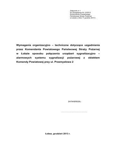 Załącznik nr 1 do Zarządzenia Nr 12/2013 Komendanta Powiatowego Państwowej Straży Pożarnej w Łobzie z dnia 11 grudnia 2013 r. Wymagania organizacyjno – techniczne dotyczące uzgadniania przez Komendanta Powiatowego Państwowej Straży Pożarnej w Łobzie alarmowych sposobu połączenia systemu urządzeń sygnalizacji sygnalizacyjno pożarowej z Komendy Powiatowej przy ul. Przemysłowa 2 ZATWIERDZIŁ: ………………………………….. Łobez, grudzień 2013 r. – obiektem 2 Opracował zespół w składzie: 1) st. kpt. Paweł Dymecki – Z-ca Komendanta Powiatowego PSP w Łobzie – przewodniczący zespołu, 2) kpt. Marek Trojanowski - Specjalista ds. Kontrolno-rozpoznawczych – zastępca przewodniczącego zespołu, 3) kpt. Paweł Różański – Starszy specjalista ds. Operacyjno-szkoleniowych członek zespołu. 3 Spis treści 1. ZAKRES OPRACOWANIA …………………………………..……………. 2. WYKAZ POWOŁANYCH PRZEPISÓW, NORM ORAZ 4 SPECYFIKACJI TECHNICZNYCH ………………………………………. 5 3. DEFINICJE I OKREŚLENIA ………………..…………………………..… 6 4. OGÓLNE ZASADY UZGADNIANIA SPOSOBU PODŁĄCZANIA DO SYSTEMU TRANSMISJI ALARMU POŻAROWEGO. PROCEDURA PRZYŁĄCZANIA OBIEKTU DO SYSTEMU TRANSMISJI SYGNAŁÓW ALARMÓW POŻAROWYCH I USZKODZENIOWYCH ... 5. ZASADY UŻYTKOWANIA SYSTEMU TRANSMISJI ALARMU POŻAROWEGO …..……………………………..………………………… 16 PODSTAWOWE WYMAGANIA TECHNICZNE DLA ELEMENTÓW 6. 7. 9 SKŁADOWYCH SYSTEMÓW SYGNALIZACJI I TRANSMISJI ALARMÓW SYSTEMOW POŻAROWEJ POŻAROWYCH I SYGNAŁÓW USZKODZENIOWYCH …………………..…………..…… 17 6.1. Pojęcie monitoringu pożarowego …………………..………………..…... 17 6.2. Struktura monitoringu ……………………………………..…………..…... 17 6.2.1. Wymagania dla systemów sygnalizacji pożarowej ………………..……. 18 6.2.2. Wymagania dla systemów transmisji …………………..……..…………. 19 6.2.3. System prezentacji informacji (SPI) ………………..………..…………... 21 EKSPLOATACJA, PRZEGLĄDY TECHNICZNE I CZYNNOŚCI KONSERWACYJNE SYSTEMÓW MONITORINGU POŻAROWEGO.. 22 4 1. ZAKRES OPRACOWANIA Niniejsze opracowanie przedstawia zbiór wymagań organizacyjno-technicznych obejmujących w szczególności: procedurę przyłączania obiektu do centrum odbiorczego alarmów pożarowych (COAP), tryb postępowania Komendanta Powiatowego Państwowej Straży pożarnej, ogólne zasady uzgadniania sposobu połączenia do systemu transmisji sygnałów alarmów pożarowych i uszkodzeniowych, zasady organizacji, funkcjonowanie i budowę systemów transmisji sygnałów alarmów pożarowych i uszkodzeniowych, wymagania dotyczące konserwacji i przeglądów systemu sygnalizacji pożarowej – w świetle obowiązujących norm, przepisów oraz zasad wiedzy technicznej. Opracowanie poniższe określa relacje pomiędzy komendantem powiatowym Państwowej Straży Pożarnej w Łobzie, a podmiotami realizującymi monitoring pożarowy na terenie powiatu. Wytyczne, przedstawione w opracowaniu zostają uwzględniane w treści umów cywilno-prawnych zawieranych pomiędzy komendantem powiatowym Państwowej Straży Pożarnej, a podmiotami realizującymi monitoring pożarowy na terenie powiatu. 5 2. WYKAZ POWOŁANYCH PRZEPISÓW, NORM ORAZ SPECYFIKACJI TECHNICZNYCH 1) 2) 3) 4) 5) 6) 7) 8) 9) 10) 11) 12) 13) 14) 15) ustawa z dnia 24 sierpnia 1991 r. o Państwowej Straży Pożarnej (Dz. U. z 2013 r., poz. 1340, z późn. zm.), ustawa z dnia 24 sierpnia 1991 r. o ochronie przeciwpożarowej (Dz. U. z 2009 r. Nr 178, poz. 1380, z późn. zm.), rozporządzenie Ministra Spraw Wewnętrznych i Administracji z dnia 7 czerwca 2010 r. w sprawie ochrony przeciwpożarowej budynków, innych obiektów budowlanych i terenów (Dz. U. Nr 109, poz. 719), rozporządzenie Ministra Spraw Wewnętrznych i Administracji z dnia 20 czerwca 2007 r. w sprawie wykazu wyrobów służących zapewnieniu bezpieczeństwa publicznego lub ochronie zdrowia i życia oraz mienia, a także zasad wydawania dopuszczenia tych wyrobów do użytkowania (Dz. U. Nr 143, poz. 1002, z późn. zm.), rozporządzenie Ministra Infrastruktury z dnia 15 kwietnia 2004 r. w sprawie dokonywania oceny zgodności telekomunikacyjnych urządzeń końcowych przeznaczonych do dołączenia do zakończeń sieci publicznej i urządzeń radiowych z zasadniczymi wymaganiami oraz ich oznakowania (Dz. U. z 2004 r. Nr 73, poz. 659, z późn. zm.), PN-EN 54-1:2011 Systemy sygnalizacji pożarowej. Wprowadzenie, PN-EN 54-2:2002 Systemy sygnalizacji pożarowej. Część 2: Centrale sygnalizacji pożarowej, PN-EN 54-2:2002/A1:2007 Systemy sygnalizacji pożarowej. Część 2: Centrale sygnalizacji pożarowej, PN-EN 54-21:2009 Systemy sygnalizacji pożarowej. Urządzenia transmisji alarmów pożarowych i sygnałów uszkodzeniowych, PN-EN 50136-1-1:2007 Systemy alarmowe. Systemy i urządzenia transmisji alarmu. Cześć 1-1: Wymagania ogólne dotyczące systemów transmisji alarmu. PN-EN 50136-1-2:2007 Systemy alarmowe. Systemy i urządzenia transmisji alarmu. Cześć 1-2: Wymagania dla systemów wykorzystujących dedykowane tory transmisji, PN-EN 50136-1-3:2007 Systemy alarmowe. Systemy i urządzenia transmisji alarmu. Cześć 1-3: Wymagania dla systemów łączności cyfrowej wykorzystujących publiczną sieć komutowaną, PN-ISO 8411-3:1996 Ochrona przeciwpożarowa. Terminologia. Wykrywanie pożaru, Specyfikacja Techniczna CLC/TS 50136-4 Systemy alarmowe – Systemy i urządzenia transmisji alarmu – Część 4: Urządzenia powiadamiania w Alarmowych Centrach Odbiorczych, Specyfikacja Techniczna PKN-CEN/TS 54-14:2006 Systemy sygnalizacji pożarowej – Część 14: Wytyczne planowania, projektowania, instalowania, odbioru i konserwacji. 6 3. DEFINICJE I OKREŚLENIA 3.1. Abonent – osoba fizyczna lub prawna odpowiedzialna za organizację systemu sygnali