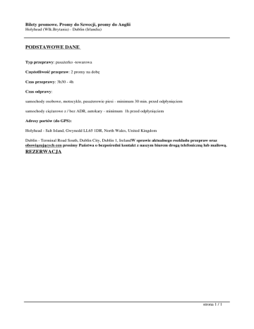 Bilety promowe. Promy do Szwecji, promy do Anglii Holyhead (Wlk.Brytania) - Dublin (Irlandia) PODSTAWOWE DANE Typ przeprawy: pasażerko -towarowa Częstotliwość przepraw: 2 promy na dobę Czas przeprawy: 3h30 - 4h Czas odprawy: samochody osobowe, motocykle, pasażerowie piesi - minimum 30 min. przed odpłynięciem samochody ciężarowe z / bez ADR, autokary - minimum 1h przed odpłynięciem Adresy portów (do GPS): Holyhead - Salt Island, Gwynedd LL65 1DR, North Wales, United Kingdom Dublin - Terminal Road South, Dublin City, Dublin 1, IrelandW sprawie aktualnego rozkładu przepraw oraz obowiązujących cen prosimy Państwa o bezpośredni kontakt z naszym biurem drogą telefoniczną lub mailową. REZERWACJA strona 1 / 1