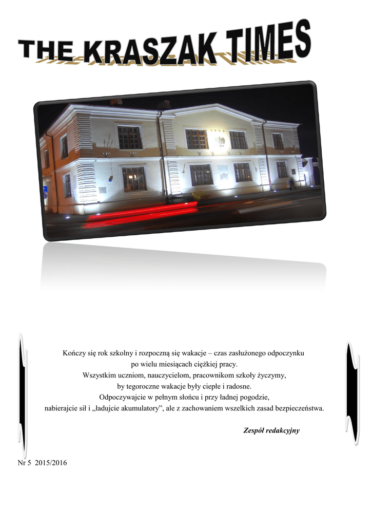 Kończy się rok szkolny i rozpoczną się wakacje – czas zasłużonego odpoczynku po wielu miesiącach ciężkiej pracy. Wszystkim uczniom, nauczycielom, pracownikom szkoły życzymy, by tegoroczne wakacje były ciepłe i radosne. Odpoczywajcie w pełnym słońcu i przy ładnej pogodzie, nabierajcie sił i „ładujcie akumulatory”, ale z zachowaniem wszelkich zasad bezpieczeństwa. Zespół redakcyjny Nr 5 2015/2016 Spis treści: Podróże – sposób na życie Podróże Kraszewskiego Wakacyjna Polska 6 Filmowe podróże 8 Odlotowe wakacje 3 5 10 „Podróż Życia” 11 Kącik Poetycki 14 Szkolne wspomnienia 15 Zdrowe odżywianie dla Niej 19 Zdrowe odżywianie dla Niego 21 Śródziemnomorskie pyszności 23 2 PODRÓŻE - SPOSÓB NA ŻYCIE Duże nagłówki, przyciągające treści - „Zdałeś maturę i nie wiesz co dalej? Zastanawiasz się nad kierunkiem, uczelnią? Zrób sobie gap year i sprawdź się w innej roli niż student”. Czy naprawdę wygląda to tak pięknie i czym właściwie jest GAP YEAR? Gap year jest roczną podróżą do innego kraju poświęconą na pracę, wolontariat czy zwie dzanie. Podstawowe założenie - trzeba wydać jak najmniej i bawić się jak najlepiej. Gap year ma jak wszystko - zalety i wady. Niezaprzeczalną zaletą jest poznanie świata, siebie oraz nauka samodzielności. Dzięki tej przygodzie podróżnik powiększa grono swoich znajomych, obserwuje zwyczaje kulturowe czy - jak łatwo się domyślić - uczy się języka. Drogocenną umiejętnością na miarę XXI wieku jest nauka oszczędności, która podczas tej podróży na pewno zostanie przyswojona. Gap year to fascynująca przygoda, pouczające doświadczenie i sprawdzian dojrzałości człowieka do podjęcia takiego wyzwania. Warte obejrzenia: Highline Meeting w Monte Piana (Dolomity, Włochy) – coroczna impreza, w której uczestnicy chodzą po taśmach rozpiętych nad przepaścią (slackline) oraz śpią w hamakach zawieszonych ok. 100 m nad ziemią. W tym roku impreza odbędzie się w dniach 2-8 września 3 Coachella - festiwal na pustyni, trzy dni przepełnione muzyką w wykonaniu największych gwiazd. Karolina Kukawska i Joanna Bujnik 4 Podróże Kraszewskiego Jako uczniowie Kraszaka wiemy, że nasz patron odbył w swoim życiu wiele dalekich podróży. Bardzo kochał, oczywiście oprócz rodzimej Polski, Drezno – stolicę Saksonii, gdzie mieszkał aż 21 lat. Pierwszy raz do Drezna przybył w 1858 r. Był to ostatni przystanek w podróży po Europie. W mieście przebywali wielcy polscy artyści tacy jak Słowacki, Mickiewicz, Krasiński. Właśnie to i tonące w zieleni parki miasta ściągnęły Kraszewskiego w tamte strony. Miejsce tak spodobało się patronowi naszej szkoły, że postanowił tam zostać. Pobyt w stolicy Saksonii stał się inspiracją do napisania „Wieczorów drezdeńskich”, w których opisał obce dla niego niemieckie środowisko. W Dreźnie organizował pomoc materialną dla rodaków walczących w powstaniu styczniowym. Pisarz do Drezna powrócił w roku 1868. Po uzyskaniu saskiego obywatelstwa otworzył w mieście drukarnię. Mógł wspierać Polskę, drukując polską prasę, współpracując z wywiadem francuskim oraz organizując akcje przeciwko caratowi. W życiu twórcy nie brakowało miłości nawet w tak burzliwym okresie. Kraszewski nawiązał romans z Florą Heinitz. W roku 1873 postanowił powrócić do Polski. Do Drezna przyjechał jeszcze w tym samym roku. Skupił się na twórczości literackiej. Napisał ponad 35 powieści. Pozostał w ukochanym mieście aż do aresztowania w roku 1883. Julia Naumiuk, Maciej Januszko i Michał Warakomski 5 Wakacyjna Polska Wisła W Wiśle oprócz górskich szlaków czekają na turystów: basen kąpielowy, korty tenisowe oraz staw kajakowy. Warto wybrać się także na ścieżkę dydaktyczno-przyrodniczą, na której czekają na nas: malownicze wodospady Białej Wisełki – Kaskady Rodła w Dolinie Białej Wisełki, Jezioro Czernińskie i wodospad w Wiśle Czarnej. Atrakcje architektoniczne to Myśliwski Zameczek Habsburgów z XIX w czy Zamek Prezydenta RP Ignacego Mościckiego z 1930r. W centrum miasta znajduje się deptak oraz Rynek z rękodziełem, fontanną i Domem Zdrojowym Ustka Jako nadmorski kurort Ustka może pochwalić się piaszczystymi plażami, oferuje kąpiele wodne, spacery pod lesie, parku, wzdłuż plaż. Na wybrzeżu znajduje się pomnik syrenki, Promenada, latarnia morska. Dla osób lubiących spędzać wypoczynek aktywnie: trasy rowerowe, spływy kajakowe, przejażdżki konne, korty tenisowe, pola do mini golfa i możliwość nurkowania. Ustka przyciąga też zabytkami dawnymi domami rybackimi i przedwojennymi pensjonatami. 6 Jura Krakowsko-Częstochowska Najbardziej charakterystyczne elementy krajobrazu Jury to warownie, w większości wybudowane w XIV wieku przez Kazimierza Wielkiego dla obrony obszarów podgranicznych. Najpiękniejsze zamki: w Ogrodzieńcu, Mirowie, Ojcowie. Charakterystyczne są białe, sterczące ostańce skalne, np. Okiennik Wielki w Skarżycach, Maczuga Herkulesa w Piaskowej Skale czy Brama Krakowska w Ojcowie. Znajdują się tam też jaskinie, szlaki turystyczne, piesze, rowerowe , konne. Wilczy szaniec w Gierłoży. Jest to obowiązkowy punkt zwiedzania Mazur dla osób interesujących się historią. Wilczy szaniec był w latach 1941-1944 kwaterą główną Adolfa Hitlera. Jest on udostępniony do zwiedzania od 1959 r. po rozminowaniu terenu. Znajduje się tu restauracja, hotel oraz pole kempingowe. Dawną kwaterę można zwiedzać codziennie od godziny 8:00 do zmroku. Karolina Wiraszka 7 Filmowe podróże Filmy potrafią przenieść odbiorców w świat marzeń, pozwalają wrócić do przeszłości, odbyć razem z filmowymi bohaterami fascynującą podróż. Choć film określany jako western, to właściwie ma niewiele cech tego gatunku. Główny bohater (Kodi Smit-McPhee) to romantyk, który chce przebyć cały Dziki Zachód w poszukiwaniu ukochanej (Caren Pi