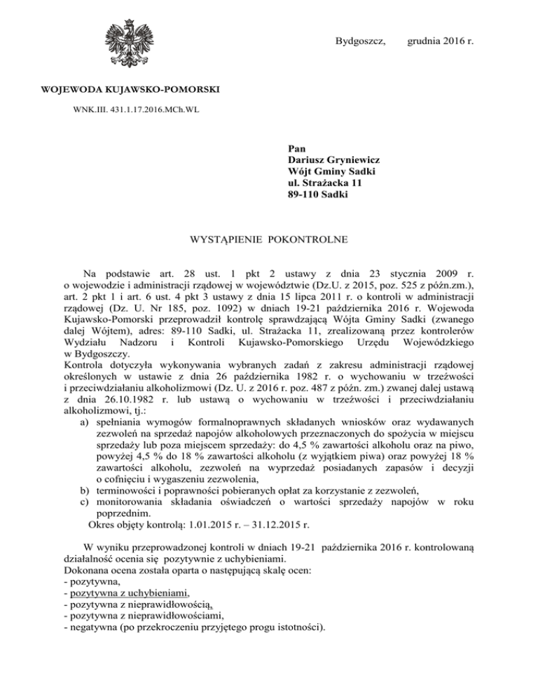 Wystąpienie pokontrolne - bip.bydgoszcz.uw.gov.pl