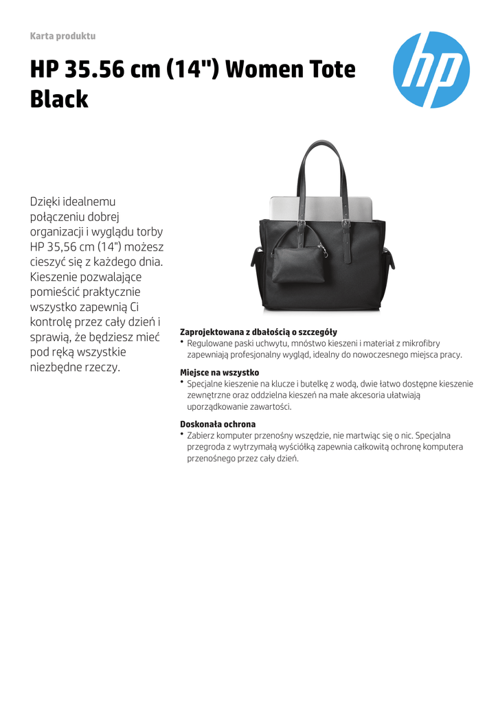 Karta produktu HP 35.56 cm (14") Women Tote Black Dzięki idealnemu połączeniu dobrej organizacji i wyglądu torby HP 35,56 cm (14") możesz cieszyć się z każdego dnia. Kieszenie pozwalające pomieścić praktycznie wszystko zapewnią Ci kontrolę przez cały dzień i sprawią, że będziesz mieć pod ręką wszystkie niezbędne rzeczy. Zaprojektowana z dbałością o szczegóły ● Regulowane paski uchwytu, mnóstwo kieszeni i materiał z mikrofibry zapewniają profesjonalny wygląd, idealny do nowoczesnego miejsca pracy. Miejsce na wszystko ● Specjalne kieszenie na klucze i butelkę z wodą, dwie łatwo dostępne kieszenie zewnętrzne oraz oddzielna kieszeń na małe akcesoria ułatwiają uporządkowanie zawartości. Doskonała ochrona ● Zabierz komputer przenośny wszędzie, nie martwiąc się o nic. Specjalna przegroda z wytrzymałą wyściółką zapewnia całkowitą ochronę komputera przenośnego przez cały dzień. Karta produktu HP 35.56 cm (14") Women Tote Black Zgodność Zgodność z komputerami przenośnymi o przekątnej ekranu do 35,56 cm (14"). Wymiary Z opakowania: 368,3 × 101,6 × 292 mm Zapakowane: 368,3 × 101,6 × 292 mm Waga Z opakowania: 0,79 kg Zapakowane: 0,84 kg Gwarancja Roczna gwarancja komercyjna HP Kolor produktu Czarny Informacje dodatkowe P/N: T7B35AA #ABB Kod UPC/EAN: 889894669988 Zawartość opakowania Torba © Copyright 2015 HP Development Company, L.P. Informacje zawarte w niniejszym dokumencie mogą ulec zmianie bez powiadomienia. Jedyne gwarancje, jakich firma HP udziela na produkty i usługi, są określone w oświadczeniach gwarancyjnych dostarczanych wraz z tymi produktami i usługami. Żadnych informacji przedstawionych w niniejszym dokumencie nie należy interpretować jako dodatkowych gwarancji. Firma HP nie ponosi odpowiedzialności za błędy techniczne, redakcyjne ani za informacje pominięte w niniejszym dokumencie. 02/16