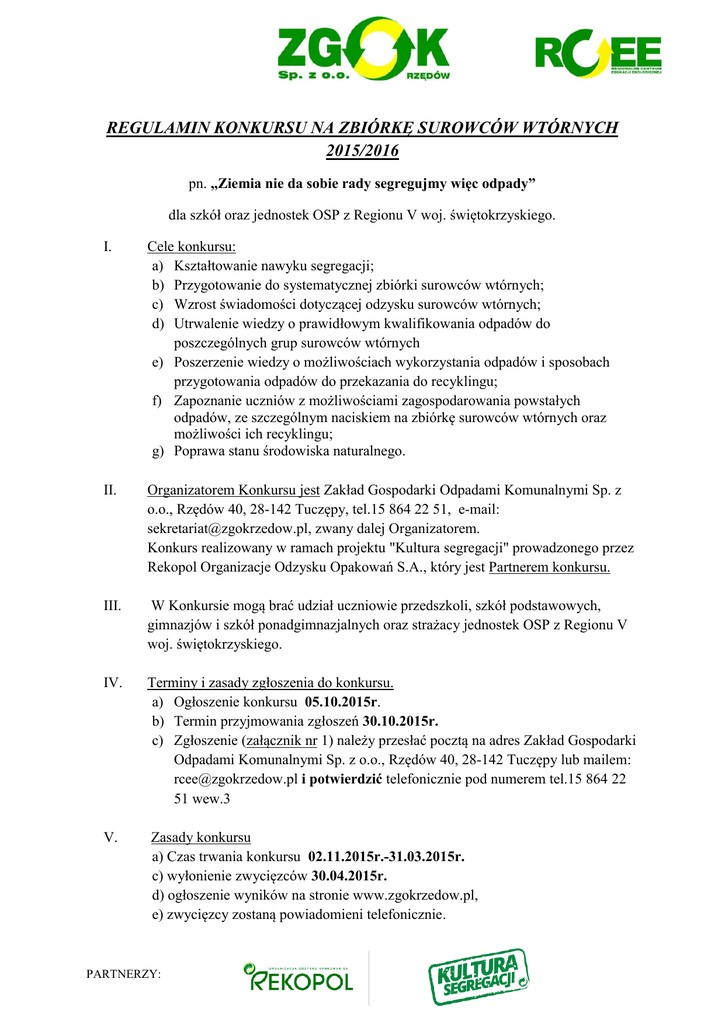 REGULAMIN KONKURSU NA ZBIÓRKĘ SUROWCÓW WTÓRNYCH 2015/2016 pn. „Ziemia nie da sobie rady segregujmy więc odpady” dla szkół oraz jednostek OSP z Regionu V woj. świętokrzyskiego. I. Cele konkursu: a) Kształtowanie nawyku segregacji; b) Przygotowanie do systematycznej zbiórki surowców wtórnych; c) Wzrost świadomości dotyczącej odzysku surowców wtórnych; d) Utrwalenie wiedzy o prawidłowym kwalifikowania odpadów do poszczególnych grup surowców wtórnych e) Poszerzenie wiedzy o możliwościach wykorzystania odpadów i sposobach przygotowania odpadów do przekazania do recyklingu; f) Zapoznanie uczniów z możliwościami zagospodarowania powstałych odpadów, ze szczególnym naciskiem na zbiórkę surowców wtórnych oraz możliwości ich recyklingu; g) Poprawa stanu środowiska naturalnego. II. Organizatorem Konkursu jest Zakład Gospodarki Odpadami Komunalnymi Sp. z o.o., Rzędów 40, 28-142 Tuczępy, tel.15 864 22 51, e-mail: [email protected], zwany dalej Organizatorem. Konkurs realizowany w ramach projektu "Kultura segregacji" prowadzonego przez Rekopol Organizacje Odzysku Opakowań S.A., który jest Partnerem konkursu. III. W Konkursie mogą brać udział uczniowie przedszkoli, szkół podstawowych, gimnazjów i szkół ponadgimnazjalnych oraz strażacy jednostek OSP z Regionu V woj. świętokrzyskiego. IV. Terminy i zasady zgłoszenia do konkursu. a) Ogłoszenie konkursu 05.10.2015r. b) Termin przyjmowania zgłoszeń 30.10.2015r. c) Zgłoszenie (załącznik nr 1) należy przesłać pocztą na adres Zakład Gospodarki Odpadami Komunalnymi Sp. z o.o., Rzędów 40, 28-142 Tuczępy lub mailem: [email protected] i potwierdzić telefonicznie pod numerem tel.15 864 22 51 wew.3 V. Zasady konkursu a) Czas trwania konkursu 02.11.2015r.-31.03.2015r. c) wyłonienie zwycięzców 30.04.2015r. d) ogłoszenie wyników na stronie www.zgokrzedow.pl, e) zwycięzcy zostaną powiadomieni telefonicznie. PARTNERZY: VI. Zbiórka surowców możliwa jest w następujących grupach: makulatura, plastik, szkło. Prawidłowo zebrane surowce powinny znajdować się w workach o odpowiednich kolorach, tj. makulatura- niebieski, plastik- żółty, szkło- zielony. W workach niebieskich umieszczamy makulaturę tj.: gazety, książki, czasopisma, zeszyty, tekturę. UWAGA! Pamiętajmy, makulatura nie może być zabrudzona czy zatłuszczona, np. nie można zbierać zabrudzonych chusteczek czy papieru po maśle. W workach żółtych umieszczamy puste butelki plastikowe typu PET po napojach, po kosmetykach i środkach czystości (np. szamponach), nakrętki z butelek. UWAGA! Pamiętajmy o dokładnym opróżnianiu i zgniataniu butelek. W workach zielonych umieszczamy szklane butelki, słoiki (wyłącznie szkło opakowaniowe). UWAGA! Pamiętajmy o usuwaniu z butelek i słoików nakrętek. Nie wrzucamy szklanek, porcelany, szyb, szkła żaroodpornego itp. VII. Za przebieg zbiórki surowców na terenie placówki oświatowej odpowiada Dyrektor tejże placówki, a na terenie jednostki OSP odpowiada jej Prezes. Dyrektor/Prezes wyznaczy koordynatora konkursu. VIII. Koordynator konkursu obowiązany jest zapoznać uczestników z regulaminem, a szczególną ich uwagę zwrócić na punkt I i VI niniejszego regulaminu. IX. Surowce wtórne będą odbierane przez Zakład Gospodarki Odpadami Komunalnymi, a załadunku dokonuje odbierający odpady w terminie uzgodnionym wcześniej z koordynatorem. X. Nad prawidłowym przebiegiem konkursu czuwać będzie komisja konkursowa, tj.: a) Bogumiła Czerwiec- Dyrektor Pionu Sprzedaży i Rozwoju. b) Małgorzata Zabdyr- Referent ds. edukacji ekologicznej i promocji. c) Renata Kowalik-Sobieniak- Referent ds. edukacji ekologicznej i promocji. XI. Punktacja będzie prowadzona w następujący sposób a) 1kg makulatury - 1 pkt. b)1kg szkła - 2 pkt. c) 1kg plastiku - 3 pkt. XII. Zebrane surowce przygotowane do odebrania, zostaną zważone przez podmiot odbierający, a wartości muszą zostać wprowadzone do formularza odbioru (załącznik nr 2) w dwóch egzemplarzach, przy czym jeden egzemplarz zostaje przekazany odbierającemu surowce. PARTNERZY: XIII. Po zakończeniu zbiórki, koordynatorzy szkolni oraz Prezesi OSP prześlą formularze odbioru do organizatora konkursu (pocztą lub skan mailem) wraz z informacją o sumie zebranych surowców oraz przeliczonymi punktami (patrz pkt. IX). XIV. Za niestosowanie się do zasad segregacji zawartych w pkt.VI regulaminu będą odejmowane punkty. XV. Nagrody przyznane zostaną w dwóch kategoriach: szkoły i jednostki OSP. XVI. Zwycięzcą Konkursu zostanie placówka i jednostka OSP, która uzyska największą ilość punktów w przeliczeniu na uczestników konkursu danej placówki lub jednostki. XVII. W Konkursie przewidziano następujące nagrody: a) W kategorii szkoły: I miejsce Multi Stół 12 gier II miejsce Stół do Piłkarzyków III miejsce Stół do Cymbergaja b) W kategorii jednostki OSP: I miejsce Radiotelefon nasobny II miejsce Hełm strażacki Calisia Vulcan, III miejsce Rozdzielacz kulowy potrójny XVIII. Organizator przewiduje również po trzy wyróżnienia indywidualnych dla najbardziej aktywnie zbierających osób w każdej kategorii. a) W kategorii szkoła: słuchawki bezprzewodowe. b) W kategorii OSP: zestaw narzędzi. XIX. Laureaci konkursów zostaną powiadomieni o dacie i miejscu rozdania nagród po zakończeniu konkursu. XX. Organizator zastrzega sobie prawo do wprowadzania zmian w regulaminie konkursu. PARTNERZY: