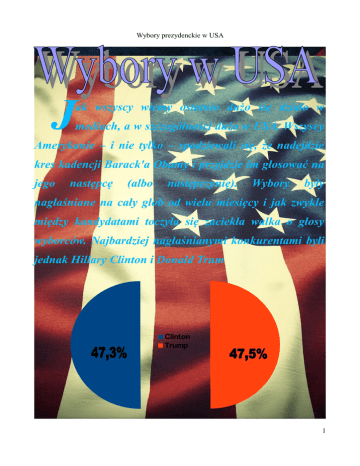 Wybory prezydenckie w USA J ak wszyscy wiemy ostatnio dużo się działo w mediach, a w szczególności dużo w USA. Wszyscy Amerykanie – i nie tylko – spodziewali się, że nadejdzie kres kadencji Barack'a Obamy i przyjdzie im głosować na jego następcę (albo następczynię). Wybory były nagłaśniane na cały glob od wielu miesięcy i jak zwykle między kandydatami toczyła się zaciekła walka o głosy wyborców. Najbardziej nagłaśnianymi konkurentami byli jednak Hillary Clinton i Donald Trum Clinton Trump 1 Wybory prezydenckie w USA P rzedstawiciele dwóch różnych partii (Demokraci i Republikanie), głoszących zupełnie inne poglądy, mających kompletnie różne plany co do Stanów Zjednoczonych. Trump zapowiedział nam (Polakom) szansę na podróżowanie do USA bez Vizy. Clinton natomiast ma w planach załagodzenie wszelkich konfliktów z Rosją. Różni ludzie mają różne zdania, kto byłby lepszym prezydentem. W ybory wygrał Trump, w ciągu najbliższych tygodni i miesięcy dowiemy się, czy będzie to dla nas korzystne, czy nie. Donald Trump wygrał przewagą niewielką, bo 0,2 punktów, ale dla Amerykanów ta różnica jest bardzo znacząca, gdyż na przełomie kolejnych kilku lat te dwie dziesiąte punktów mogą dawać się im we znaki. Ola Więch 2Gc 2 Wybory prezydenckie w USA BIOBLIOGRAFIA Tekst • http://trumpxclinton.com/#will-trump-win • http://www.cbsnews.com/news/presidential-election-2016-results-live-updates/ • http://wiadomosci.dziennik.pl/swiat/artykuly/516736,wybory-prezydenckie-w-usadonald-trump-hillary-clinton.html • http://www.rp.pl/Wybory-prezydenckie-w-USA/160309854-Hillary-Clinton-lepszadla-Polski-od-Donalda-Trumpa.html#ap-1 • http://www.politico.com/news/2016-elections Zdjęcia • http://spanish.fansshare.com/gallery/photos/16046868/iphone-backgroundamerican-flag/?displaying 3
