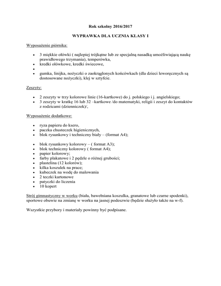 Rok szkolny 2016/2017 WYPRAWKA DLA UCZNIA KLASY I Wyposażenie piórnika: 3 miękkie ołówki ( najlepiej trójkątne lub ze specjalną nasadką umożliwiającą naukę prawidłowego trzymania), temperówka, kredki ołówkowe, kredki świecowe, gumka, linijka, nożyczki o zaokrąglonych końcówkach (dla dzieci leworęcznych są dostosowane nożyczki), klej w sztyfcie. Zeszyty: 2 zeszyty w trzy kolorowe linie (16-kartkowe) do j. polskiego i j. angielskiego; 3 zeszyty w kratkę 16 lub 32 –kartkowe /do matematyki, religii i zeszyt do kontaktów z rodzicami (dzienniczek)/, Wyposażenie dodatkowe: ryza papieru do ksero, paczka chusteczek higienicznych, blok rysunkowy i techniczny biały – (format A4); blok rysunkowy kolorowy – ( format A3); blok techniczny kolorowy ( format A4); papier kolorowy; farby plakatowe i 2 pędzle o różnej grubości; plastelina (12 kolorów); kilka koszulek na prace; kubeczek na wodę do malowania 2 teczki kartonowe patyczki do liczenia 10 kopert Strój gimnastyczny w worku (biała, bawełniana koszulka, granatowe lub czarne spodenki), sportowe obuwie na zmianę w worku na jasnej podeszwie (będzie służyło także na w-f). Wszystkie przybory i materiały powinny być podpisane. WYPRAWKA DLA UCZNIA KLASY II papier ksero, 1 mały blok biały, 1 mały blok kolorowy, 1 małyblok techniczny biały, 1 mały blok techniczny kolorowy, 1 duży blok biały, 1 duży blok kolorowy, farby plakatowe, pędzelek, kubeczek, kredki ołówkowe, kredki świecowe "Bambino", 3 ołówki, gumka, nożyczki, temperówka, linijka, ekierka, 2 zeszyty w trzy linie (16 - kartkowe) 3zeszyty w kratkę (16 - kartkowe) zeszyt 32- kartkowy jako dzienniczek ucznia strój gimnastyczny obuwie sportowe tekstylne na jasnej podeszwie na zmianę w podpisanym worku. WYPRAWKA DLA UCZNIA KLASY III 1. Ryza papieru ksero 2. Mały blok kolorowy, mały blok techniczny, 3. Duży blok techniczny biały, duży blok techniczny kolorowy, 4. Farby plakatowe, pędzelek gruby i cienki, kubeczek, 5. Kredki 6. 3 ołówki 7. Gumka, nożyczki, temperówka, linijka i ekierka, klej, 8. zeszyty: jeden 32 - kartkowy (dzienniczek), dwa w trzy linie (16 - kartkowe), trzy w kratkę (16 - kartkowe), 9. strój gimnastyczny: biała koszulka, ciemne spodenki, buty sznurowane tekstylne na jasnej podeszwie, worek na obuwie (podpisany), 10. Paczka chusteczek, 11. Dwie teczki kartonowe.