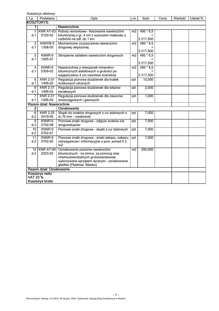Kosztorys ofertowy Lp. Podstawa Opis j.m. Ilość 1 KNR AT-03 Roboty remontowe - frezowanie nawierzchni d.1 0102-02 bitumicznej o gr. 4 cm z wywozem materiału z rozbiórki na odl. do 1 km 2 KNKRB 6 Mechaniczne oczyszczenie nawierzchni d.1 1308-05 drogowej ulepszonej m2 3 d.1 KNNR 6 1005-07 Skropienie asfaltem nawierzchni drogowych m2 4 d.1 KNNR 6 0309-02 m2 5 d.1 6 d.1 7 d.1 KNR 2-31 1406-02 KNR 2-31 1406-03 KNR 2-31 1406-04 Nawierzchnie z mieszanek mineralnobitumicznych asfaltowych o grubości po zagęszczeniu 4 cm (warstwa ścieralna) Regulacja pionowa studzienek dla kratek ściekowych ulicznych Regulacja pionowa studzienek dla włazów kanałowych Regulacja pionowa studzienek dla zaworów wodociągowych i gazowych szt. 495 * 6,5 = 3 217,500 495 * 6,5 = 3 217,500 495 * 6,5 = 3 217,500 495 * 6,5 = 3 217,500 10,000 szt. 3,000 szt. 1,000 8 d.2 9 d.2 10 d.2 11 d.2 KNR 2-25 0419-05 KNNR 6 0702-08 KNNR 6 0702-01 KNNR 6 0702-05 szt. 7,000 szt. 7,000 szt. 7,000 Pionowe znaki drogowe - znaki zakazu, nakazu, szt. ostrzegawcze i informacyjne o pow. ponad 0.3 m2 12 KNR AT-04 Oznakowanie poziome nawierzchni m2 d.2 0203-02 bitumicznych - na zimno, za pomocą mas chemoutwardzalnych grubowarstwowe wykonywane sprzętem ręcznym - oznakowanie gładkie (Plastmal, Biladur) 7,000 Słupki do znaków drogowych z rur stalowych o śr.70 mm - rozebranie Pionowe znaki drogowe - zdjęcie znaków lub drogowskazów Pionowe znaki drogowe - słupki z rur stalowych -1Norma Expert Wersja: 5.5.200.8 Nr seryjny: 3594 Użytkownik: Zarząd Dróg Powiatowych w Rykach m2 200,000 Cena Wartość Udział %