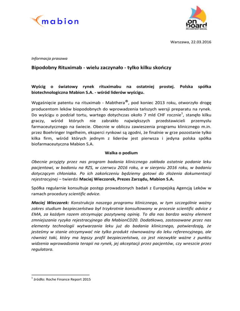 Warszawa, 22.03.2016 Informacja prasowa Bipodobny Rituximab - wielu zaczynało - tylko kilku skooczy Wyścig o światowy rynek rituximabu na ostatniej biotechnologiczna Mabion S.A. - wśród liderów wyścigu. prostej. Polska spółka Wygaśnięcie patentu na rituximab - Mabthera®, pod koniec 2013 roku, otworzyło drogę producentom leków biopodobnych do wprowadzenia taoszych wersji preparatu na rynek. Do wyścigu o podział tortu, wartego dotychczas około 7 mld CHF rocznie1, stanęło kilku graczy, wśród których nie zabrakło największych przedstawicieli przemysłu farmaceutycznego na świecie. Obecnie w obliczu zawieszenia programu klinicznego m.in. przez Boehringer Ingelheim, eksperci rynkowi są zgodni, że finalnie w grze pozostanie tylko kilka firm, wśród których jednym z liderów jest pierwsza i jedyna polska spółka biofarmaceutyczna Mabion S.A. Walka o podium Obecnie przyjęty przez nas program badania klinicznego zakłada ostatnie podanie leku pacjentowi, w badaniu na RZS, w czerwcu 2016 roku, a w sierpniu 2016 roku, w badaniu dotyczącym chłoniaka. Po ich zakooczeniu będziemy gotowi do złożenia dokumentacji rejestracyjnej – twierdzi Maciej Wieczorek, Prezes Zarządu, Mabion S.A. Spółka regularnie konsultuje postęp prowadzonych badao z Europejską Agencją Leków w ramach procedury scientific advice. Maciej Wieczorek: Konstrukcja naszego programu klinicznego, w tym szczególnie ważny zakres studium bezpieczeostwa był trzykrotnie konsultowany w procesie scientific advice z EMA, za każdym razem otrzymując pozytywną opinię. To dla nas bardzo ważny element zmniejszania ryzyka rejestracyjnego dla MabionCD20. Dodatkowo, zastosowane przez nas elementy technologii wytwarzania leku już do badania klinicznego, potwierdzają, że jesteśmy w stanie otrzymywad nie tylko produkt równoważny do leku referencyjnego, ale również taki, który ma lepszy profil bezpieczeostwa, co jest niezwykle ważne z punktu widzenia wprowadzania terapii na rynek, jej akceptacji przez pacjentów, czy wreszcie przez regulatora. 1 źródło: Roche Finance Report 2015 Innowacje w technologii wytwarzania kluczem do sukcesu Na potrzeby produkcji swoich leków spółka wybudowała nowoczesny zakład biotechnologiczny w Konstantynowie Łódzkim To jedyny tak zaawansowany zakład produkcyjny leków biotechnologicznych w Polsce oraz jeden z niewielu tego typu obiektów na całym świecie – twierdzi Maciej Wieczorek. Zdaniem ekspertów to jedyny zakład przystosowany do produkcji biofarmaceutyków, w dużej skali, całkowicie w oparciu o technologię disposables (eliminującą kontakt produktu ze środowiskiem wytwarzania i urządzeniami) w 100% łaocucha wytwórczego. Jest to też największy na świecie zakład operujący w tej technologii. Fabryka wyposażona jest w jedyną na świecie linie do sterylnego rozlewu produktu opartą o systemy robotyczne, nieposiadające kontaktu z produktem. Skazani na sukces? Mabion S.A. zamierza zarejestrowad MabionCD20 na wszystkich rynkach światowych, na których sprzedawane są leki referencyjne. Całośd produkcji będzie zlokalizowana w Polsce w zakładach spółki, a sprzedaż leku będzie prowadzona przez zagranicznych partnerów. Obecnie prowadzimy rozmowy z kilkoma partnerami, wśród których są firmy gotowe do podjęcia ostatecznych negocjacji handlowych. Ze względu na nasze plany rozwoju kolejnych produktów biopodobnych, bardzo ważne będzie dla nas pozyskanie dla naszego pierwszego produktu MabionCD20 najlepszego partnera lub partnerów, którzy pozwolą nam skutecznie realizowad wymagania związane z kamieniami milowymi, a także zapewnią najlepsze warunki sprzedaży naszego leku – potwierdza Artur Chabowski, Członek Zarządu Mabion S.A. Więcej informacji udziela: Małgorzata Siewierska Biuro Prasowe Mabion S.A. [email protected] 602301215 *** Mabion SA to czołowa polska firma biotechnologiczna, która została utworzona w celu wprowadzenia na rynek leków biotechnologicznych najnowszej generacji opartych na humanizowanych przeciwciałach monoklonalnych.Technologia ta, samodzielnie rozwijana w Mabionie, to high-tech na najwyższym światowym poziomie. Proces humanizowania przeciwciał monoklonalnych, będący szczytowym osiągnięciem dzisiejszej biotechnologii, umożliwia produkcję leków celowanych, które działają wybiórczo na komórki nowotworowe, zapewniając lepszą skutecznośd i mniejszą toksycznośd terapii. Mabion jako jedna z nielicznych firm biofarmaceutycznych posiada kompetencję kompleksowego rozwoju i wdrożenia dowolnych leków biotechnologicznych – począwszy od fazy ich projektowania, poprzez wybór platformy i technologii wytwarzania, aż do wyprodukowania i rejestracji gotowego leku. Obecnie w swoich laboratoriach spółka prowadzi prace badawczo-rozwojowe nad kilkoma lekami biotechnologicznymi, stosowanymi w leczeniu nowotworów oraz chorobach zapalnych. Więcej na www.mabion.eu.