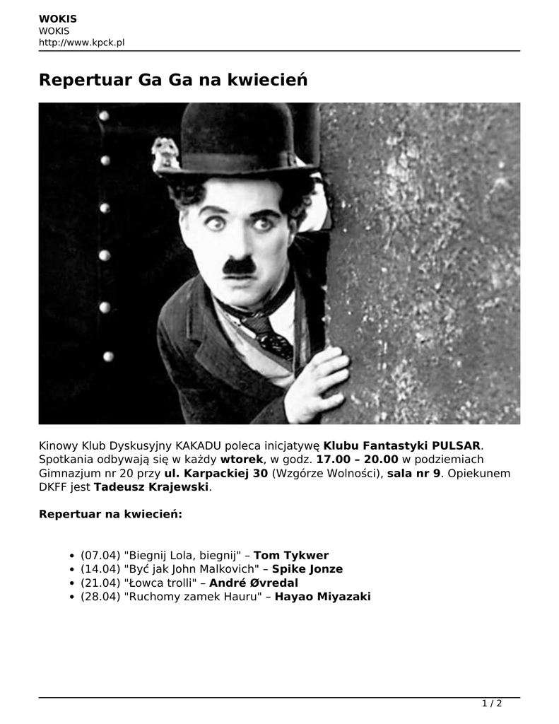 WOKIS WOKIS http://www.kpck.pl Repertuar Ga Ga na kwiecień Kinowy Klub Dyskusyjny KAKADU poleca inicjatywę Klubu Fantastyki PULSAR. Spotkania odbywają się w każdy wtorek, w godz. 17.00 – 20.00 w podziemiach Gimnazjum nr 20 przy ul. Karpackiej 30 (Wzgórze Wolności), sala nr 9. Opiekunem DKFF jest Tadeusz Krajewski. Repertuar na kwiecień: (07.04) (14.04) (21.04) (28.04) "Biegnij Lola, biegnij" – Tom Tykwer "Być jak John Malkovich" – Spike Jonze "Łowca trolli" – André Øvredal "Ruchomy zamek Hauru" – Hayao Miyazaki 1/2 WOKIS WOKIS http://www.kpck.pl „Dyskusyjny Klub Filmów Fantastycznych Ga Ga kieruje swoją ofertę do wszystkich miłośników kina fantastycznego o wyjątkowym charakterze. Interesują nas filmy artystyczne, niszowe, awangardowe, obrazy o posmaku eksperymentalnym. Chcemy pokazać fanom oraz widzom spoza getta, że fantastyka nie jest zamknięta w schemacie.” ~ Tadeusz Krajewski Opiekun Kinowego Klubu Dyskusyjnego KAKADU Julian Waszak tel. 52 585 15 01 [email protected] Up: JW07.04.15 2/2 Powered by TCPDF (www.tcpdf.org)