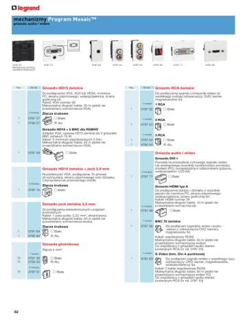 mechanizmy Program Mosaic™ gniazda audio i wideo 0787 57 Montaż przy pomocy zacisków śrubowych Pak. Nr ref. 0787 64 0787 74 0787 53 Gniazdo HD15 żeńskie Do podłączenia VGA, XGA lub VESA, monitora PC, ekranu plazmowego, wideoprojektora, ściany graficznej itd. Kabel: VGA rozmiar 28. Maksymalna długość kabla: 25 m (jeżeli nie przewidziano wzmacniacza VGA). 2 moduły Pak. 0787 57 Białe 1 0792 57 Alu 1 moduł 1 0787 59 0787 54 Białe 1 0792 54 Alu 1 moduł 2 moduły 1 0787 71 2 moduły Do podłączenia stereofonicznych urządzeń przenośnych. Kabel: 1 para audio, 0,22 mm2, ekranowana. Maksymalna długość kabla: 50 m (jeżeli nie przewidziano wzmacniacza audio). 1 Złącza śrubowe 1 Białe 1 0792 64 Alu 0787 68 1 moduł 0787 58 Złącza 4 mm² 1 moduł 1 moduł 10 0787 51 2 moduły 52 Białe 3 RCA Gniazdo DVI-I Pozwala na przesyłanie cyfrowego sygnału wideo lub analogowego wysokiej rozdzielczości pomiędzy źródłem (PC) i kompatybilnym odbiornikiem (plazma, wideoprojektor LCD itd.) Białe Gniazdo HDMI typ A Do podłączenia obrazu i dźwięku o wysokiej jakości do monitora PC, ekranu plazmowego, wideoprojektora, ściany graficznej itd. Kabel: HDMI rozmiar 24. Maksymalna długość kabla: 10 m (jeżeli nie przewidziano wzmacniacza). Białe BNC 75 żeńskie Do podłączeń sygnałów wideo i audio-stereo z odtwarzacza DVD, kamery, magnetowidu itd. Kabel: współosiowy RG59. Maksymalna długość kabla: 50 m (jeżeli nie przewidziano wzmacniacza wideo). Do współpracy z gniazdem audio-stereo: podwójnym RCA (nr ref. 0787 53). Gniazda głośnikowe Białe Alu Białe Gniazda audio i wideo Białe 0787 64 2 RCA 1 Złącza śrubowe 1 0787 50 0792 50 Białe 0787 53 Gniazdo jack żeńskie 3,5 mm 10 10 1 RCA 0787 52 Białe Rozdzielczość VGA, podłączenie 15-pinowe do komputera, ekranu plazmowego oraz dźwięku z komputera lub przenośnego źródła. 0787 74 Gniazdo RCA żeńskie 1 Gniazdo HD15 żeńskie + jack 3,5 mm 1 0787 68 Do podłączenia sygnału composite wideo ze wszelkiego rodzaju odtwarzaczy: DVD, kamer, magnetowidów itd. 1 moduł Gniazdo HD15 + 5 BNC dla RGBHV Adapter VGA, oprawa HD15 żeńskie do 5 gniazdek BNC żeńskich 75 W. Kabel: 5 minimum współosiowych 3 mm. Maksymalna długość kabla: 25 m (jeżeli nie przewidziano wzmacniacza VGA). 2 moduły Nr ref. 0787 71 Złącza śrubowe 1 1 0787 50 0787 54 1 0787 63 S-Video (min. Din 4-punktowe) Do podłączeń sygnału wideo z wszelkiego typu odtwarzaczy: DVD, kamer, magnetowidów, wideokonferencji itd. Kabel: 2 kable współosiowe RG59 Maksymalna długość kabla: 50 m (jeżeli nie przewidziano wzmacniacza wideo YC) Do współpracy z gniazdem audio-stereo: podwójnym RCA (nr ref. 0787 53)