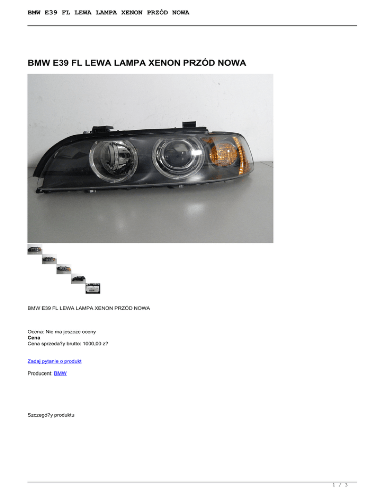 BMW E39 FL LEWA LAMPA XENON PRZÓD NOWA BMW E39 FL LEWA LAMPA XENON PRZÓD NOWA BMW E39 FL LEWA LAMPA XENON PRZÓD NOWA Ocena: Nie ma jeszcze oceny Cena Cena sprzeda?y brutto: 1000,00 z? Zadaj pytanie o produkt Producent: BMW Szczegó?y produktu O NAS Od wielu lat zajmujemy si? skupem i sprzeda?? lamp samochodowych. Posiadamy bogaty asortyment zarówno lamp u?ywanych 1 / 3 BMW E39 FL LEWA LAMPA XENON PRZÓD NOWA pochodz?cych z demonta?u, jak i nowych cz??ci. Kupuj?c u nas masz pewno?? i gwarancj? rozruchow? towaru (14 dni od momentu odbioru). Istnieje mo?liwo?? zamówienia cz??ci, gdy? 2 razy w tygodniu realizowana jest nowa dostawa towaru. WYSY?KA Towar wysy?amy w tym samym dniu je?eli zamówienie zostanie z?o?one do godz.13:00 kurierem In Post lub Poczt? Polsk?. Po godz. 13:00 przesy?ka zostanie wys?ana w nast?pnym dniu roboczym. Istnieje mo?liwo?? wysy?ki paczek (forma p?atno?ci): - za pobraniem - przedp?ata na konto Przesy?ka z regu?y dociera na nast?pny dzie? roboczy. Paczki nadawane s? tylko w dni powszednie. Istnieje mo?liwo?? osobistego odbioru reflektorów po wcze?niejszej konsultacji. Maj? Pa?stwo prawo zwrotu zakupionego towaru w ci?gu 14 dni (ustawowo) wraz z dowodem zakupu i formularzem odst?pienia od umowy zawartym na naszej stronie : http://lampy-samochodowe.pl/media/files/Formularz_Odstapienia_OU.pdf bez podania przyczyny. Nie odbieramy przesy?ek za pobraniem. ZAKUP PRZEDMIOTU BMW E39 FL LEWA LAMPA XENON PRZÓD NOWA 1. Wybierz produkt i dodaj go do koszyka. 2. Wybierz sposób zap?aty/ odbioru, uzupe?nij dane do wysy?ki 3. Ewentualne sugestie prosz? wpisa? w polu wiadomo??. 4. Oczekuj na kuriera- sprawd? zawarto?? przesy?ki przy odbiorze (wszystkie paczki s? ubezpieczone) . MODEL STRON OPIS STAN CENA /MARK A CZ??CI MAGA A ZYNO WY BMW LEWA PRZÓD, D1-39 1000,00 E39 FL XENON PLN ORYGIN A?, NOWALAMPA NIGDY NIE BY?A ZA ?O?ONA NA SAM OCHODZ IE, LUSTRO NIEWYP ALONE, REGULA TORY Z CZARNE GO TWO RZYWANIE KRU SZEJ?, + USZCZE LKI + KO SZYCZE K NA PR ZETWOR 2 / 3 BMW E39 FL LEWA LAMPA XENON PRZÓD NOWA NIC? PARAGON/FAKTURA Do ka?dej zakupionej cz??ci do??czamy paragon . Je?li ?ycz? Pa?stwo sobie faktur?, prosimy o informacj? wraz z danymi niezb?dnymi do jej wystawienia. KONTAKT: Wszelkie zapytania prosimy kierowa? na e-mail: [email protected] Wszystkie przedmioty s? dok?adnie opisane i skatalogowane. Je?li masz dodatkowe pytania prosimy o kontakt pod nr tel.: 798-986-497 GODZINY OTWARCIA: Pracujemy od poniedzia?ku do pi?tku w godz. 8:00- 16:00. STRONA WWW: www.lampy-samochodowe.pl ZAMIENNIKI: Nie kupuj zamienników na innych aukcjach. S? to cz??ci o krótkiej ?ywotno?ci i s?abej jako?ci wykonania. Pos?u?? na zdecydowanie krótszy czas ni? cz??ci oryginalne, mimo, ?e s? nowe. Zakup na naszych aukcjach jest jednoznaczny z akceptacj? regulaminu dost?pnego na naszej stronie. DZI?KUJEMY ZA ZAINTERESOWANIE 3 / 3 Powered by TCPDF (www.tcpdf.org)