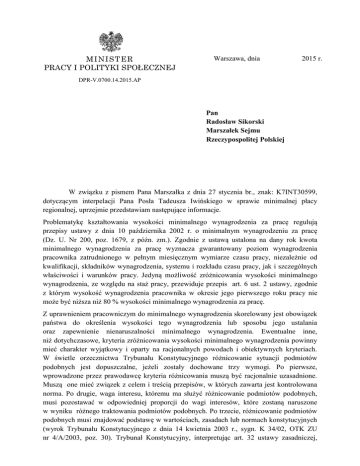MINIST ER PRACY I POLITYKI SPOŁECZNEJ Warszawa, dnia 2015 r. DPR-V.0700.14.2015.AP Pan Radosław Sikorski Marszałek Sejmu Rzeczypospolitej Polskiej W związku z pismem Pana Marszałka z dnia 27 stycznia br., znak: K7INT30599, dotyczącym interpelacji Pana Posła Tadeusza Iwińskiego w sprawie minimalnej płacy regionalnej, uprzejmie przedstawiam następujące informacje. Problematykę kształtowania wysokości minimalnego wynagrodzenia za pracę regulują przepisy ustawy z dnia 10 października 2002 r. o minimalnym wynagrodzeniu za pracę (Dz. U. Nr 200, poz. 1679, z późn. zm.). Zgodnie z ustawą ustalona na dany rok kwota minimalnego wynagrodzenia za pracę wyznacza gwarantowany poziom wynagrodzenia pracownika zatrudnionego w pełnym miesięcznym wymiarze czasu pracy, niezależnie od kwalifikacji, składników wynagrodzenia, systemu i rozkładu czasu pracy, jak i szczególnych właściwości i warunków pracy. Jedyną możliwość zróżnicowania wysokości minimalnego wynagrodzenia, ze względu na staż pracy, przewiduje przepis art. 6 ust. 2 ustawy, zgodnie z którym wysokość wynagrodzenia pracownika w okresie jego pierwszego roku pracy nie może być niższa niż 80 % wysokości minimalnego wynagrodzenia za pracę. Z uprawnieniem pracowniczym do minimalnego wynagrodzenia skorelowany jest obowiązek państwa do określenia wysokości tego wynagrodzenia lub sposobu jego ustalania oraz zapewnienie nienaruszalności minimalnego wynagrodzenia. Ewentualne inne, niż dotychczasowe, kryteria zróżnicowania wysokości minimalnego wynagrodzenia powinny mieć charakter wyjątkowy i oparty na racjonalnych powodach i obiektywnych kryteriach. W świetle orzecznictwa Trybunału Konstytucyjnego różnicowanie sytuacji podmiotów podobnych jest dopuszczalne, jeżeli zostały dochowane trzy wymogi. Po pierwsze, wprowadzone przez prawodawcę kryteria różnicowania muszą być racjonalnie uzasadnione. Muszą one mieć związek z celem i treścią przepisów, w których zawarta jest kontrolowana norma. Po drugie, waga interesu, któremu ma służyć różnicowanie podmiotów podobnych, musi pozostawać w odpowiedniej proporcji do wagi interesów, które zostaną naruszone w wyniku różnego traktowania podmiotów podobnych. Po trzecie, różnicowanie podmiotów podobnych musi znajdować podstawę w wartościach, zasadach lub normach konstytucyjnych (wyrok Trybunału Konstytucyjnego z dnia 14 kwietnia 2003 r., sygn. K 34/02, OTK ZU nr 4/A/2003, poz. 30). Trybunał Konstytucyjny, interpretując art. 32 ustawy zasadniczej, zwracał uwagę, że „żadne kryterium nie może stanowić podstawy dla różnicowań niesprawiedliwych, dyskryminujących określone podmioty” (wyrok z dnia 23 października 2001 r., sygn. K 22/01, OTK ZU nr 7/2001, poz. 215). Należy podkreślić, że przepisy obowiązującej ustawy określając minimalne gwarancje wzrostu tego wynagrodzenia, nie ograniczają możliwości ustalenia jego wysokości na wyższym poziomie. Jednakże, procedura kształtowania właściwego poziomu minimalnego wynagrodzenia powinna być (tak jak dotychczas) przedmiotem negocjacji partnerów społecznych, prowadzonych z uwzględnieniem aktualnych oraz prognozowanych uwarunkowań ekonomicznych. Obowiązujący tryb ustalania wysokości minimalnego wynagrodzenia uwzględnia aktualną sytuację społeczno-gospodarczą, w tym zwłaszcza możliwości pokrycia skutków finansowych podwyższenia minimalnego wynagrodzenia przez przedsiębiorców, jak i budżety jednostek samorządu terytorialnego oraz budżet państwa; w sytuacji, gdy zaistnieją sprzyjające uwarunkowania społeczno-gospodarcze, przepisy ustawy nie ograniczają możliwości negocjowania wyższego wzrostu wysokości minimalnego wynagrodzenia niż gwarantowany ustawowo. Odnosząc się do poruszonej w interpelacji kwestii przyspieszenia tempa wzrostu minimalnego wynagrodzenia, należy zwrócić uwagę, że według danych Eurostatu relacja między wynagrodzeniem minimalnym a przeciętnym w sektorze przedsiębiorstw w państwach Unii Europejskiej w latach 2008 - 2013 przyjmowała wartości w granicach od 31,3% w Rumunii (2008 r.) do 56,4% w Grecji (2011 r.). W badanym okresie zaledwie w czterech państwach wliczając Grecję, wynagrodzenie minimalne osiągało wysokość 50% przeciętnego wynagrodzenia (Słowenia, Luksemburg, Malta). W 2013 r. wynagrodzenie minimalne w Polsce stanowiło 44,8% przeciętnego wynagrodzenia w sektorze przedsiębiorstw, a Polska była na 5. miejscu pod względem wysokości relacji między płacą minimalną a przeciętną, wśród 16 krajów UE, dla których dane za 2013 r. są dostępne. Dla porównania, w 2008 r. wynagrodzenie minimalne w Polsce stanowiło tylko 35,7% przeciętnego wynagrodzenia, a Polska była na 16. miejscu z 20 krajów, dla których są dostępne dane. W latach 2004 – 2015 wynagrodzenie minimalne rosło w Polsce wyraźnie szybciej, niż wynagrodzenie przeciętne. Płaca minimalna w Polsce wzrosła z 824 zł w 2004 r. do 1750 zł w 2015 r., a więc obecnie wynosi ponad dwa razy więcej niż 11 lat temu. Przeciętne miesięczne wynagrodzenie brutto w przedsiębiorstwach zatrudniających 9 i więcej osób w tym samym okresie wzrosło o 65%: z 2 409,69 zł średnio w 2004 r. do 3 966,78 zł 1 w 2014 r. Osiąganie określonej relacji wysokości płacy minimalnej w stosunku do przeciętnego wynagrodzenia nie jest celem samym w sobie. Istotną kwestią jest natomiast ustalenie płacy minimalnej w takiej wysokości, aby miała ona pozytywny wpływ na podwyższenie poziomu życia obywateli, przy jednoczesnym zapewnieniu utrzymania wysokich wskaźników zatrudnienia. Decyzja o ustaleniu wysokości minimalnego wynagrodzenia jest kwestią złożoną. Analiza wynagrodzeń na poziomie województw i powiatów wskazuje, że trudno byłoby ustalić 1 Średnia z 12 miesięcy. 2 odpowiednią wysokość płacy minimalnej również na poziomie regionalnym. Przeciętne wynagrodzenie w poszczególnych województwach
