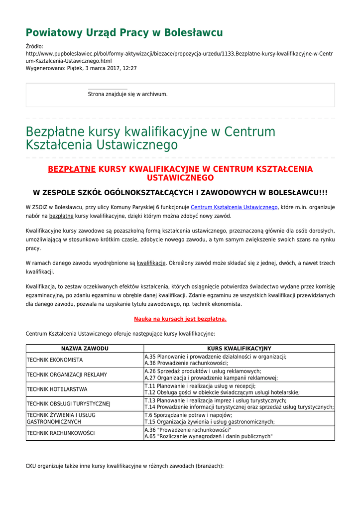 Powiatowy Urząd Pracy w Bolesławcu Źródło: http://www.pupboleslawiec.pl/bol/formy-aktywizacji/biezace/propozycja-urzedu/1133,Bezplatne-kursy-kwalifikacyjne-w-Centr um-Ksztalcenia-Ustawicznego.html Wygenerowano: Piątek, 3 marca 2017, 12:27 Strona znajduje się w archiwum. Bezpłatne kursy kwalifikacyjne w Centrum Kształcenia Ustawicznego BEZPŁATNE KURSY KWALIFIKACYJNE W CENTRUM KSZTAŁCENIA USTAWICZNEGO W ZESPOLE SZKÓŁ OGÓLNOKSZTAŁCĄCYCH I ZAWODOWYCH W BOLESŁAWCU!!! W ZSOiZ w Bolesławcu, przy ulicy Komuny Paryskiej 6 funkcjonuje Centrum Kształcenia Ustawicznego, które m.in. organizuje nabór na bezpłatne kursy kwalifikacyjne, dzięki którym można zdobyć nowy zawód. Kwalifikacyjne kursy zawodowe są pozaszkolną formą kształcenia ustawicznego, przeznaczoną głównie dla osób dorosłych, umożliwiającą w stosunkowo krótkim czasie, zdobycie nowego zawodu, a tym samym zwiększenie swoich szans na rynku pracy. W ramach danego zawodu wyodrębnione są kwalifikacje. Określony zawód może składać się z jednej, dwóch, a nawet trzech kwalifikacji. Kwalifikacja, to zestaw oczekiwanych efektów kształcenia, których osiągnięcie potwierdza świadectwo wydane przez komisję egzaminacyjną, po zdaniu egzaminu w obrębie danej kwalifikacji. Zdanie egzaminu ze wszystkich kwalifikacji przewidzianych dla danego zawodu, pozwala na uzyskanie tytułu zawodowego, np. technik ekonomista. Nauka na kursach jest bezpłatna. Centrum Kształcenia Ustawicznego oferuje następujące kursy kwalifikacyjne: NAZWA ZAWODU TECHNIK EKONOMISTA TECHNIK ORGANIZACJI REKLAMY TECHNIK HOTELARSTWA TECHNIK OBSŁUGI TURYSTYCZNEJ TECHNIK ŻYWIENIA I USŁUG GASTRONOMICZNYCH TECHNIK RACHUNKOWOŚCI KURS KWALIFIKACYJNY A.35 Planowanie i prowadzenie działalności w organizacji; A.36 Prowadzenie rachunkowości; A.26 Sprzedaż produktów i usług reklamowych; A.27 Organizacja i prowadzenie kampanii reklamowej; T.11 Planowanie i realizacja usług w recepcji; T.12 Obsługa gości w obiekcie świadczącym usługi hotelarskie; T.13 Planowanie i realizacja imprez i usług turystycznych; T.14 Prowadzenie informacji turystycznej oraz sprzedaż usług turystycznych; T.6 Sporządzanie potraw i napojów; T.15 Organizacja żywienia i usług gastronomicznych; A.36 "Prowadzenie rachunkowości" A.65 "Rozliczanie wynagrodzeń i danin publicznych" CKU organizuje także inne kursy kwalifikacyjne w różnych zawodach (branżach): ● administracyjno-usługowych, ● budowlanych, ● elektryczno-elektronicznych, ● mechanicznych i górniczo-hutniczych, ● rolniczo-leśnych z ochroną środowiska, ● turystyczno-gastronomicznych, ● medyczno-społecznych, ● artystycznych, w zależności od potrzeb chętnych zgłaszających się do ośrodka. Dyplom technika w danym zawodzie może otrzymać osoba, która posiada średnie wykształcenie oraz świadectwa potwierdzające kwalifikacje zawodowe. Osoba posiadająca wykształcenie zasadnicze zawodowe, która zdobędzie świadectwa potwierdzające kwalifikacje zawodowe i uzupełni wykształcenie średnie w liceum ogólnokształcącym dla dorosłych również może uzyskać tytuł technika. Osoby bezrobotne, które pragną uzyskać kwalifikacje umożliwiające im uzyskanie pracy, zdobycie zupełnie nowego zawodu, mogą osiągnąć ten cel zapisując się na odpowiedni kurs kwalifikacyjny!!! Osoby zainteresowane bezpłatnymi kursami zapraszamy do siedziby CKU w Zespole Szkół Ogólnokształcących i Zawodowych przy ulicy Komuny Paryskiej 6 w Bolesławcu (tel. 75 732 4009, 75 732 3983), na stronę internetową www.cku.boleslawiec.pl oraz do kontaktu e-mailowego [email protected] Metryka strony Data publikacji 13.12.2013 Obowiązuje od 13.12.2013 Data modyfikacji 03.06.2016Rejestr zmian Osoba publikująca: Łukasz Jakubowski Autor: Katarzyna Hudyma CAZ Liczba wejść: 7200 Drukuj Generuj PDF Powiadom znajomego kursy, ustawicznego, kształcenia, centrum, informacja Wstecz