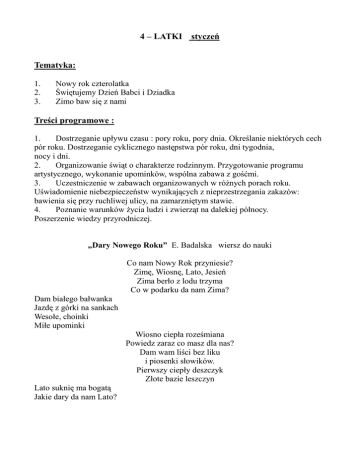 4 – LATKI styczeń Tematyka: 1. 2. 3. Nowy rok czterolatka Świętujemy Dzień Babci i Dziadka Zimo baw się z nami Treści programowe : 1. Dostrzeganie upływu czasu : pory roku, pory dnia. Określanie niektórych cech pór roku. Dostrzeganie cyklicznego następstwa pór roku, dni tygodnia, nocy i dni. 2. Organizowanie świąt o charakterze rodzinnym. Przygotowanie programu artystycznego, wykonanie upominków, wspólna zabawa z gośćmi. 3. Uczestniczenie w zabawach organizowanych w różnych porach roku. Uświadomienie niebezpieczeństw wynikających z nieprzestrzegania zakazów: bawienia się przy ruchliwej ulicy, na zamarzniętym stawie. 4. Poznanie warunków życia ludzi i zwierząt na dalekiej północy. Poszerzenie wiedzy przyrodniczej. „Dary Nowego Roku” E. Badalska wiersz do nauki Co nam Nowy Rok przyniesie? Zimę, Wiosnę, Lato, Jesień Zima berło z lodu trzyma Co w podarku da nam Zima? Dam białego bałwanka Jazdę z górki na sankach Wesołe, choinki Miłe upominki Wiosno ciepła roześmiana Powiedz zaraz co masz dla nas? Dam wam liści bez liku i piosenki słowików. Pierwszy ciepły deszczyk Złote bazie leszczyn Lato suknię ma bogatą Jakie dary da nam Lato? Dam pogodne słońce, bukiety pachnące, w polu złote zboże, ciepły piach nad morzem Jesień od podarków gnie się a co jesień nam przyniesie? Dam wam to co trzeba, świeży bochen chleba i owoców kosze. Częstujcie się proszę! Nowy Roku z podarkami! Dziś karnawał! Zatańcz z nami!
