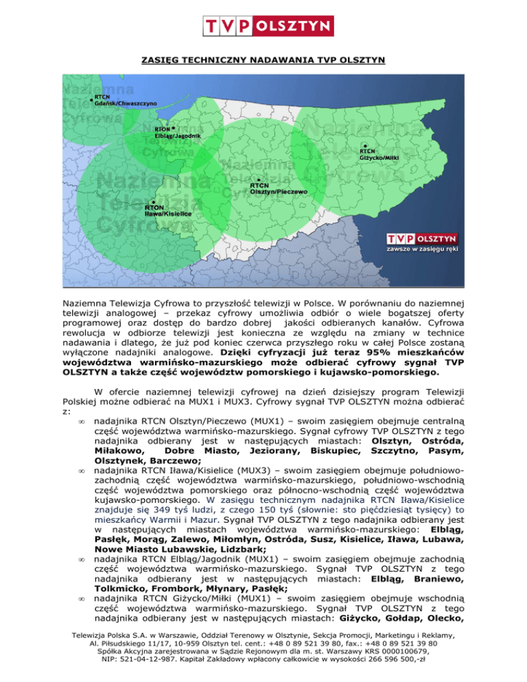 ZASIĘG TECHNICZNY NADAWANIA TVP OLSZTYN Naziemna Telewizja Cyfrowa to przyszłość telewizji w Polsce. W porównaniu do naziemnej telewizji analogowej – przekaz cyfrowy umożliwia odbiór o wiele bogatszej oferty programowej oraz dostęp do bardzo dobrej jakości odbieranych kanałów. Cyfrowa rewolucja w odbiorze telewizji jest konieczna ze względu na zmiany w technice nadawania i dlatego, że już pod koniec czerwca przyszłego roku w całej Polsce zostaną wyłączone nadajniki analogowe. Dzięki cyfryzacji już teraz 95% mieszkańców województwa warmińsko-mazurskiego może odbierać cyfrowy sygnał TVP OLSZTYN a także część województw pomorskiego i kujawsko-pomorskiego. W ofercie naziemnej telewizji cyfrowej na dzień dzisiejszy program Telewizji Polskiej możne odbierać na MUX1 i MUX3. Cyfrowy sygnał TVP OLSZTYN można odbierać z: • nadajnika RTCN Olsztyn/Pieczewo (MUX1) – swoim zasięgiem obejmuje centralną część województwa warmińsko-mazurskiego. Sygnał cyfrowy TVP OLSZTYN z tego nadajnika odbierany jest w następujących miastach: Olsztyn, Ostróda, Miłakowo, Dobre Miasto, Jeziorany, Biskupiec, Szczytno, Pasym, Olsztynek, Barczewo; • nadajnika RTCN Iława/Kisielice (MUX3) – swoim zasięgiem obejmuje południowozachodnią część województwa warmińsko-mazurskiego, południowo-wschodnią część województwa pomorskiego oraz północno-wschodnią część województwa kujawsko-pomorskiego. W zasięgu technicznym nadajnika RTCN Iława/Kisielice znajduje się 349 tyś ludzi, z czego 150 tyś (słownie: sto pięćdziesiąt tysięcy) to mieszkańcy Warmii i Mazur. Sygnał TVP OLSZTYN z tego nadajnika odbierany jest w następujących miastach województwa warmińsko-mazurskiego: Elbląg, Pasłęk, Morąg, Zalewo, Miłomłyn, Ostróda, Susz, Kisielice, Iława, Lubawa, Nowe Miasto Lubawskie, Lidzbark; • nadajnika RTCN Elbląg/Jagodnik (MUX1) – swoim zasięgiem obejmuje zachodnią część województwa warmińsko-mazurskiego. Sygnał TVP OLSZTYN z tego nadajnika odbierany jest w następujących miastach: Elbląg, Braniewo, Tolkmicko, Frombork, Młynary, Pasłęk; • nadajnika RTCN Giżycko/Miłki (MUX1) – swoim zasięgiem obejmuje wschodnią część województwa warmińsko-mazurskiego. Sygnał TVP OLSZTYN z tego nadajnika odbierany jest w następujących miastach: Giżycko, Gołdap, Olecko, Telewizja Polska S.A. w Warszawie, Oddział Terenowy w Olsztynie, Sekcja Promocji, Marketingu i Reklamy, Al. Piłsudskiego 11/17, 10-959 Olsztyn tel. cent.: +48 0 89 521 39 80, fax.: +48 0 89 521 39 80 Spółka Akcyjna zarejestrowana w Sądzie Rejonowym dla m. st. Warszawy KRS 0000100679, NIP: 521-04-12-987. Kapitał Zakładowy wpłacony całkowicie w wysokości 266 596 500,-zł • Ełk, Orzysz, Pisz, Biała Piska, Mikołajki, Mrągowo, Ryn, Kętrzyn, Węgorzewo; nadajnika RTCN Gdańsk/Chwaszczyno (MUX3) – swoim zasięgiem obejmuje północno-wschodnią część województwa pomorskiego. Sygnał cyfrowy TVP OLSZTYN z tego nadajnika odbierany jest w następujących miastach województwa pomorskiego: Gdańsk, Gdynia, Władysławowo, Puck, Jastarnia, Wejherowo, Kartuzy, Pruszcz Gdański. Sygnał TVP OLSZTYN można odbierać również poprzez lokalne telewizje kablowe : • Multimedia Polska S.A. – sygnał TVP OLSZTYN odbierany jest przez wszystkich abonentów telewizji kablowej Multimedia w nadawaniu analogowym i cyfrowym. Największe miasta województwa warmińsko-mazurskiego, w których Multimedia Polska S.A. świadczy swoje usługi: Ełk, Mrągowo, Gołdap, Giżycko, Węgorzewo, Kętrzyn, Orzysz, Olsztyn, Ostróda, Iława, Pasłęk, Szczytno, Biskupiec, RucianeNida. • Vectra S.A. - sygnał TVP OLSZTYN odbierany jest przez wszystkich abonentów telewizji kablowej Vectra w nadawaniu analogowym i cyfrowym. Największe miasta województwa warmińsko-mazurskiego, w których VECTRA S.A. świadczy swoje usługi: Olsztyn, Ostróda, Bartoszyce, Braniewo, Działdowo, Morąg, Nidzica, Susz, Elbląg. • Eltronik „Media” Sp. z o.o. – Sp. k. – od 1 kwietnia 2011 roku sygnał TVP OLSZTYN ma być odbierany przez abonentów telewizji kablowej ELtronik w nadawaniu cyfrowym w następujących miastach: Brodnica, Lubawa, Nowe Miasto Lubawskie. Telewizja Polska S.A. w Warszawie, Oddział Terenowy w Olsztynie, Sekcja Promocji, Marketingu i Reklamy, Al. Piłsudskiego 11/17, 10-959 Olsztyn tel. cent.: +48 0 89 521 39 80, fax.: +48 0 89 521 39 80 Spółka Akcyjna zarejestrowana w Sądzie Rejonowym dla m. st. Warszawy KRS 0000100679, NIP: 521-04-12-987. Kapitał Zakładowy wpłacony całkowicie w wysokości 266 596 500,-zł