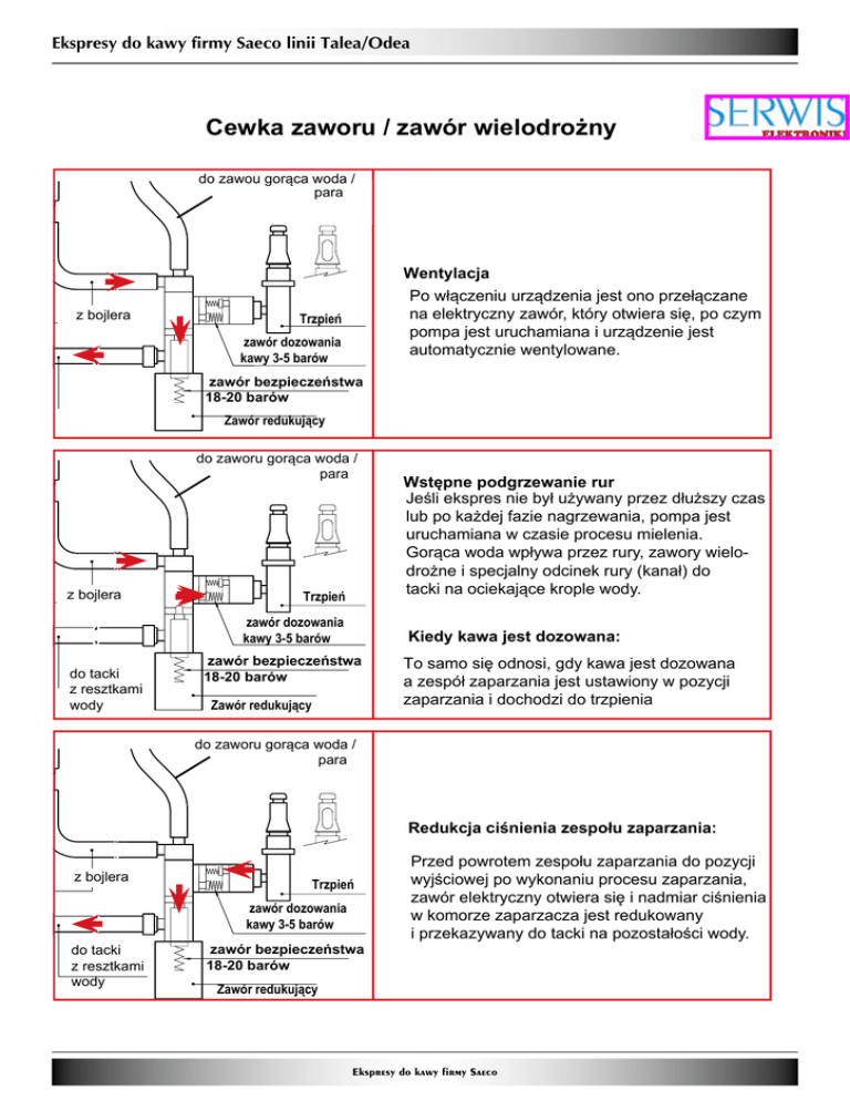 Ekspresy do kawy firmy Saeco linii Talea/Odea Cewka zaworu / zawór wielodrożny do zawou gorąca woda / para z bojlera Wentylacja Po włączeniu urządzenia jest ono przełączane na elektryczny zawór, który otwiera się, po czym pompa jest uruchamiana i urządzenie jest automatycznie wentylowane. Trzpień zawór dozowania kawy 3-5 barów Wasserauslaufstutzen zawór 16-19bezpieczeństwa bar safety valve 18-20 barów Zawór redukujący do zaworu gorąca woda / para z bojlera Trzpień zawór dozowania kawy 3-5 barów do tacki z resztkami wody Wasserauslaufstutzen Wstępne podgrzewanie rur Jeśli ekspres nie był używany przez dłuższy czas lub po każdej fazie nagrzewania, pompa jest uruchamiana w czasie procesu mielenia. Gorąca woda wpływa przez rury, zawory wielodrożne i specjalny odcinek rury (kanał) do tacki na ociekające krople wody. Kiedy kawa jest dozowana: zawór bezpieczeństwa 16-19 bar safety valve 18-20 barów Zawór redukujący To samo się odnosi, gdy kawa jest dozowana a zespół zaparzania jest ustawiony w pozycji zaparzania i dochodzi do trzpienia do zaworu gorąca woda / para Redukcja ciśnienia zespołu zaparzania: z bojlera Trzpień zawór dozowania kawy 3-5 barów do tacki z resztkami Wasserauslaufstutzen wody zawór 16-19bezpieczeństwa bar safety valve 18-20 barów Przed powrotem zespołu zaparzania do pozycji wyjściowej po wykonaniu procesu zaparzania, zawór elektryczny otwiera się i nadmiar ciśnienia w komorze zaparzacza jest redukowany i przekazywany do tacki na pozostałości wody. Zawór redukujący Ekspresy do kawy firmy Saeco Ekspresy do kawy firmy Saeco linii Talea/Odea do zawou gorąca woda / para Redukcja ciśnienia w układzie rur: z bojlera Trzpień zawór dozowania kawy 3-5 barów do tacki Wasserauslaufstutzen z resztkami wody zawór bezpieczeństwa 16-19 bar safety valve 18-20 barów Zawór redukujący do zawou gorąca woda / para (2) (1) z bojlera Trzpień zawór dozowania kawy 3-5 barów do tacki Wasserauslaufstutzen z resztkami wody Zawór elektryczny otwiera się, aby zmniejszyć ciśnienie w układzie rur: Za każdym razem gorąca woda i para są wykorzystywane. Każdorazowo mleko jest spienione z Milk Island (dodatkowe urządzenie podłączone do ekspresu do przygotowania mleka) zawór 16-19bezpieczeństwa bar safety valve 18-20 barów Zawór redukujący Zawór nadciśnieniowy (zawór bezpieczeństwa) Jako zawór wielodrożny otwiera się już przy ciśnieniu 3-5 barów w kierunku przepływu i przejmuje funkcję nadciśnienia (1), wtedy kiedy zespół zaparzacza nie jest w pozycji zaparzania. Jeśli zespół zaparzacza jest w pozycji zaparzania, kiedy występuje nadciśnienie i / lub zawór wielodrożny jest blokowany, magnes zaworu działa jak zawór nadciśnieniowy i otwiera się pod wpływem skoku ciśnienia wynoszącego 16 - 19 barów (2) Kurek gorąca woda / para Magnes Czujniki Halla Kurek gorąca woda / para Zawór gorąca woda / para ma 3 pozycje: 1. Środkowa pozycja = zamknięty 2. Gorąca woda / para 3. Milk Island (nie dla modelu Odea) Trzy pozycje zaworu gorąca woda / para są nadzorowane przez 3 czujniki Halla i magnes, który jest odpowiednio usytuowany w osi zaworu w zależności od stanu gorąca woda / para Woda gorąca/ z bojlera para do Milk Island Ekspresy do kawy firmy Saeco Ekspresy do kawy firmy Saeco linii Talea/Odea Cykle przygotowania kawy Włącznik włączony START STOP Taktowanie Impuls (Dawkowanie) Mielenie kawy ok. 45 s Grzanie Praca pompy (impuls miernika przepływu) stosownie do pojemności filiżanki Pompa * Silnik przekładniowy zespół zaparzacza Status Cykl podgrzania Gotowe Cykl przygotowania kawy Uwaga: * tylko z cyklem wstępnego zaparzania Status MS1 Status MS2 OFF ON Mechanizm przekładniowy z 2 mikroprzełącznikami (MS) Status MS OFF ON Mechanizm przekładniowy z 1 mikroprzełącznikiem(MS) Aby włączyć; • • • 1. 2. 3. 4. 5. Kiedy główny przełącznik jest włączony, przekładnia wyszukuje pierwotnego położenia i przesuwa się w dół do mikroprzełącznika (MS) (z krzywką 1, patrz następny rozdział). Silnik przekładniowy zmienia kierunek obrotów, cofa się i zatrzymuje ok. 1 - 2 mm po opuszczeniu mikroprzełącznika Przepływowy podgrzewacz uruchamia się, żeby podgrzać wodę przez około 45 sekund, aby osiągnąć temperaturę pracy. 40 sekund, które jest potrzebne, aby osiągnąć pełną moc grzewczą i zapas mocy skierować do ponownego wykorzystania Cykl przygotowania kawy: Młynek do kawy rozpoczyna proes mielenia ziaren kawy (impuls-sterowany). Przekładnie przesuwa zespół zaparzacza do pozycji zaparzania. Następnie rozpoczyna się cykl parzenia wstępnego (krótka praca pompy, następnie szybka przerwa). Proces parzenia (okres działnia pompy, w zależności od wybranej ilości kawy) Przekładnia porusza się do pozycji wyjściowej (zaparzone fusy są automatycznie wyrzucane). Ekspresy do kawy firmy Saeco