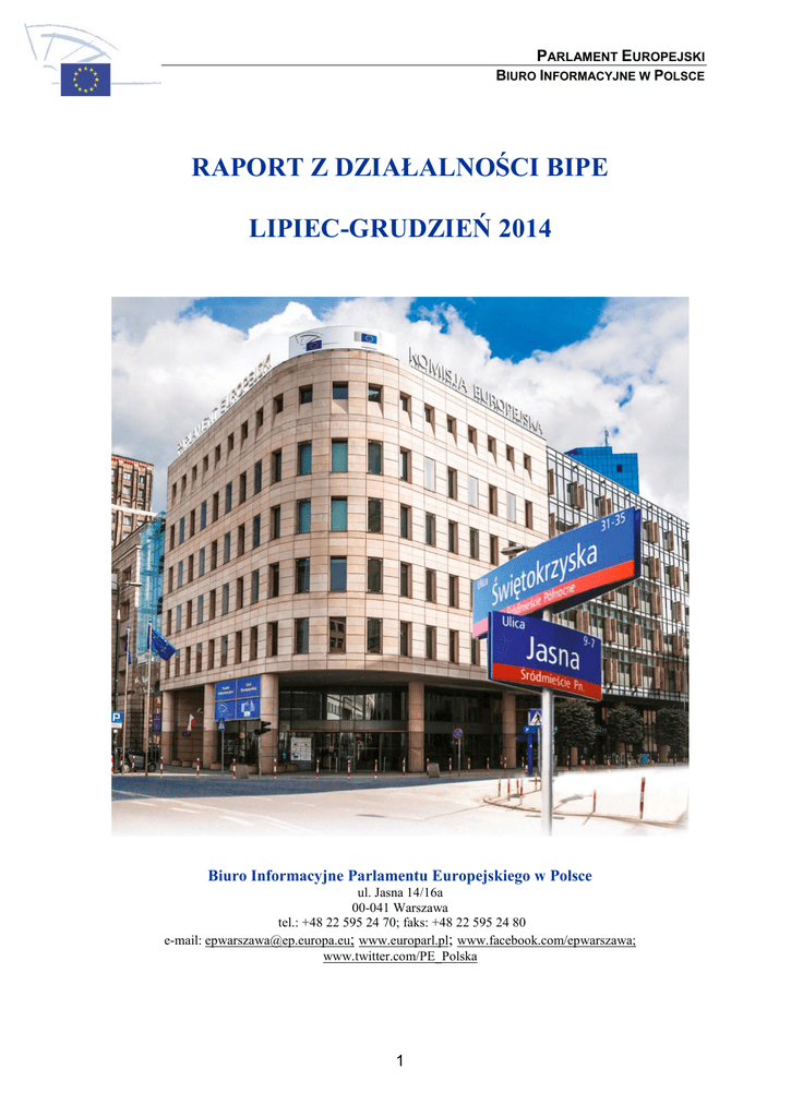PARLAMENT EUROPEJSKI BIURO INFORMACYJNE W POLSCE RAPORT Z DZIAŁALNOŚCI BIPE LIPIEC-GRUDZIEŃ 2014 Biuro Informacyjne Parlamentu Europejskiego w Polsce ul. Jasna 14/16a 00-041 Warszawa tel.: +48 22 595 24 70; faks: +48 22 595 24 80 e-mail: [email protected]; www.europarl.pl; www.facebook.com/epwarszawa; www.twitter.com/PE_Polska 1 PARLAMENT EUROPEJSKI BIURO INFORMACYJNE W POLSCE SPIS TREŚCI MISJA BIURA INFORMACYJNEGO PARLAMENTU EUROPEJSKIEGO W POLSCE ..........3 DZIAŁANIA BIPE W OKRESIE LIPIEC-GRUDZIEŃ 2014............................................................5 LIPIEC ...................................................................................................................................................7 SIERPIEŃ ...............................................................................................................................................8 WRZESIEŃ .............................................................................................................................................9 PAŹDZIERNIK ......................................................................................................................................10 LISTOPAD ............................................................................................................................................11 GRUDZIEŃ ...........................................................................................................................................16 DZIAŁANIA BIPE O CHARAKTERZE CIĄGŁYM .......................................................................16 2 PARLAMENT EUROPEJSKI BIURO INFORMACYJNE W POLSCE MISJA BIURA INFORMACYJNEGO PARLAMENTU EUROPEJSKIEGO W POLSCE Biuro Informacyjne Parlamentu Europejskiego (BIPE) realizuje w Polsce strategię komunikacyjną i plan działania Dyrekcji Generalnej Parlamentu Europejskiego ds. Komunikacji zgodnie z decyzjami Prezydium PE. Jego głównymi celami są: informowanie obywateli bezpośrednio i poprzez media (ogólnokrajowe, regionalne i specjalistyczne) o decyzjach podejmowanych przez Parlament Europejski (PE); możliwie jak najszersze promowanie Parlamentu i jego działalności. Biuro zaprasza do uczestnictwa w swoich działaniach możliwie jak największą liczbę posłów do PE. Główne zadania BIPE w 2014 roku: upowszechnienie wśród obywateli informacji o Parlamencie, o wyborach i o ich politycznym znaczeniu; dalsze upowszechnienie wyniku wyborów, informowanie o ukonstytuowaniu się organów PE i wyborze szefa Komisji Europejskiej, przesłuchaniach kandydatów na komisarzy i zatwierdzeniu nowego składu KE przez Parlament; informowanie o roli PE poprzez organizację debat, konferencji i spotkań z posłami, m.in. w ramach cyklu: „Nowy Parlament Europejski”, prezentującego plany legislacyjne PE nowej kadencji; pogłębienie wiedzy o PE wśród obywateli i organizacji społeczeństwa obywatelskiego, w celu umożliwienia większego zaangażowania w sprawy Unii Europejskiej; zwiększenie zasięgu komunikacji dotyczącej PE poprzez wykorzystanie oddziaływania mediów i liderów opinii publicznej; celem działań Biura jest dotarcie z informacją o PE do obywateli ze wszystkich istotnych grup społecznych w Polsce, a w szczególności do młodzieży oraz organizacji społeczeństwa obywatelskiego; realizacja w Polsce kampanii informacyjnych organizowanych przez PE i dotyczących wyborów europejskich, kluczowych prac legislacyjnych PE, Nagrody im. Sacharowa, Nagrody LUX, Europejskiej Nagrody Obywatelskiej, Nagrody im. Karola Wielkiego dla Młodzieży; budowanie trwałych relacji z liderami opinii publicznej, mediami i organizacjami społeczeństwa obywatelskiego; 3 PARLAMENT EUROPEJSKI BIURO INFORMACYJNE W POLSCE kontynuacja bliskiej współpracy z mediami poprzez kontakty z dziennikarzami zainteresowanymi sesjami plenarnymi, pracą konkretnych komisji PE, lub poszczególnymi decyzjami PE; zwiększenie widoczności PE przy pomocy programu Euroscola, który stanowi atrakcyjne wprowadzenia w tematykę europejską dla przyszłych młodych wyborców; mobilizacja istniejącej sieci kontaktów z „interesariuszami” i grupami docelowymi; nasilenie działań w mediach społecznościowych; umocnienie kontaktów z mediami i stworzenie posłom dodatkowych możliwości obecności w mediach jako głównym źródle informacji o PE dla opinii publicznej; prezentacja nowych posłów poprzez media, media społecznościowe, publikacje itp.; koordynacja i wsparcie Biura Informacyjnego PE we Wrocławiu. 4 PARLAMENT EUROPEJSKI BIURO INFORMACYJNE W POLSCE KRÓTKI PRZEGLĄD DZIAŁALNOŚCI BIPE W LICZBACH W 2014 BIPE w Polsce: zapewniło dystrybucję ponad 96 tysięcy ulotek, broszur informacyjnych i materiałów promocyjnych o PE; udzieliło ponad 600 odpowiedzi na listy obywateli i ponad 1400 informacji telefonicznych; zorganizowało 4 konferencje prasowe z udziałem posłów do PE; wydało ponad 280 komunikatów prasowych i wysłało ponad 1800 informacji SMS-owych dla dziennikarzy; zaprosiło 163 dziennikarzy na seminaria w Polsce i Brukseli i 59 na sesje Parlamentu w Strasburgu i Brukseli; zarządzało stroną internetową europarl.pl, którą w II połowie 2014 r. odwiedziły 39 329 osoby, profilem na portalu Facebook, który „polubiło” do tej pory prawie 9 500 osób, i kontem na portalu Twitter, które obserwuje ponad 2 700osób; zaktualizowało aplikację mobilną „Europoseł PL - znajdź swojego europosła”, która zawiera informacje o polskich posłach do Parlamentu Europejskiego, w tym o przynależności do komisji parlamentarnych, dane teleadresowe biur czy odnośniki do profili posłów na portalach społecznościowych; zapewniło wyjazdy 480 uczniów do Strasburga w ramach programu Euroscola; w tym 24 na European Youth Event w Strasburgu; nadzorowało opracowanie 292 przeglądów prasy oraz 292 przeglądów mediów audiowizualnych. 5 PARLAMENT EUROPEJSKI BIURO INFORMACYJNE W POLSCE 6 PARLAMENT EUROPEJSKI BIU