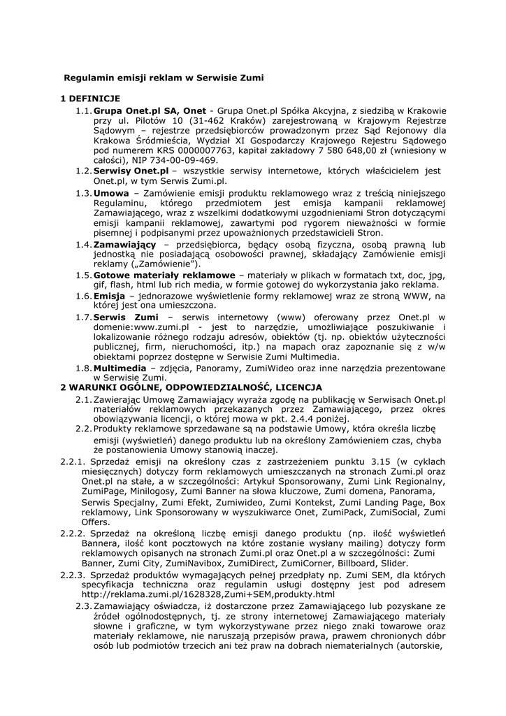 Regulamin emisji reklam w Serwisie Zumi 1 DEFINICJE 1.1. Grupa Onet.pl SA, Onet - Grupa Onet.pl Spółka Akcyjna, z siedzibą w Krakowie przy ul. Pilotów 10 (31-462 Kraków) zarejestrowaną w Krajowym Rejestrze Sądowym – rejestrze przedsiębiorców prowadzonym przez Sąd Rejonowy dla Krakowa Śródmieścia, Wydział XI Gospodarczy Krajowego Rejestru Sądowego pod numerem KRS 0000007763, kapitał zakładowy 7 580 648,00 zł (wniesiony w całości), NIP 734-00-09-469. 1.2. Serwisy Onet.pl – wszystkie serwisy internetowe, których właścicielem jest Onet.pl, w tym Serwis Zumi.pl. 1.3. Umowa – Zamówienie emisji produktu reklamowego wraz z treścią niniejszego Regulaminu, którego przedmiotem jest emisja kampanii reklamowej Zamawiającego, wraz z wszelkimi dodatkowymi uzgodnieniami Stron dotyczącymi emisji kampanii reklamowej, zawartymi pod rygorem nieważności w formie pisemnej i podpisanymi przez upoważnionych przedstawicieli Stron. 1.4. Zamawiający – przedsiębiorca, będący osobą fizyczna, osobą prawną lub jednostką nie posiadającą osobowości prawnej, składający Zamówienie emisji reklamy („Zamówienie”). 1.5. Gotowe materiały reklamowe – materiały w plikach w formatach txt, doc, jpg, gif, flash, html lub rich media, w formie gotowej do wykorzystania jako reklama. 1.6. Emisja – jednorazowe wyświetlenie formy reklamowej wraz ze stroną WWW, na której jest ona umieszczona. 1.7. Serwis Zumi – serwis internetowy (www) oferowany przez Onet.pl w domenie:www.zumi.pl - jest to narzędzie, umożliwiające poszukiwanie i lokalizowanie różnego rodzaju adresów, obiektów (tj. np. obiektów użyteczności publicznej, firm, nieruchomości, itp.) na mapach oraz zapoznanie się z w/w obiektami poprzez dostępne w Serwisie Zumi Multimedia. 1.8. Multimedia – zdjęcia, Panoramy, ZumiWideo oraz inne narzędzia prezentowane w Serwisie Zumi. 2 WARUNKI OGÓLNE, ODPOWIEDZIALNOŚĆ, LICENCJA 2.1. Zawierając Umowę Zamawiający wyraża zgodę na publikację w Serwisach Onet.pl materiałów reklamowych przekazanych przez Zamawiającego, przez okres obowiązywania licencji, o której mowa w pkt. 2.4.4 poniżej. 2.2. Produkty reklamowe sprzedawane są na podstawie Umowy, która określa liczbę emisji (wyświetleń) danego produktu lub na określony Zamówieniem czas, chyba że postanowienia Umowy stanowią inaczej. 2.2.1. Sprzedaż emisji na określony czas z zastrzeżeniem punktu 3.15 (w cyklach miesięcznych) dotyczy form reklamowych umieszczanych na stronach Zumi.pl oraz Onet.pl na stałe, a w szczególności: Artykuł Sponsorowany, Zumi Link Regionalny, ZumiPage, Minilogosy, Zumi Banner na słowa kluczowe, Zumi domena, Panorama, Serwis Specjalny, Zumi Efekt, Zumiwideo, Zumi Kontekst, Zumi Landing Page, Box reklamowy, Link Sponsorowany w wyszukiwarce Onet, ZumiPack, ZumiSocial, Zumi Offers. 2.2.2. Sprzedaż na określoną liczbę emisji danego produktu (np. ilość wyświetleń Bannera, ilość kont pocztowych na które zostanie wysłany mailing) dotyczy form reklamowych opisanych na stronach Zumi.pl oraz Onet.pl a w szczególności: Zumi Banner, Zumi City, ZumiNavibox, ZumiDirect, ZumiCorner, Billboard, Slider. 2.2.3. Sprzedaż produktów wymagających pełnej przedpłaty np. Zumi SEM, dla których specyfikacja techniczna oraz regulamin usługi dostępny jest pod adresem http://reklama.zumi.pl/1628328,Zumi+SEM,produkty.html 2.3. Zamawiający oświadcza, iż dostarczone przez Zamawiąjącego lub pozyskane ze źródeł ogólnodostępnych, tj. ze strony internetowej Zamawiającego materiały słowne i graficzne, w tym wykorzystywane przez niego znaki towarowe oraz materiały reklamowe, nie naruszają przepisów prawa, prawem chronionych dóbr osób lub podmiotów trzecich ani też praw na dobrach niematerialnych (autorskie, pokrewne, wynalazcze, na znakach towarowych lub wzorach zdobniczych, z tytułu tajemnicy przedsiębiorstwa, praw własności przemysłowej i inne) oraz jest on uprawniony do ich używania. 2.4. Zamawiający oświadcza iż: 2.4.1. Jest uprawniony do wyrażenia i wyraża zgodę na wykonanie, rozpowszechnianie i korzystanie w dowolnym celu, dowolną techniką, w dowolny sposób z wszelkich materiałów wykonanych w związku z realizacją Zamówienia, w szczególności materiałów koniecznych do realizacji Zamówienia dostarczonych przez niego lub pozyskanych ze źródeł ogólnodostępnych, tj. jego strony internetowej. Powyższa zgoda udzielona jest na rzecz Onet.pl oraz podmiotów wskazanych przez Onet.pl. 2.4.2. wykonanie, rozpowszechnianie i korzystanie z materiałów wykonanych w związku z realizacją Zamówienia nie narusza praw osób trzecich. 2.4.3. dysponuje w zakresie materiałów o których mowa powyżej, zgodą twórcy na rozporządzanie jego utworem w zakresie niezbędnym do realizacji Zamówienia oraz spełnienia pozostałych obowiązków określonych w niniejszym Regulaminie. 2.4.4. udziela Onet.pl nieodpłatnej, nieograniczonej czasowo ani terytorialnie licencji na korzystanie z wszelkich materiałów dostarczonych Onet.pl przez Zamawiającego w związku z realizacją złożonego przez Zamawiającego Zamówienia na emisję materiałów reklamowych, obejmującej następujące pola eksploatacji: a. prawo publicznego odtwarzania (w tym w sieci wewnętrznej), wykonywania oraz nadawania, a także publicznego udostępniania w sieci Internet w taki sposób, aby każdy mógł mieć do nich dostęp w miejscu i w czasie przez siebie wybranym, niezależnie od rodzaju i sposobu działania urządzenia, którym się w tym celu posługuje; b. prawo utrwalania dowolną techniką, w szczególności techniką cyfrową; c. prawo wprowadzania do pamięci komputera oraz do własnych baz danych; d. prawo utrwalania, zwielokrotniania, publikowania i rozpowszechniania w systemie on-line w sposób umożliwiający transmisję odbiorczą przez zainteresowanych końcowych użytkowników sieci Internet lub sieci wewnętrznej,, jak również na każdym nośniku au