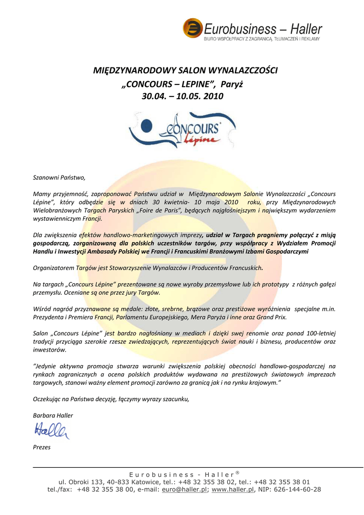 MIĘDZYNARODOWY SALON WYNALAZCZOŚCI „CONCOURS – LEPINE”, Paryż 30.04. – 10.05. 2010 Szanowni Państwo, Mamy przyjemność, zaproponować Państwu udział w Międzynarodowym Salonie Wynalazczości „Concours Lépine”, który odbędzie się w dniach 30 kwietnia- 10 maja 2010 roku, przy Międzynarodowych Wielobranżowych Targach Paryskich „Foire de Paris”, będących najgłośniejszym i największym wydarzeniem wystawienniczym Francji. Dla zwiększenia efektów handlowo-marketingowych imprezy, udział w Targach pragniemy połączyć z misją gospodarczą, zorganizowaną dla polskich uczestników targów, przy współpracy z Wydziałem Promocji Handlu i Inwestycji Ambasady Polskiej we Francji i Francuskimi Branżowymi Izbami Gospodarczymi Organizatorem Targów jest Stowarzyszenie Wynalazców i Producentów Francuskich. Na targach „Concours Lépine” prezentowane są nowe wyroby przemysłowe lub ich prototypy z różnych gałęzi przemysłu. Oceniane są one przez jury Targów. Wśród nagród przyznawane są medale: złote, srebrne, brązowe oraz prestiżowe wyróżnienia specjalne m.in. Prezydenta i Premiera Francji, Parlamentu Europejskiego, Mera Paryża i inne oraz Grand Prix. Salon „Concours Lépine” jest bardzo nagłośniony w mediach i dzięki swej renomie oraz ponad 100-letniej tradycji przyciąga szerokie rzesze zwiedzających, reprezentujących świat nauki i biznesu, producentów oraz inwestorów. ”Jedynie aktywna promocja stwarza warunki zwiększenia polskiej obecności handlowo-gospodarczej na rynkach zagranicznych a ocena polskich produktów wydawana na prestiżowych światowych imprezach targowych, stanowi ważny element promocji zarówno za granicą jak i na rynku krajowym.” Oczekując na Państwa decyzję, łączymy wyrazy szacunku, Barbara Haller Prezes Eurobusiness - Haller® ul. Obroki 133, 40-833 Katowice, tel.: +48 32 355 38 02, tel.: +48 32 355 38 01 tel./fax: +48 32 355 38 00, e-mail: [email protected]; www.haller.pl, NIP: 626-144-60-28 WARUNKI UDZIAŁU W TARGACH: Cena udziału w targach: Pełny koszt: 8700 zł netto (10614,00 zł brutto) Koszt udziału dla JBR obniżony o przewidywane dofinansowanie ze środków MNiSzW: 5 500,00 zł netto cena zgłoszenia jednego wynalazku / innowacji w Targach Concours Lepine (6710,00 zł brutto) W ramach ceny gwarantujemy organizację i obsługę wystawy w nastęującym zakresie: • • • pomoc przy opracowaniu materiałów promocyjnych, zgłoszenie do konkursu - oceny przez jury Targów Concours Lepine, wynajęcie wspólnego stoiska polskiego, wyposażenie go w podesty, stoły, krzesła, aranżację plastyczną stoiska, bufet z ciepłymi i zimnymi napojami, media, montaż i demontaż stoiska • zapewnienie ok. 3 m2 powierzchni stoiska obejmującą: platformę ekspozycyjną (1m2), ściankę ekspozycyjną (2,25 m x 0,95 m szer.), ciągi komunikacyjne, zaplecze gospodarcze, • rezerwację hotelu (koszt noclegów pokrywa Wystawca; obecność przedstawicieli firmy nie jest konieczna), • transport niewielkich eksponatów i materiałów promocyjnych (Katowice – Paryż – Katowice), • promocję wynalazku podczas Targów, obsługę językową stoiska, • akwizycja kontrahentów na rozmowy w ramach misji gospodarczej - opcja1 • opracowanie i druk posteru informacyjnego o wynalazku w oparciu o dostarczone przez wystawcę materiały informacyjne. Cena udziału nie obejmuje tłumaczenia opisu wynalazku dla jury. 800,00 zł netto - cena 1 m2 dodatkowej powierzchni ekspozycyjnej 39,90 zł netto – cena tłumaczenia 1 strony obliczeniowej (1500 znaków ze spacjami) na j. francuski lub angielski. Wynajęcie indywidualnego stoiska wymaga odrębnych uzgodnień. Karty zgłoszeniowe Kartę zgłoszeniową do udziału w Targach „Concours – Lepine” 2010 prosimy nadsyłać do dnia 29.01.2010. Po upływie tego terminu przed wysłaniem karty zgłoszeniowej prosimy o kontakt. 1 Warunkiem udziału w misji gospodarczej na zasadach promocyjnych jest oficjalne zgłoszenie udziału w targach w terminie do 29.01. 2010. Eurobusiness - Haller® ul. Obroki 133, 40-833 Katowice, tel.: +48 32 355 38 02, tel.: +48 32 355 38 01 tel./fax: +48 32 355 38 00, e-mail: [email protected]; www.haller.pl, NIP: 626-144-60-28