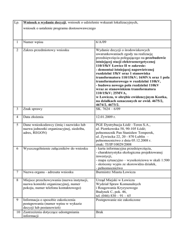 Lp. Wniosek o wydanie decyzji, wniosek o udzielenie wskazań lokalizacyjnych, wniosek o ustalenie programu dostosowawczego 1 Numer wpisu 6/A/09 2 Zakres przedmiotowy wniosku 3 Znak sprawy Wydanie decyzji o środowiskowych uwarunkowaniach zgody na realizację przedsięwzięcia polegającego na przebudowie istniejącej stacji elektroenergetycznej 110/15kV Łowicz II w zakresie: - demontaż istniejącej napowietrznej rozdzielni 15kV oraz 1 stanowiska transformatora 110/15kV; 16MVA oraz 1 pola transformatorowego w rozdzielni 110kV, - budowa nowego pola rozdzielni 110kV wraz ze stanowiskiem transformatora 110/15kV; 25MVA, w Łowiczu, w obrębie ewidencyjnym Kostka, na działkach oznaczonych nr ewid. 4675/2, 4674/2, 4673/2. SK. 7624 – 6/09 4 Data złożenia 12.01.2009 r. 5 Dane wnioskodawcy (imię i nazwisko lub nazwa jednostki organizacyjnej, siedziba, adres, REGON) 6 Wyszczególnienie załączników do wniosku 7 Nazwa organu - adresata wniosku PGE Dystrybucja Łódź –Teren S.A., ul. Piotrkowska 58, 90-105 Łódź; pełnomocnik Pan Stanisław Temperek, ul. Żywiecka 22, 20 - 870 Lublin – pełnomocnictwo z dnia 05.12.2008 r. znak: TI/IP/10029/2008 - karta informacyjna przedsięwzięcia, - charakterystyka ekologiczna projektowanej inwestycji, - mapa sytuacyjno – wysokościowa w skali 1:500 - skrócony wypis ze skorowidza działek, - pełnomocnictwo Burmistrz Miasta Łowicza 8 Miejsce przechowywania (nazwa instytucji, nazwa komórki organizacyjnej, numer pokoju, numer telefonu kontaktowego) 9 Informacja o sposobie zakończenia postępowania (numer wpisu w wykazie decyzji lub postanowień) 10 Zastrzeżenia dotyczące udostępniania informacji Urząd Miejski w Łowiczu Wydział Spraw Komunalnych i Reagowania Kryzysowego Budynek C, pok. 46, tel. (046) 830 – 91 – 65 Postępowanie nie zakończone Brak 11 Numery innych kart w wykazie, dotyczących wnioskodawcy 12 Uwagi Brak Brak Burmistrz Krzysztof Jan Kaliński
